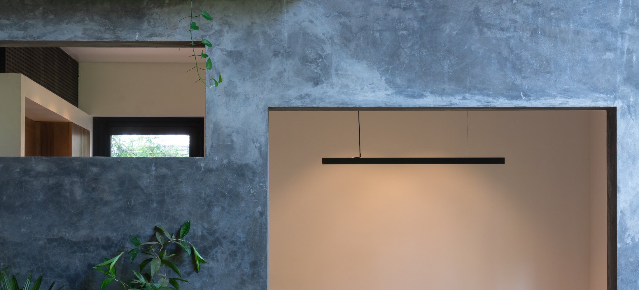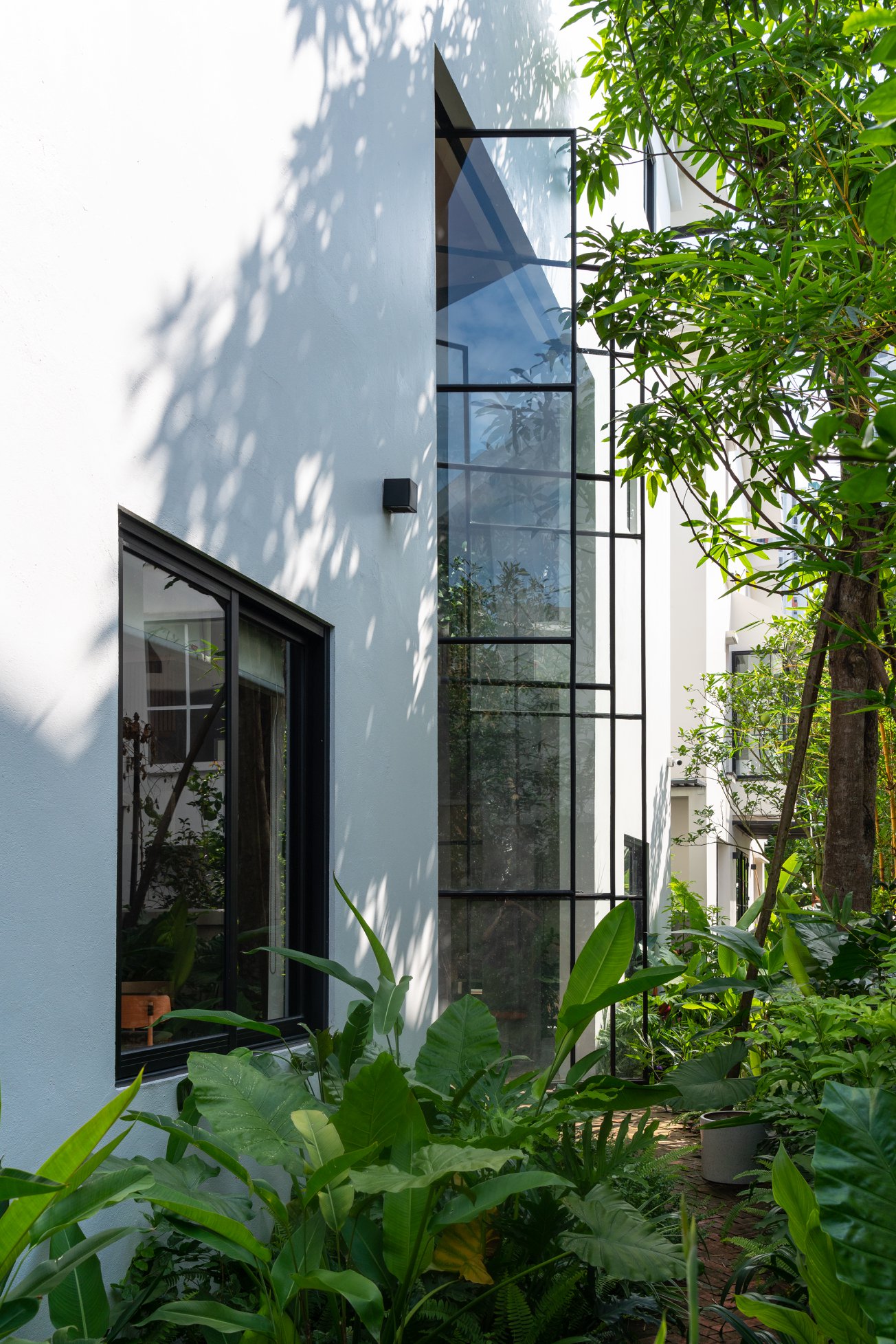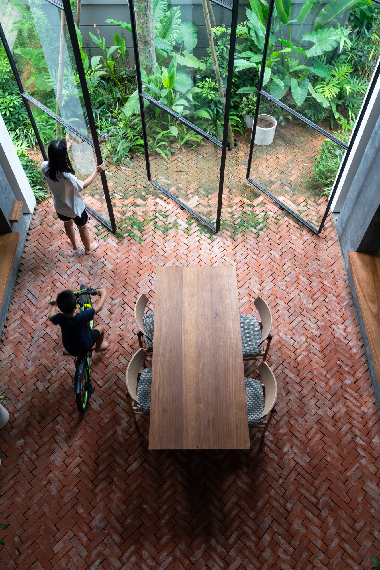 Không cửa sổ ngăn cách giữa trong phòng và khu vực ăn; hệ vách xoay linh hoạt, trong suốt giúp tạo ra một không gian sinh hoạt chung nửa trong nhà, nửa ngoài trời. Không gian này phát triển theo trục đứng bởi hai khối chức năng rõ ràng: khối phòng ngủ master và khối nhà-trẻ-con thú vị. Các chậu cây treo trên các diện tường xi măng là yếu tố kết nối mềm giữa các trục không gian. Trong khi khối ngủ của bố mẹ là một không gian tiêu chuẩn thì khối nhà-trẻ-con chứa đựng đầy đủ sự thú vị, tìm tòi, khám phá, vận động cho con trẻ.