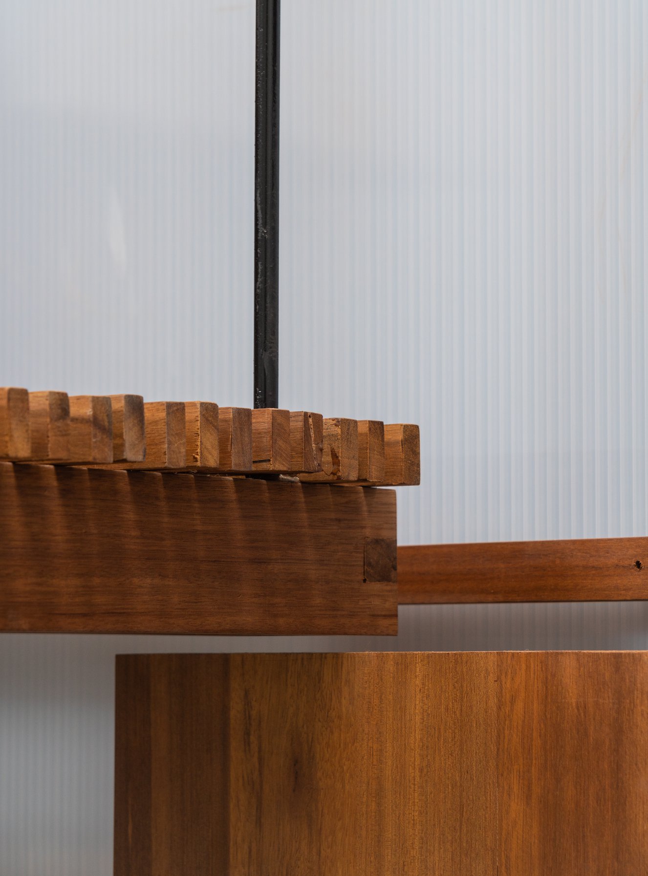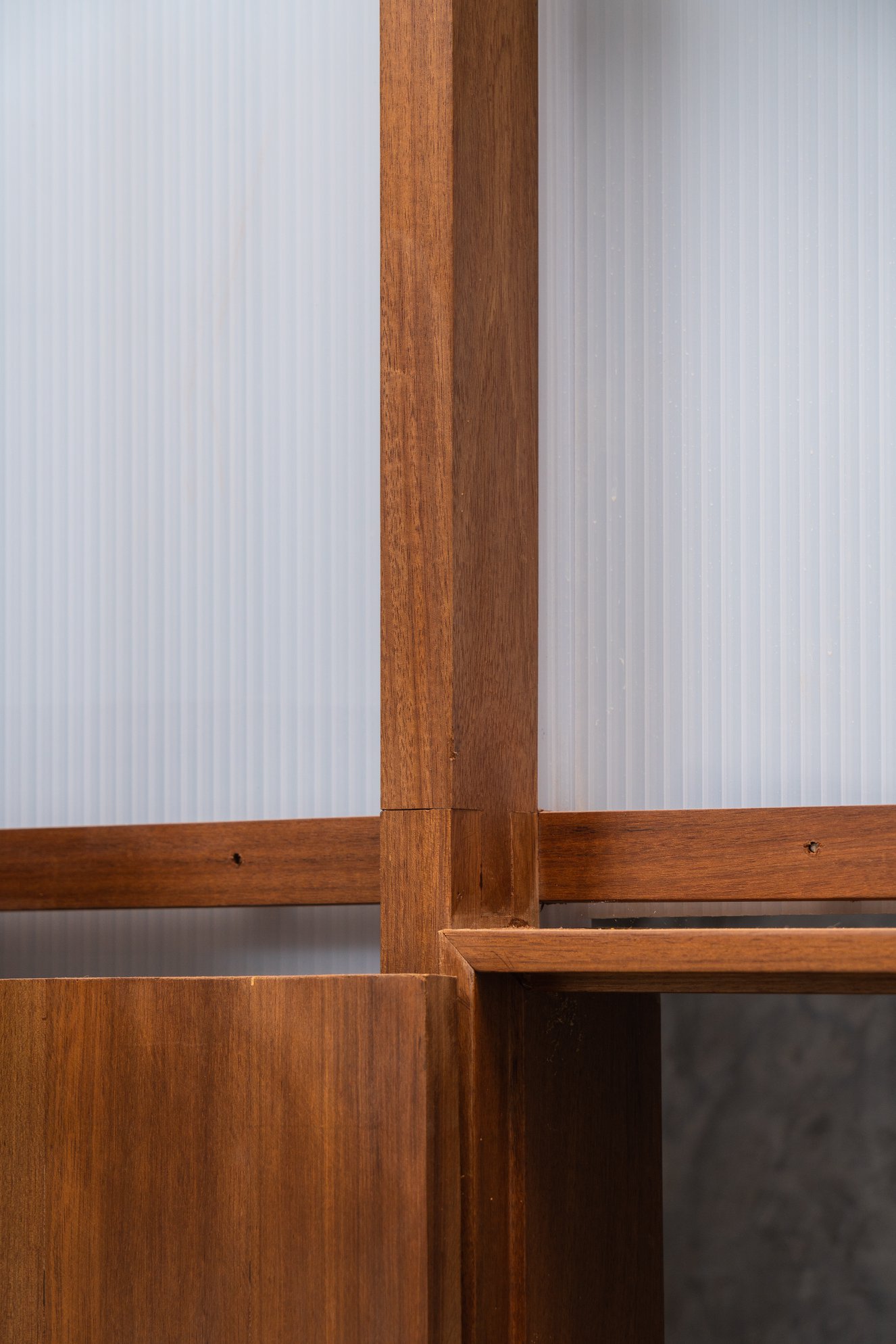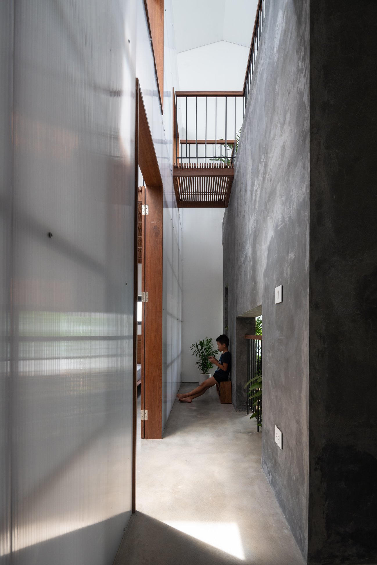 Toàn bộ sàn bê tông hiện có của khu vực này được phá bỏ, thả vào trong khoảng trống đó khối nhà nhỏ 1 trệt, 1 lửng với khung kết cấu gỗ, bao phủ vật liệu trong mờ (polycarbonate 20mm 50% xuyên sáng). Đó là không gian ngủ, học, chơi, thư viện, vệ sinh của 2 đứa trẻ. Các chức năng này được phát triển xoay quanh 1 chậu cây nhỏ được tạo bởi 4 thớt bê tông không định hình – hay có ai đó nói rằng trông như những thửa ruộng bậc thang.