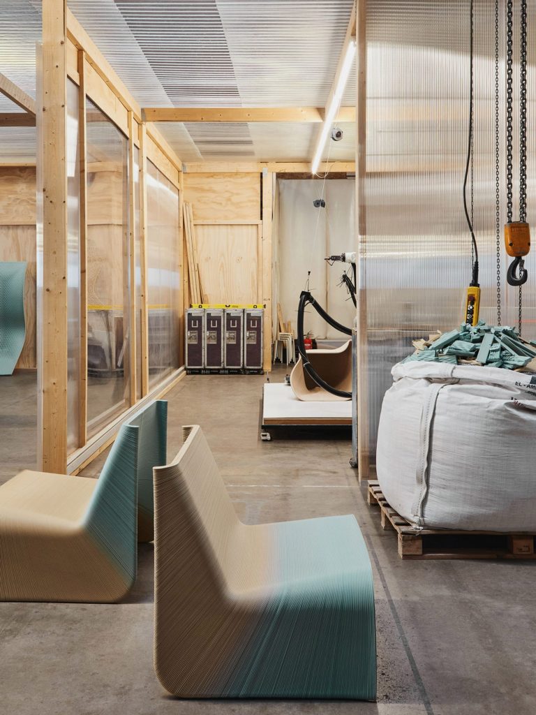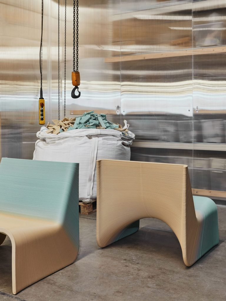 Tất cả các chất kết dính, nhựa và các trợ phẩm sử dụng trong sản xuất đồ nội thất truyền thống cho phép thiết kế có thể được dễ dàng tái chế tiếp tục sau mỗi vòng đời sản phẩm. Quá trình tạo nên vật liệu cho chiếc ghế này bắt đầu với việc xé nhỏ phế phẩm thành các hạt có kích thước từ ba đến năm milimét. Sau đó chúng được đưa trực tiếp vào máy in 3D tiên tiến của studio, làm tan chảy vật liệu để tạo ra nhựa tái chế rồi in theo lớp để tạo thành chiếc ghế Ermis.