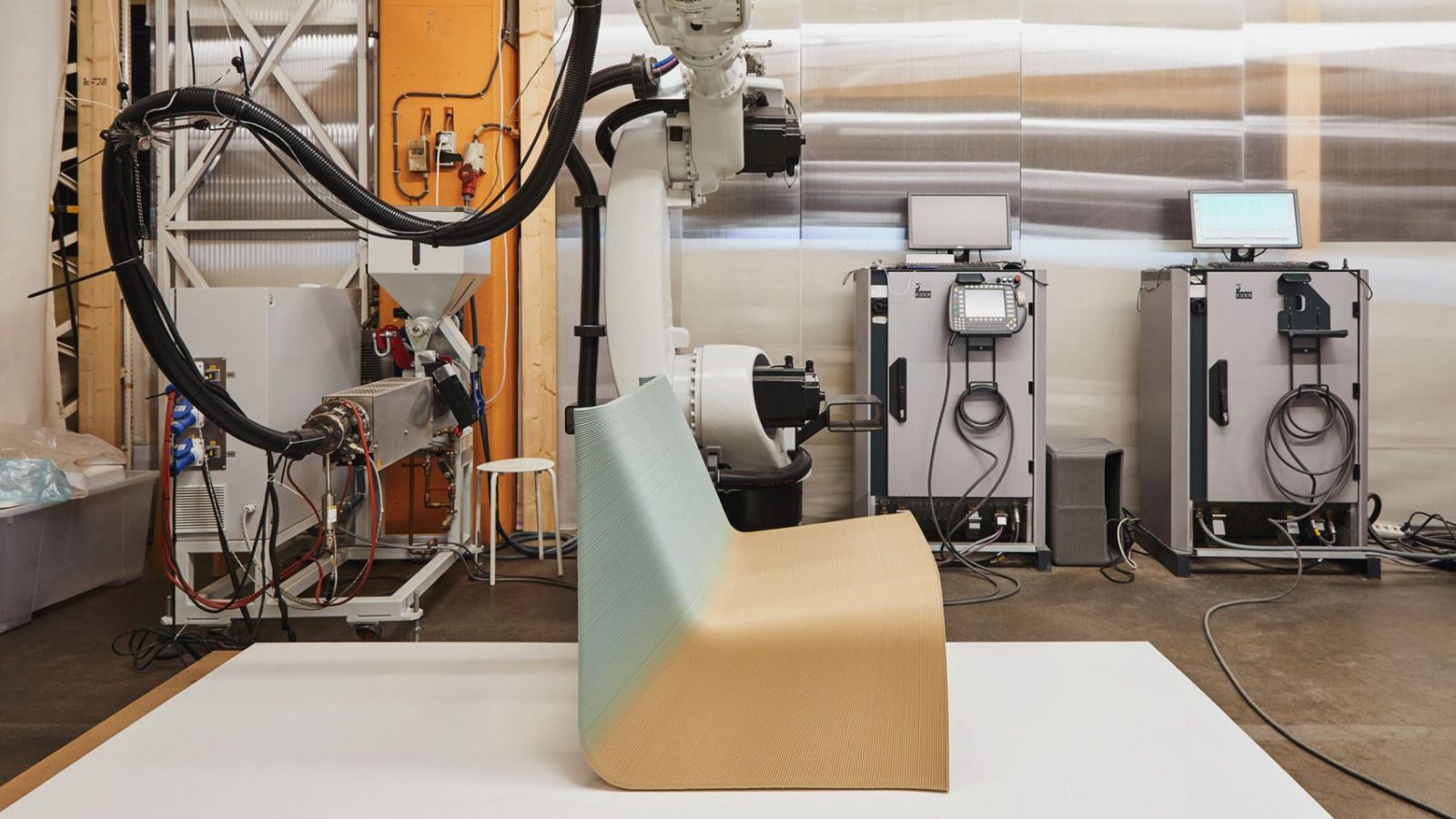 Tất cả các chất kết dính, nhựa và các trợ phẩm sử dụng trong sản xuất đồ nội thất truyền thống cho phép thiết kế có thể được dễ dàng tái chế tiếp tục sau mỗi vòng đời sản phẩm. Quá trình tạo nên vật liệu cho chiếc ghế này bắt đầu với việc xé nhỏ phế phẩm thành các hạt có kích thước từ ba đến năm milimét. Sau đó chúng được đưa trực tiếp vào máy in 3D tiên tiến của studio, làm tan chảy vật liệu để tạo ra nhựa tái chế rồi in theo lớp để tạo thành chiếc ghế Ermis.