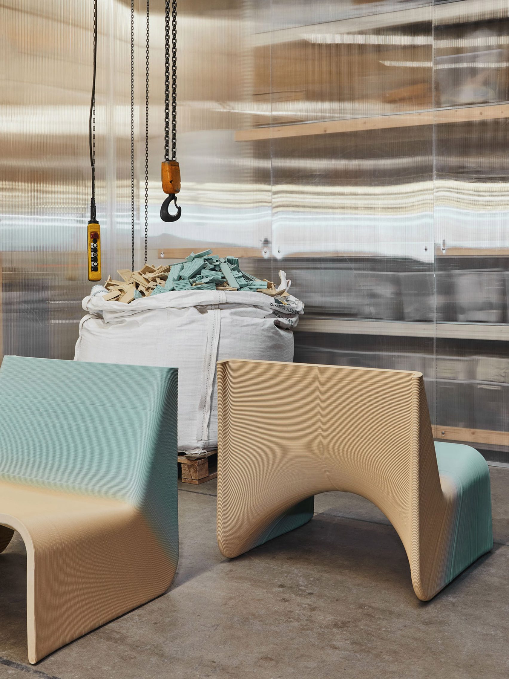 “Do đặc thù của công việc thiết kế, chúng tôi phải tạo ra rất nhiều nguyên mẫu trong nghiên cứu, và quá trình này thực sự rất lãng phí khi tạo ra rất nhiều phế phẩm”, Panos Sakkas và Foteini Setaki, đồng sáng lập của studio The New Raw chia sẻ. “Việc tìm cách tái sử dụng nguồn nguyên liệu và giảm khối lượng phế phẩm thải ra từ quá trình nghiên cứu phát triển của studio chính là lý do tại sao chúng tôi tạo ra các sản phẩm này.”