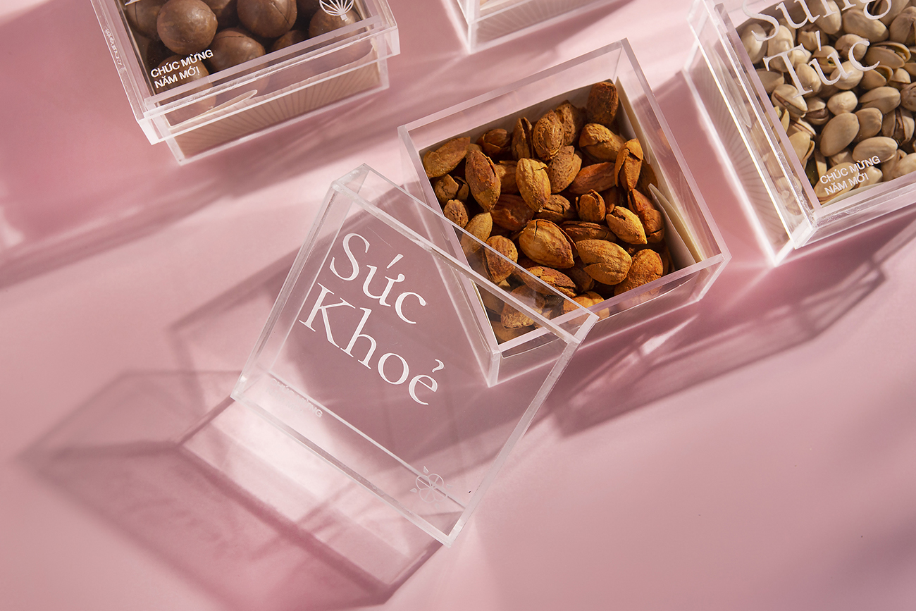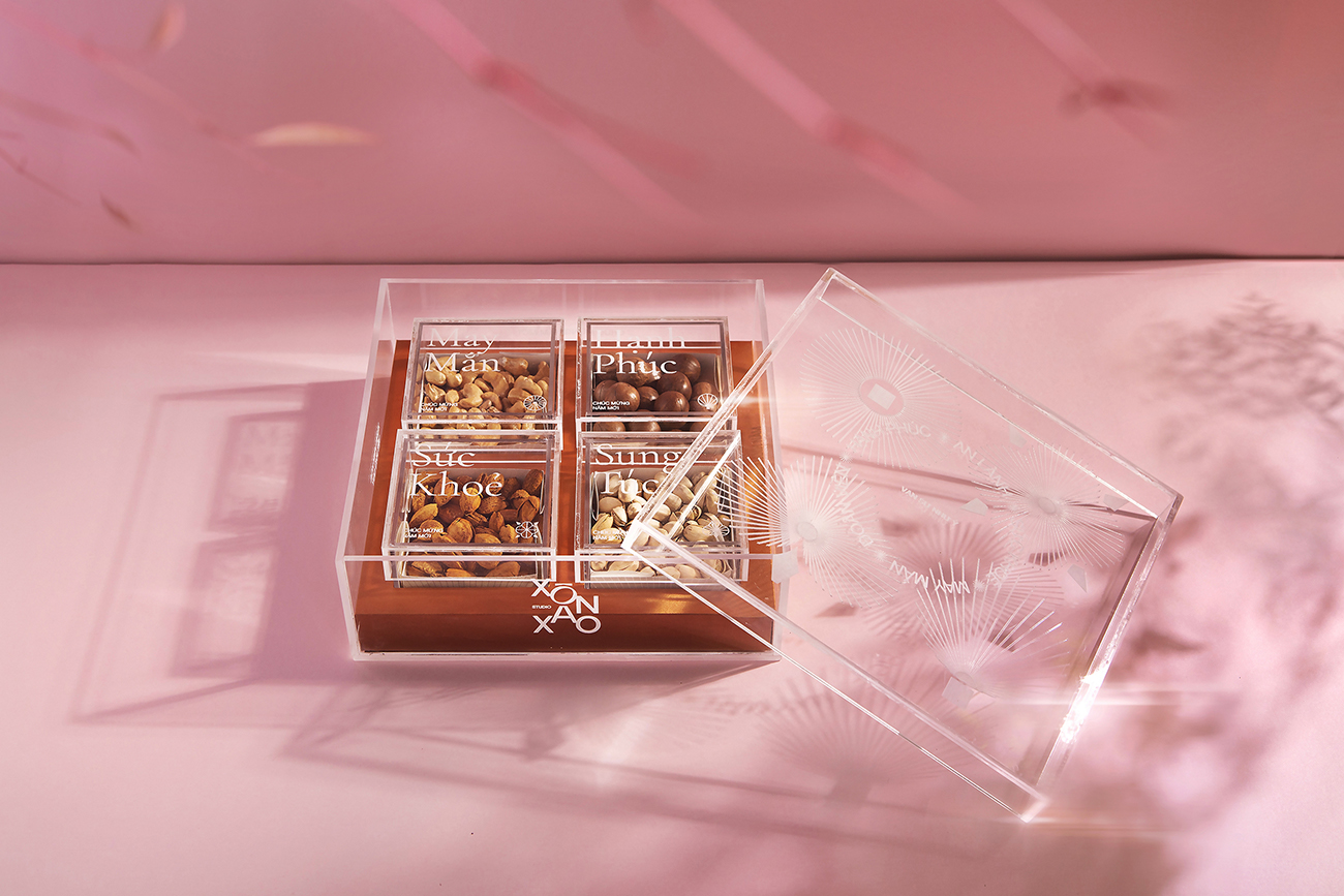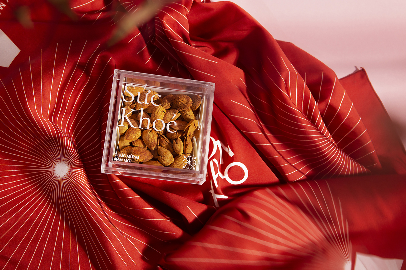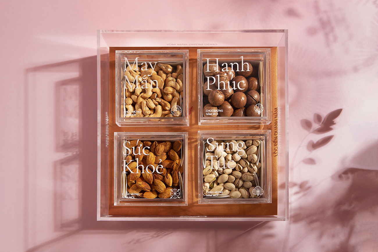 Theo truyền thống của người Việt Nam, việc có một hộp mứt để đãi khách và hoa bày quanh nhà là điều không thể thiếu trong mỗi gia đình Việt vào những ngày xuân, và đây cũng là ý tưởng chủ đạo cho hộp quà Tết này. Bằng việc sử dụng hình ảnh cách điệu hiện đại về hoa nở và lời chúc Tết làm họa tiết chính để thiết kế hộp quà, thay cho lời chúc hạnh phúc và may mắn. Ngoài ra, hộp quà này còn có giá trị cao cho sức khỏe, bên trong hộp được đặt bốn loại hạt (điều, maca, hạnh nhân và hạt dẻ cười) hoàn toàn tự nhiên và chứa nhiều chất dinh dưỡng.