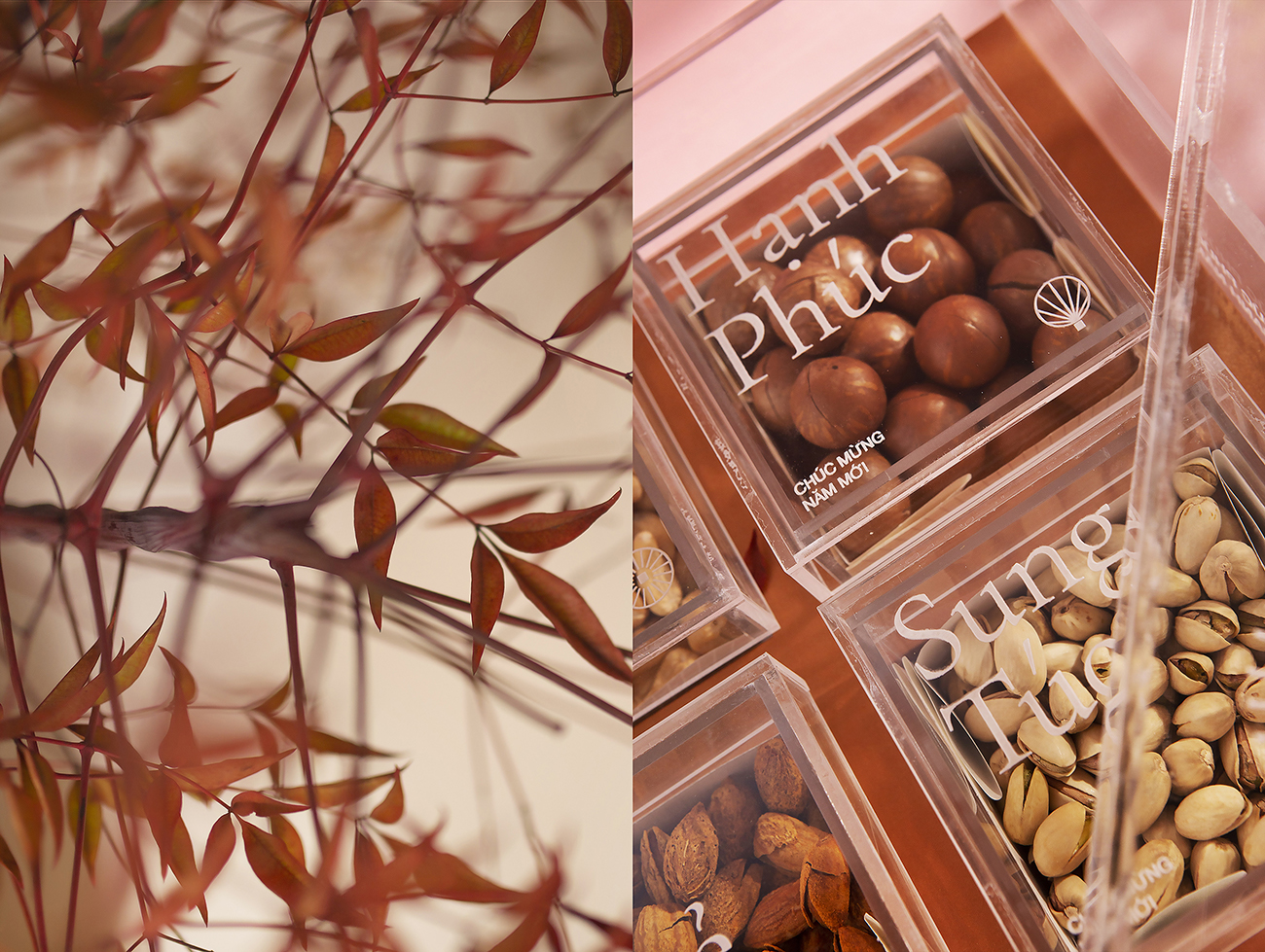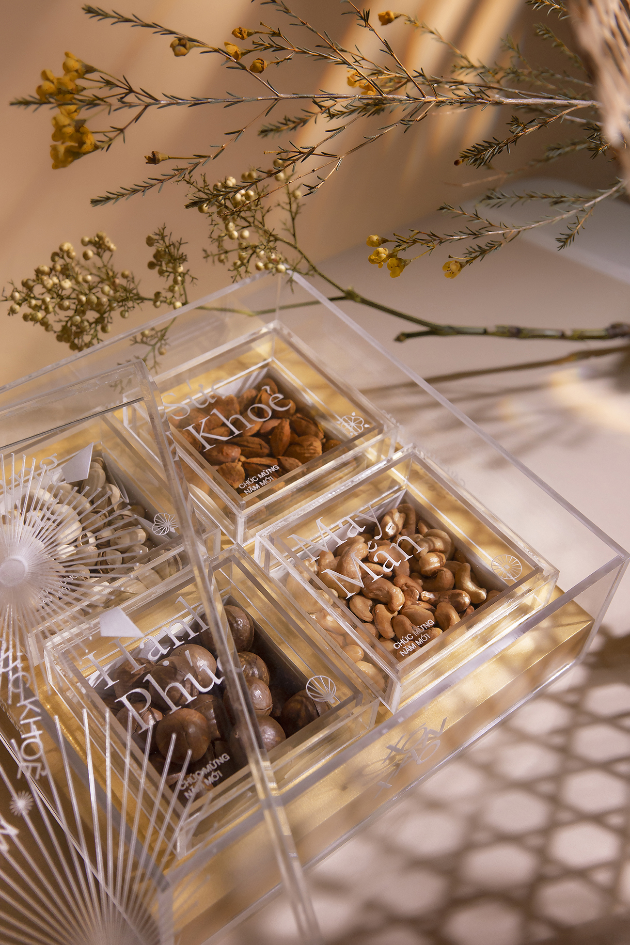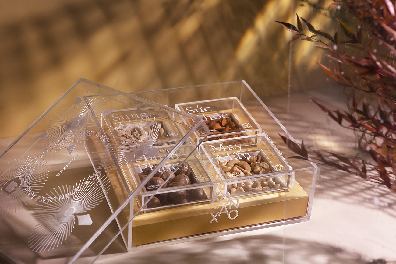 Theo truyền thống của người Việt Nam, việc có một hộp mứt để đãi khách và hoa bày quanh nhà là điều không thể thiếu trong mỗi gia đình Việt vào những ngày xuân, và đây cũng là ý tưởng chủ đạo cho hộp quà Tết này. Bằng việc sử dụng hình ảnh cách điệu hiện đại về hoa nở và lời chúc Tết làm họa tiết chính để thiết kế hộp quà, thay cho lời chúc hạnh phúc và may mắn. Ngoài ra, hộp quà này còn có giá trị cao cho sức khỏe, bên trong hộp được đặt bốn loại hạt (điều, maca, hạnh nhân và hạt dẻ cười) hoàn toàn tự nhiên và chứa nhiều chất dinh dưỡng.