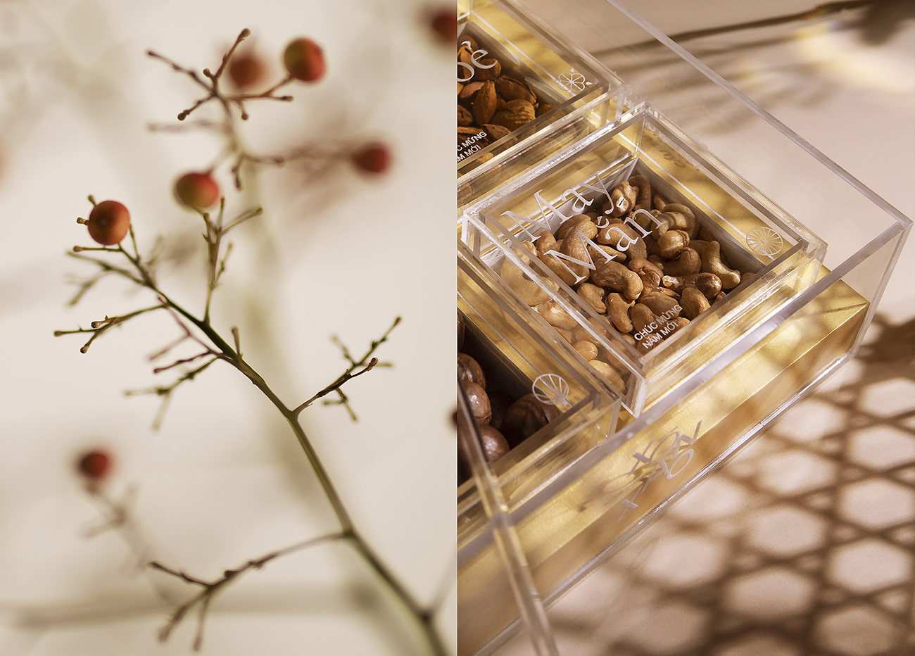 Theo truyền thống của người Việt Nam, việc có một hộp mứt để đãi khách và hoa bày quanh nhà là điều không thể thiếu trong mỗi gia đình Việt vào những ngày xuân, và đây cũng là ý tưởng chủ đạo cho hộp quà Tết này. Bằng việc sử dụng hình ảnh cách điệu hiện đại về hoa nở và lời chúc Tết làm họa tiết chính để thiết kế hộp quà, thay cho lời chúc hạnh phúc và may mắn. Ngoài ra, hộp quà này còn có giá trị cao cho sức khỏe, bên trong hộp được đặt bốn loại hạt (điều, maca, hạnh nhân và hạt dẻ cười) hoàn toàn tự nhiên và chứa nhiều chất dinh dưỡng.