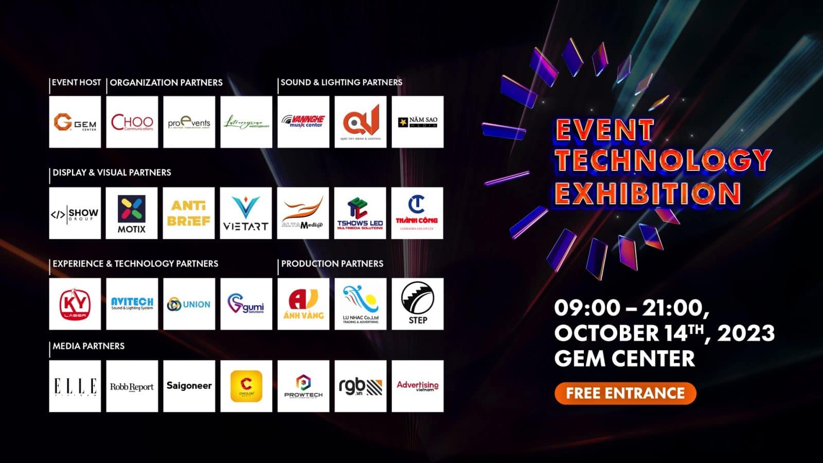 Bên cạnh GEM Center và các agency đình đám như: CHOO Communications, ProEvents, triển lãm ETE còn có sự chung tay của Lá Trường Xuân – Thương hiệu gắn liền với những sự kiện cưới xa hoa nhất Việt Nam, cùng hàng loạt tên tuổi lớn trong lĩnh vực tổ chức sự kiện như: ShowGroup, Motix, VietArt, Anti Brief Studio, Alta Media, TShows LED, Văn Nghệ Music Center, Năm Sao Media, Quốc Việt Sound & Lighting, Kỷ Laser, Lữ Nhạc, STEP, Ánh Vàng, Avitech, Union, Gumi Solutions, và Thành Công. Tất cả các đơn vị tham gia sẽ cùng phối hợp để phô diễn thiết bị, công nghệ tiên tiến nhất ngành sự kiện trong toàn bộ không gian GEM Center.