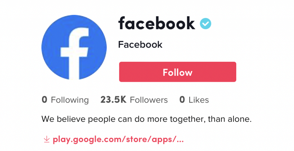 Tài khoản có dấu tick xanh này đã thu được hơn 23 ngàn người theo dõi (tính đến ngày 17/03/2022) mặc dù chưa có bất kì video nào được đăng tải. Trang TikTok của Facebook hiện chỉ hiển thị đường link liên kết đến ứng dụng Facebook trên Google Play, cùng dòng chữ “Cùng nhau chúng ta sẽ làm được nhiều hơn là một mình”.