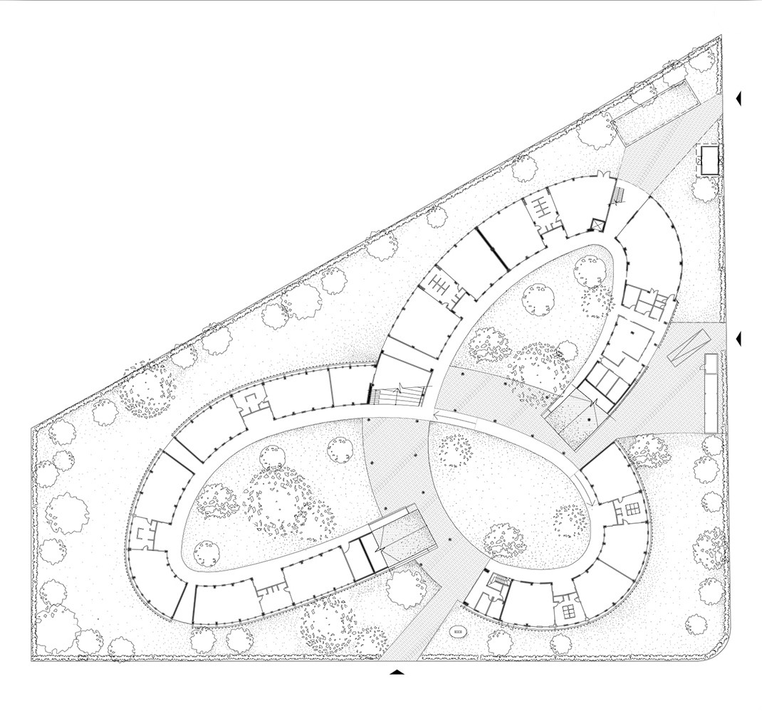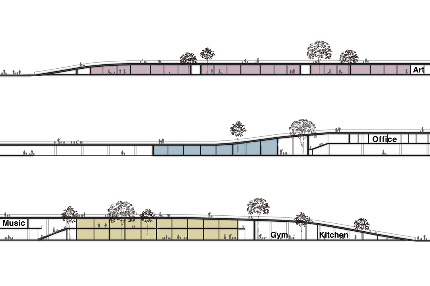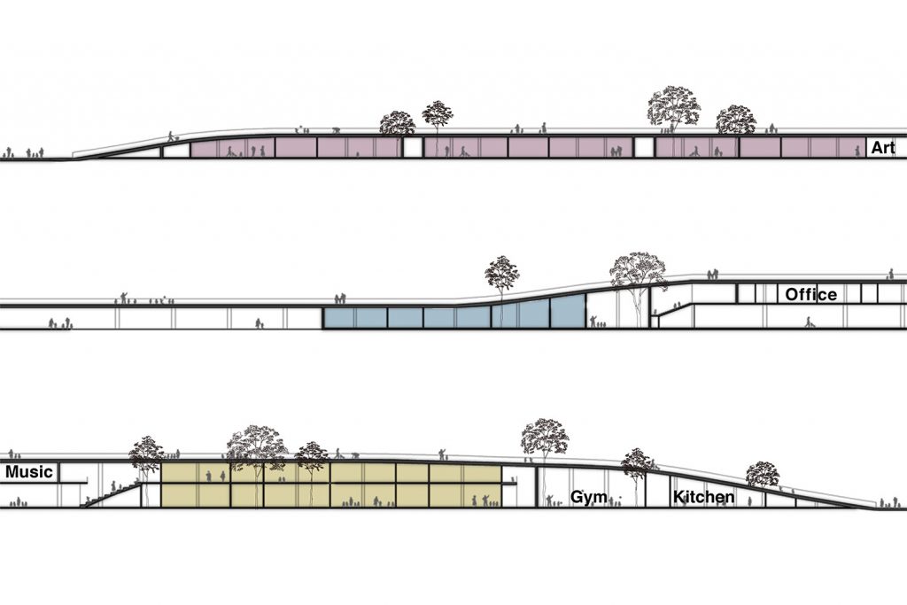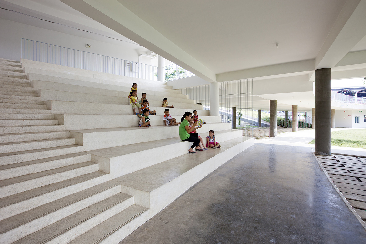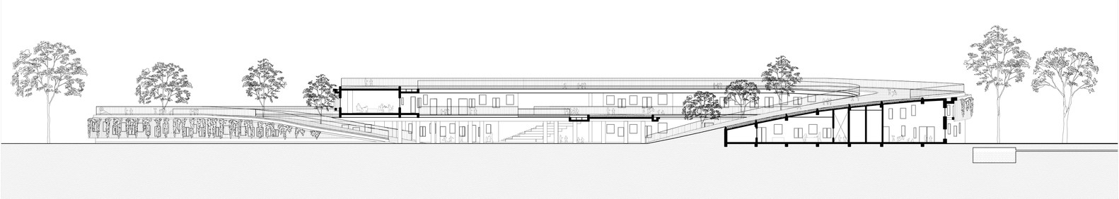 Tất cả các không gian chức năng được đáp ứng dưới mái nhà này. Mái nhà có thiết kế hạ thấp dần xuống sân, tạo thành lối đi lên trên – nơi trẻ được học về tầm quan trọng của nông nghiệp và tăng cường kết nối với thiên nhiên.
