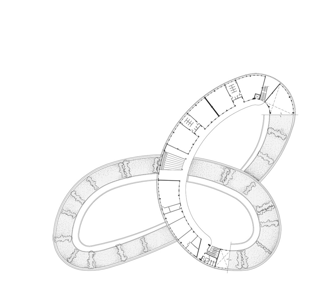 Mái nhà xanh mát của Farming Kindergarten có hình dạng như ba vòng tròn được vẽ bằng một nét đơn, bao quanh ba khu sân bên trong làm sân chơi an toàn cho trẻ. Một vườn rau thử nghiệm cũng đã được hiện thực hóa trên đỉnh của nó. Có năm loại rau khác nhau được trồng trong khu vườn rộng 200m2 để phục vụ giáo dục nông nghiệp.