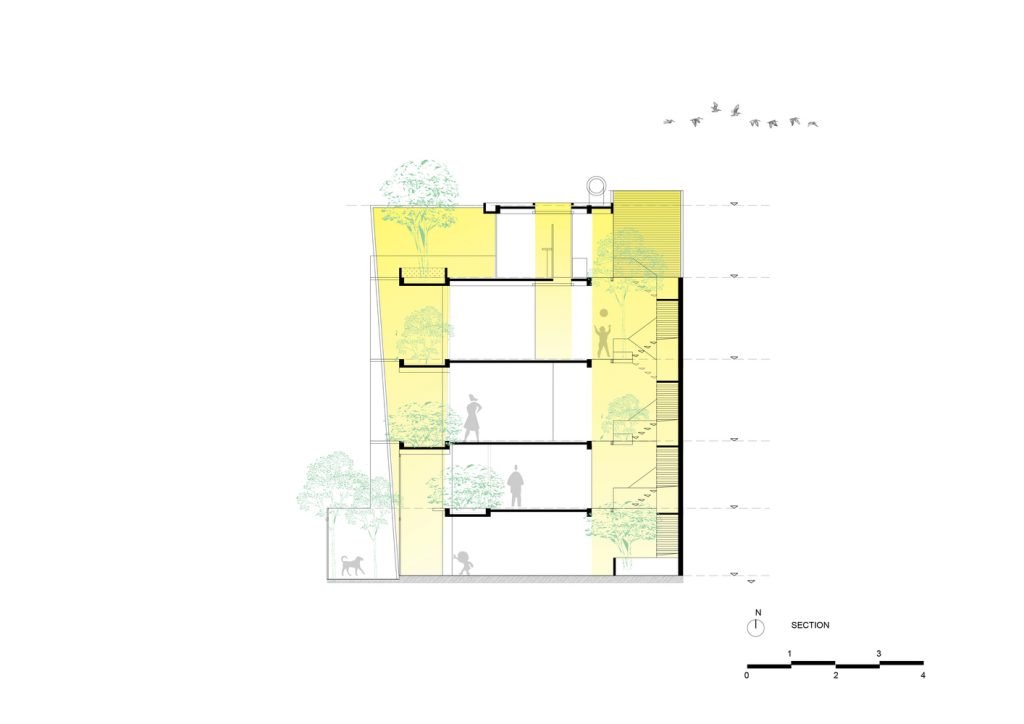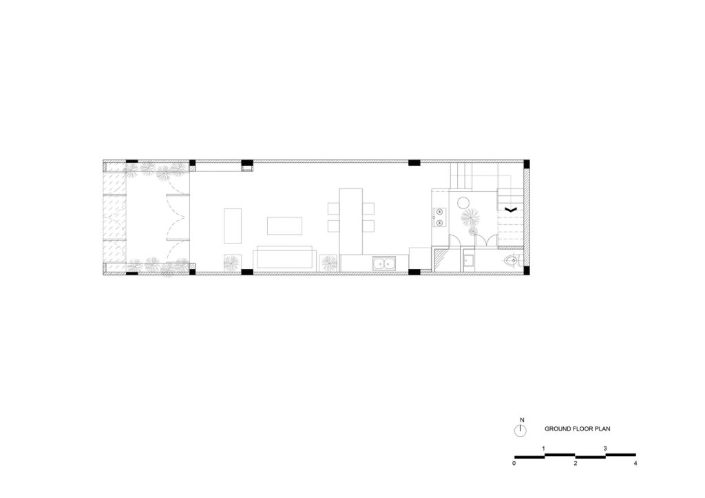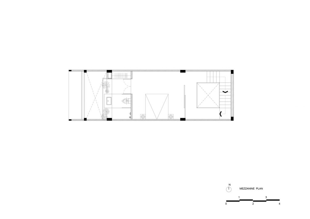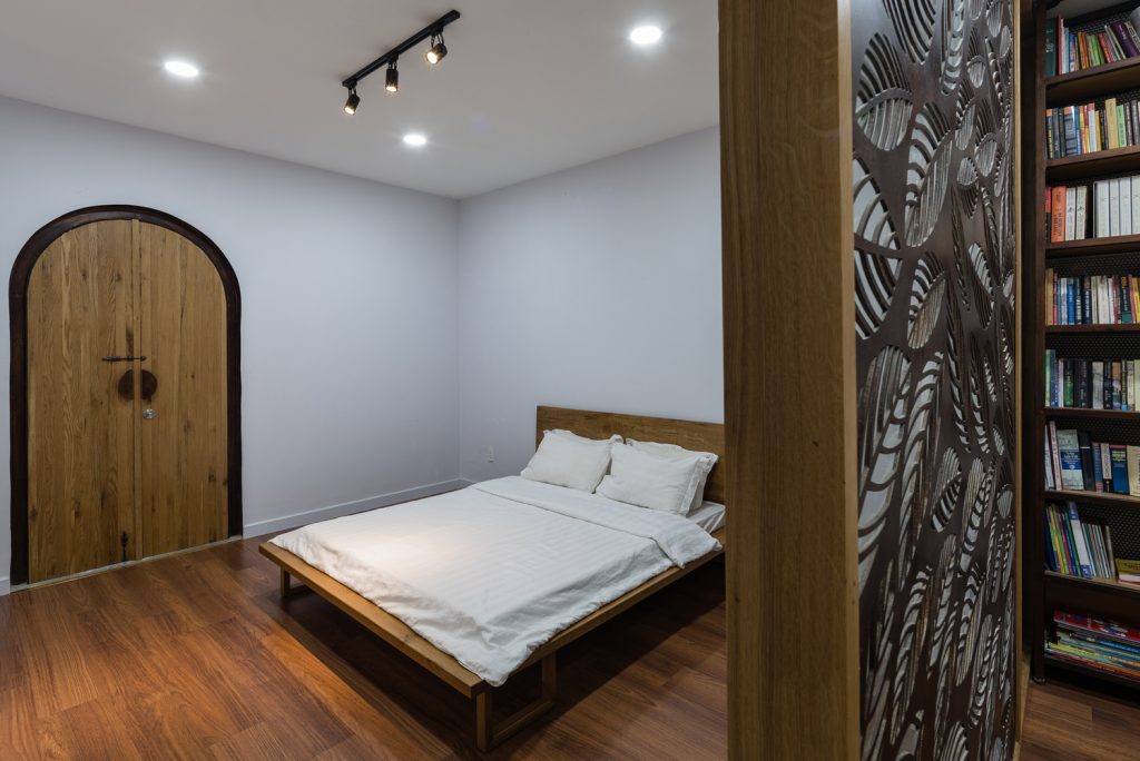 Để giải quyết những hạn chế nêu trên, đồng thời tăng cường ánh sáng và thông gió tự nhiên, nhóm KTS quyết định bỏ qua tường ngăn trong nhà, sử dụng “cây xanh” và “khoảng trống” để phân tách các không gian chức năng. Có ba khoảng trống lớn: vườn trước và vườn sau, trải dài cả ba tầng, ngăn cách giữa đường và nhà; giếng sáng trung tâm, xuyên suốt hai tầng trên, ngăn cách cơ quan gia chủ với khu nghỉ ngơi, sân vườn với nơi thờ tự.