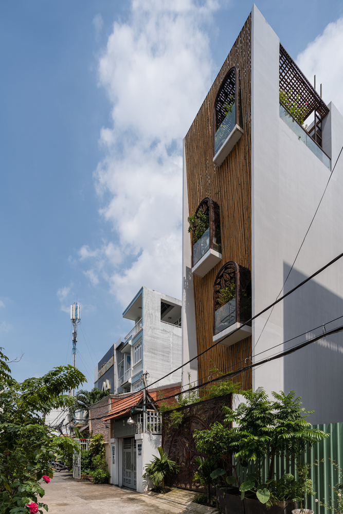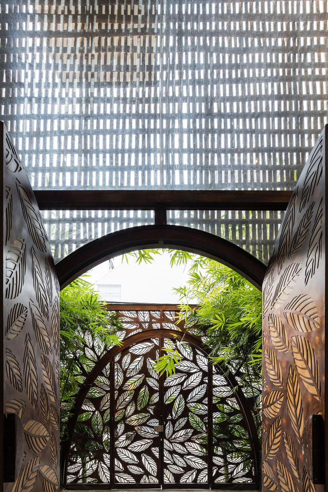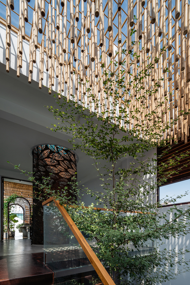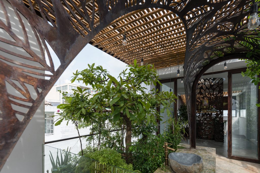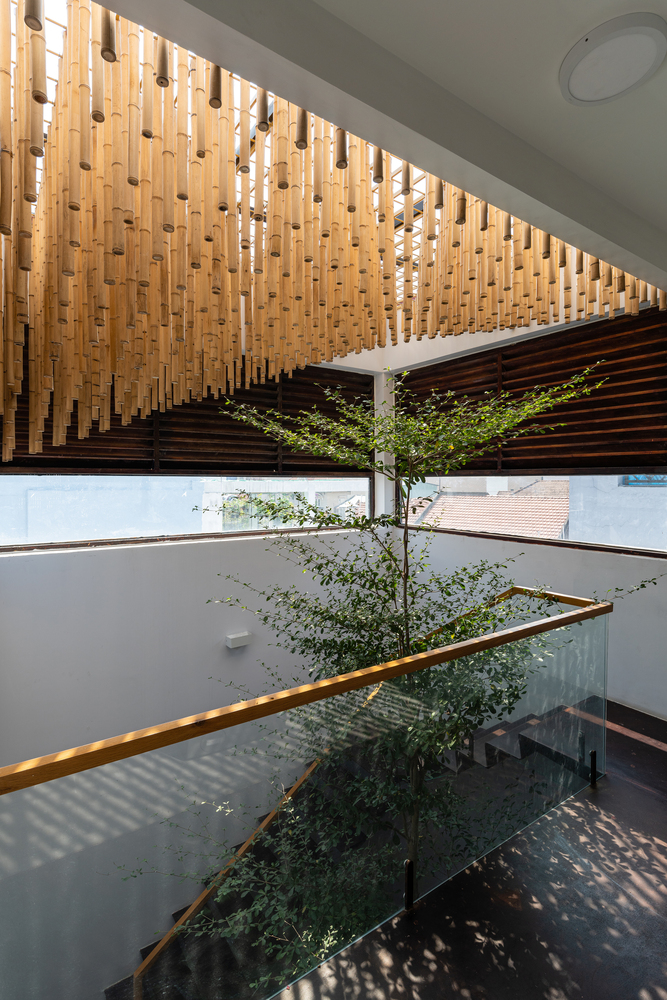 Bên cạnh đó, các nan tre đan cho phép thông gió tự nhiên. Tấm mành tre này cuộn lại để che nắng cho sân thượng. Thanh chắn gió bằng sắt CNC với những hình cắt lá, một phiên bản cách điệu của tấm chắn gió truyền thống (bình phong), có chức năng như một thiết bị đối lưu ánh sáng và không khí. Sắt CNC còn được dùng làm lam che nắng ban công, cửa cổng ra vào. Chúng hoàn toàn tạo ra cảm giác ngôi nhà như một tổng thể mở, kết nối. Trần tre ở giếng trời sân sau, ngay cầu thang, được tạo nên từ những thanh tre thẳng đứng. Điều này cho phép kết nối trực quan với mặt tiền đồng thời đóng vai trò che nắng. Nó cũng cho phép ánh sáng đi qua, tạo ra không chỉ những mảng tối thú vị mà còn tạo ra những âm thanh vui tai như chuông gió treo trong vườn.
