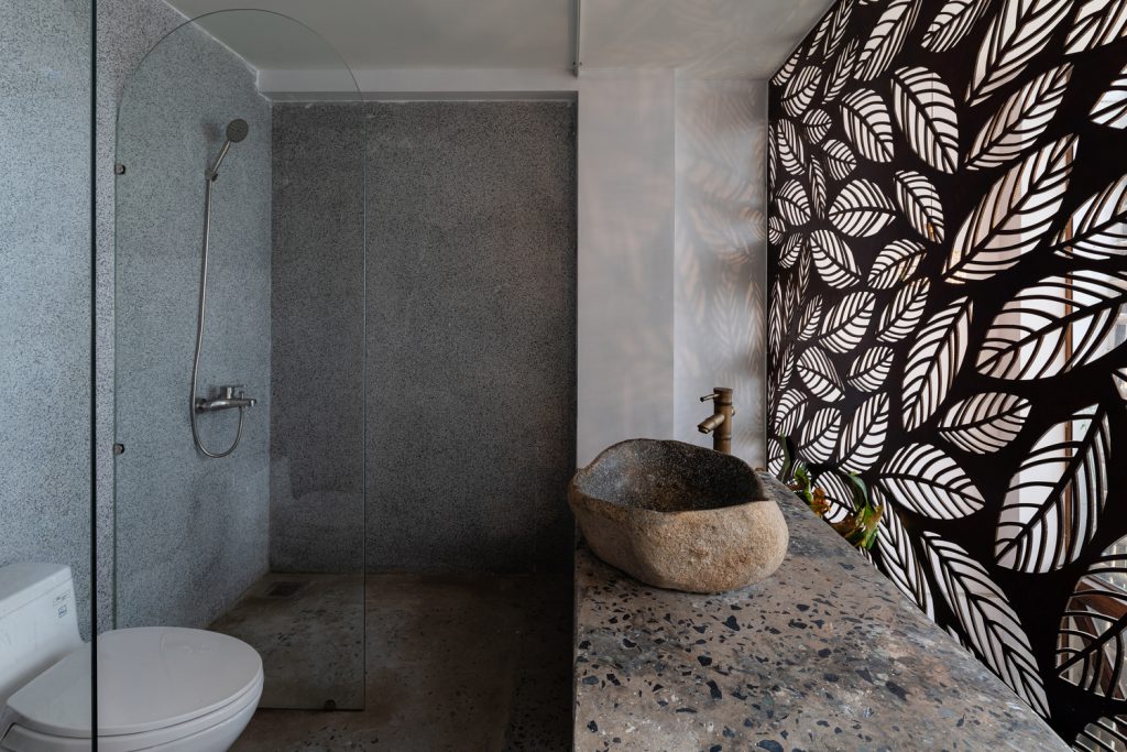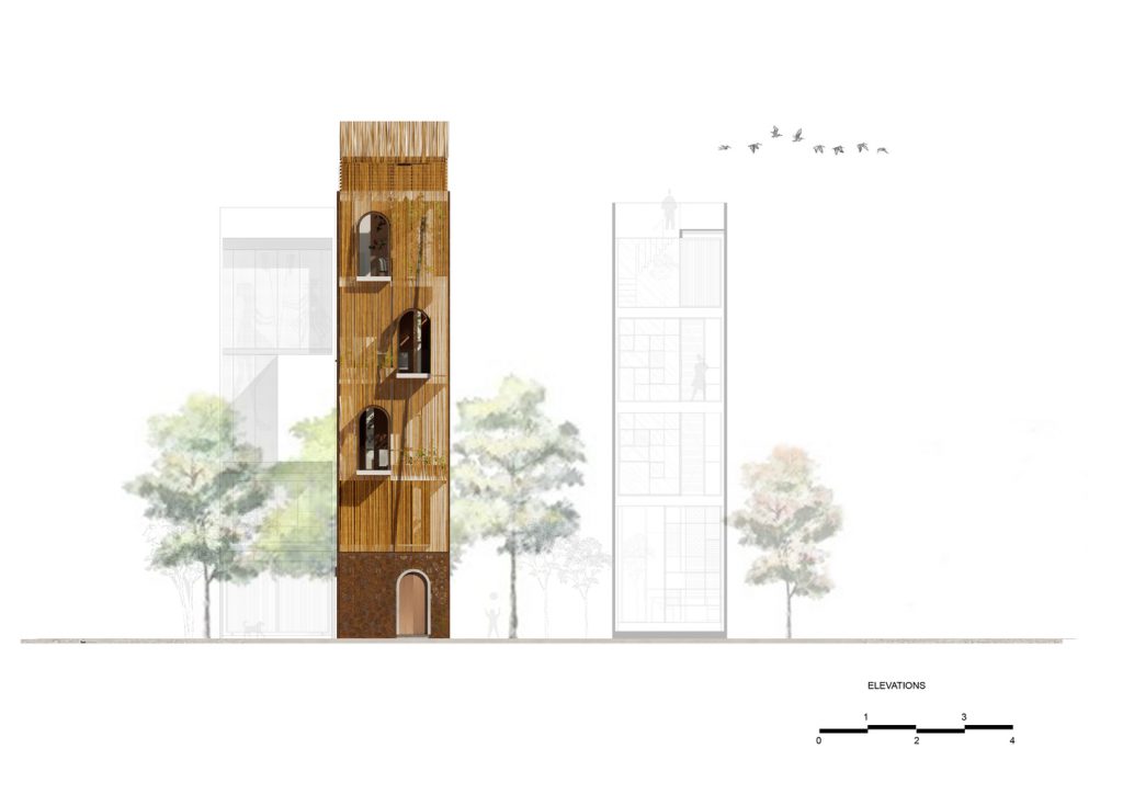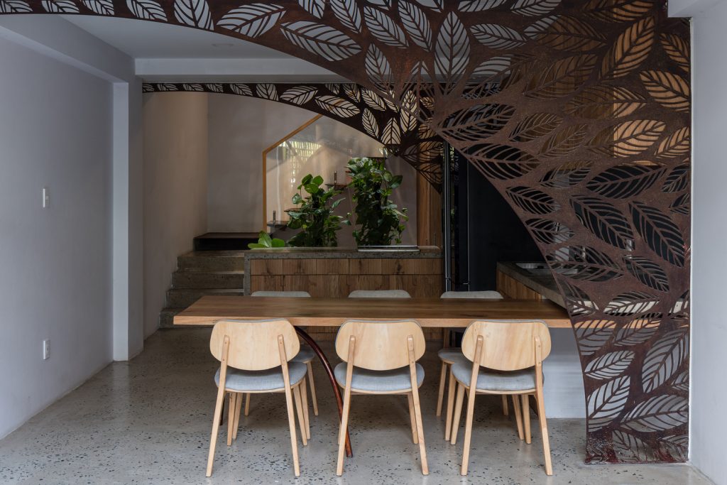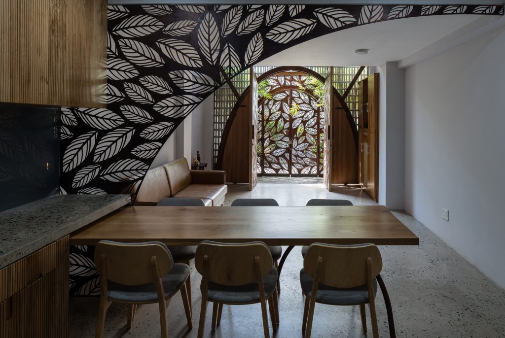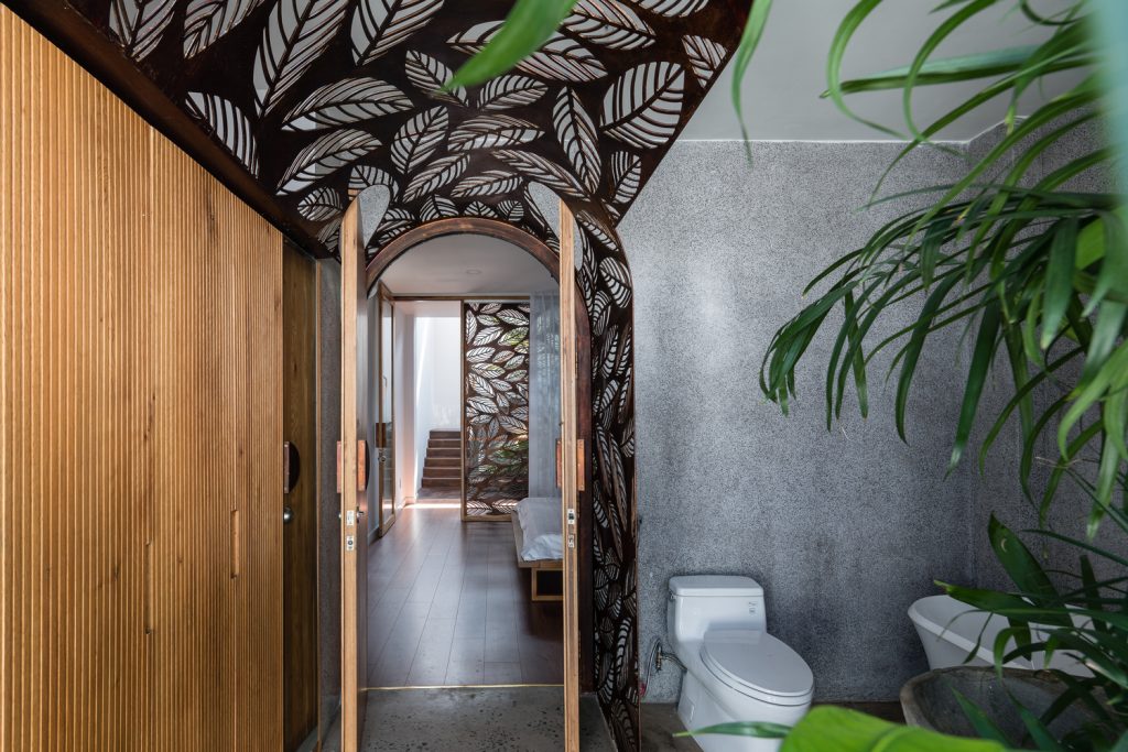 Bên cạnh đó, các nan tre đan cho phép thông gió tự nhiên. Tấm mành tre này cuộn lại để che nắng cho sân thượng. Thanh chắn gió bằng sắt CNC với những hình cắt lá, một phiên bản cách điệu của tấm chắn gió truyền thống (bình phong), có chức năng như một thiết bị đối lưu ánh sáng và không khí. Sắt CNC còn được dùng làm lam che nắng ban công, cửa cổng ra vào. Chúng hoàn toàn tạo ra cảm giác ngôi nhà như một tổng thể mở, kết nối. Trần tre ở giếng trời sân sau, ngay cầu thang, được tạo nên từ những thanh tre thẳng đứng. Điều này cho phép kết nối trực quan với mặt tiền đồng thời đóng vai trò che nắng. Nó cũng cho phép ánh sáng đi qua, tạo ra không chỉ những mảng tối thú vị mà còn tạo ra những âm thanh vui tai như chuông gió treo trong vườn.