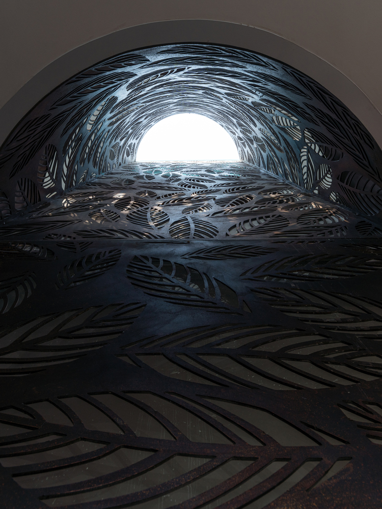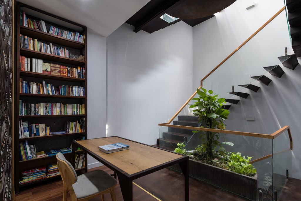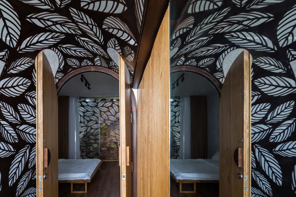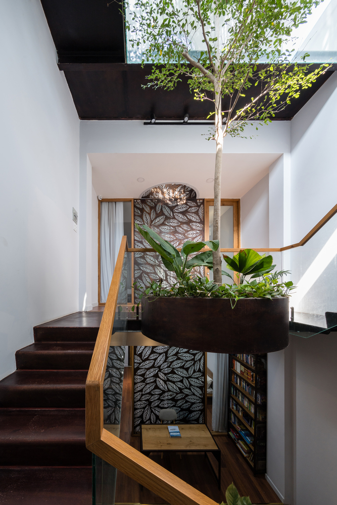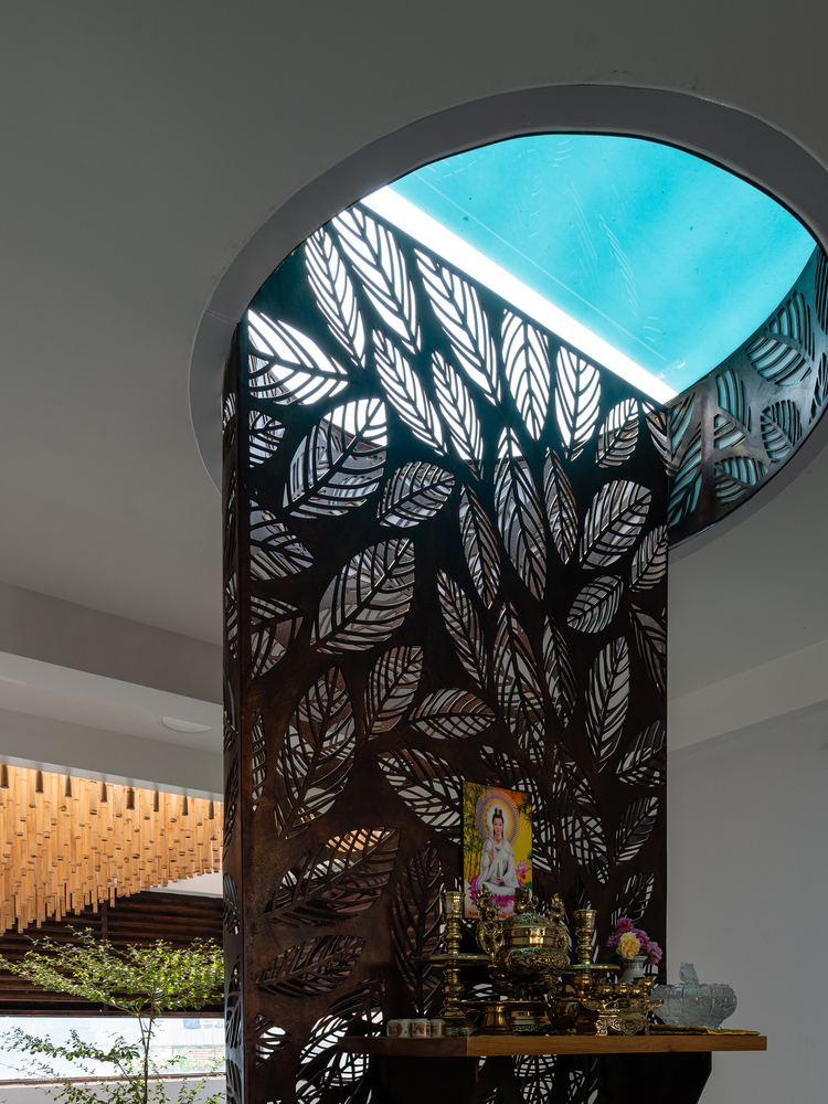 Sắt tấm mỏng được sử dụng cho các thành phần kiến trúc thường được xây bằng bê tông như cầu thang, chậu cây, ban công, lam che nắng nhằm giảm trọng lượng kết cấu. Hơn nữa, chúng được thiết kế để trông giống như được treo tự do trên không trung. Vật liệu này cũng được sử dụng làm phông nền cho khu vực thờ cúng – không gian quan trọng nhất của ngôi nhà, kéo dài xuống tầng dưới và trở thành không gian thiền định.