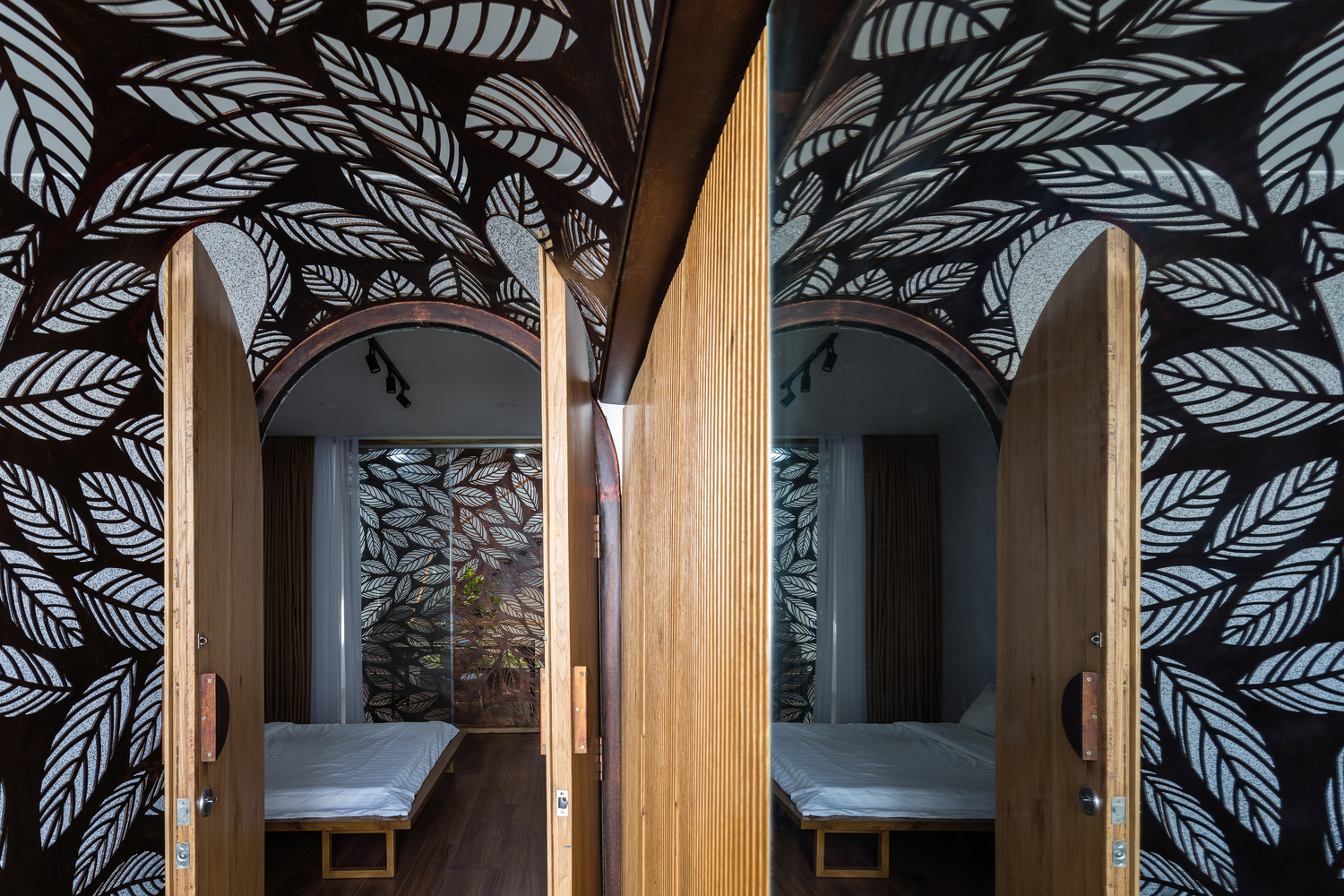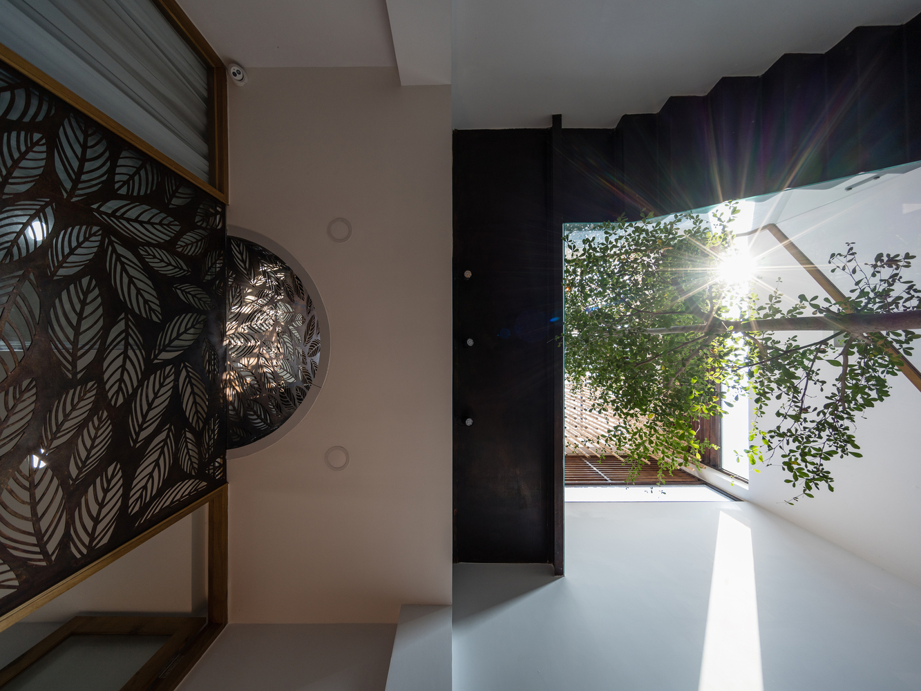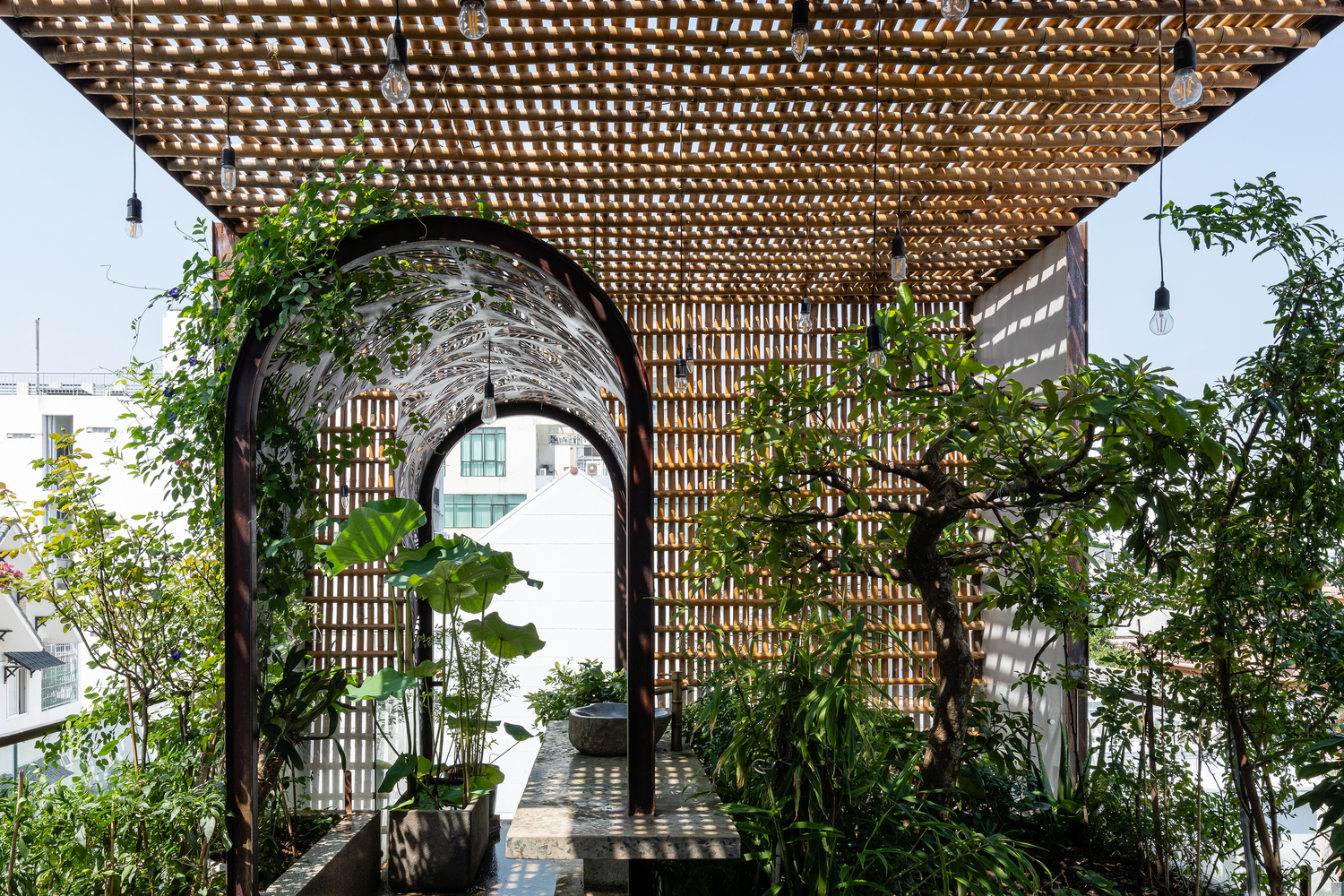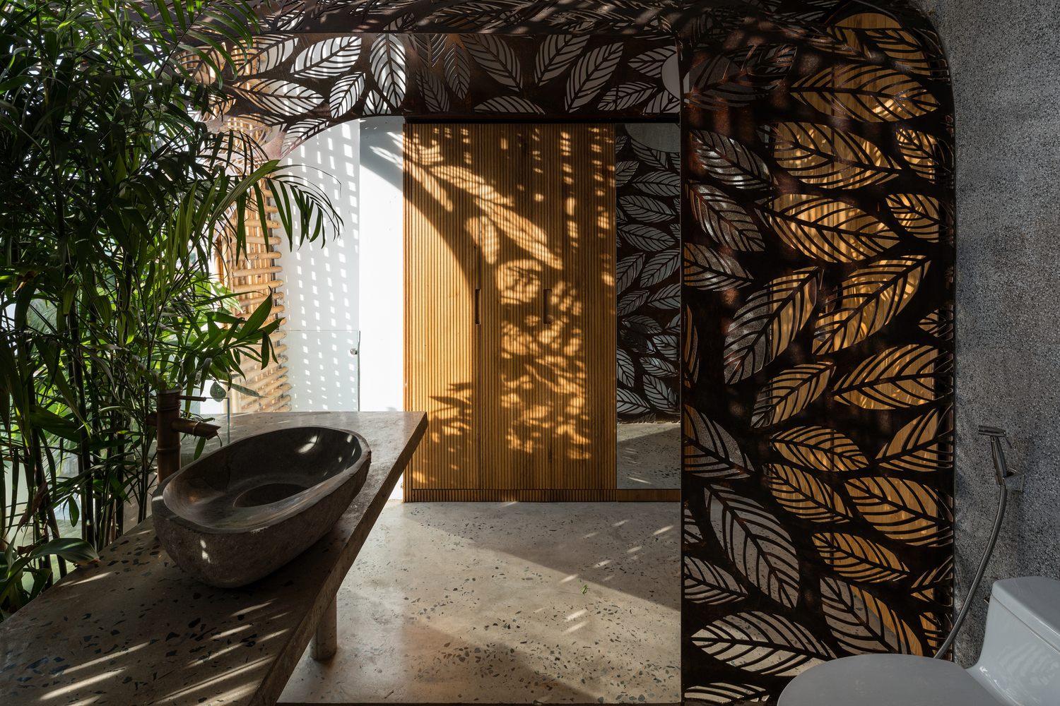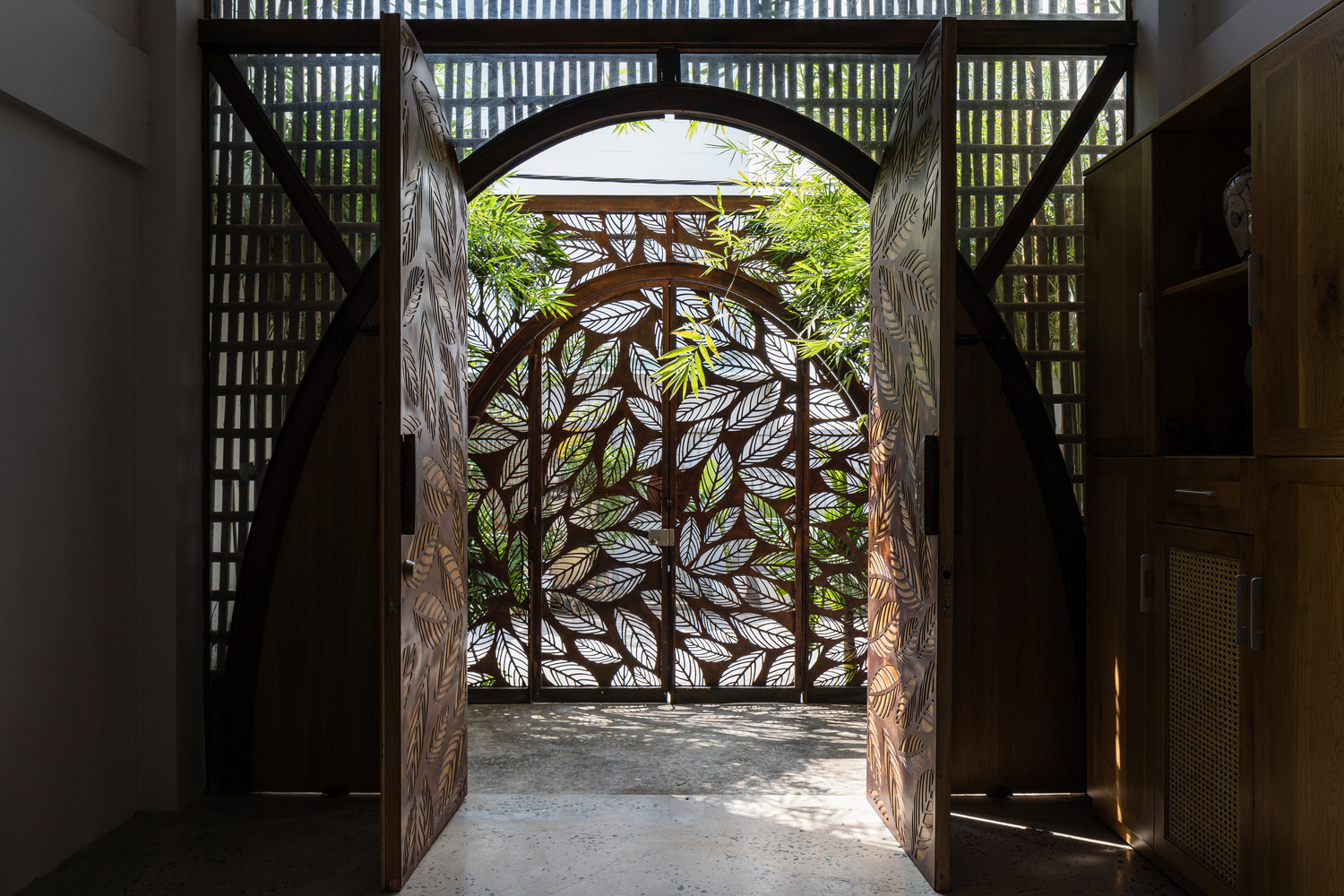 Bên cạnh đó, các nan tre đan cho phép thông gió tự nhiên. Tấm mành tre này cuộn lại để che nắng cho sân thượng. Thanh chắn gió bằng sắt CNC với những hình cắt lá, một phiên bản cách điệu của tấm chắn gió truyền thống (bình phong), có chức năng như một thiết bị đối lưu ánh sáng và không khí. Sắt CNC còn được dùng làm lam che nắng ban công, cửa cổng ra vào. Chúng hoàn toàn tạo ra cảm giác ngôi nhà như một tổng thể mở, kết nối. Trần tre ở giếng trời sân sau, ngay cầu thang, được tạo nên từ những thanh tre thẳng đứng. Điều này cho phép kết nối trực quan với mặt tiền đồng thời đóng vai trò che nắng. Nó cũng cho phép ánh sáng đi qua, tạo ra không chỉ những mảng tối thú vị mà còn tạo ra những âm thanh vui tai như chuông gió treo trong vườn.