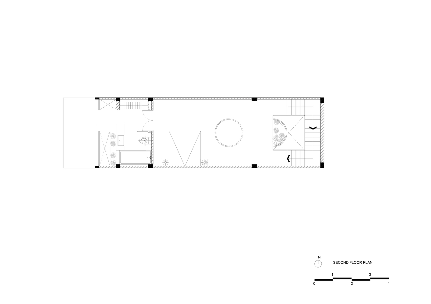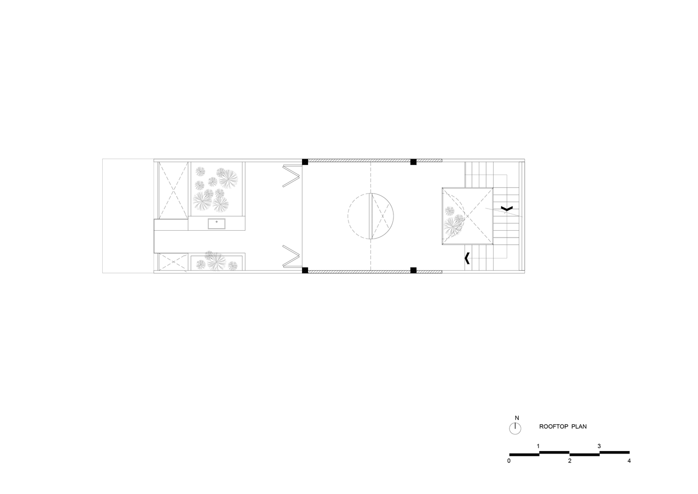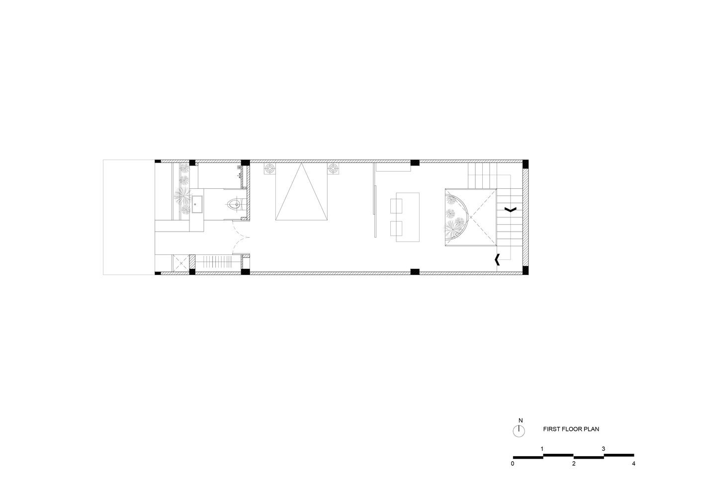 Để giải quyết những hạn chế nêu trên, đồng thời tăng cường ánh sáng và thông gió tự nhiên, nhóm KTS quyết định bỏ qua tường ngăn trong nhà, sử dụng “cây xanh” và “khoảng trống” để phân tách các không gian chức năng. Có ba khoảng trống lớn: vườn trước và vườn sau, trải dài cả ba tầng, ngăn cách giữa đường và nhà; giếng sáng trung tâm, xuyên suốt hai tầng trên, ngăn cách cơ quan gia chủ với khu nghỉ ngơi, sân vườn với nơi thờ tự.