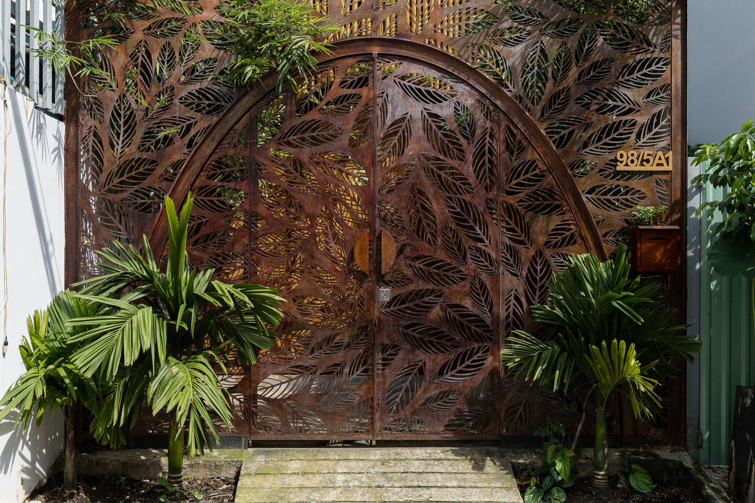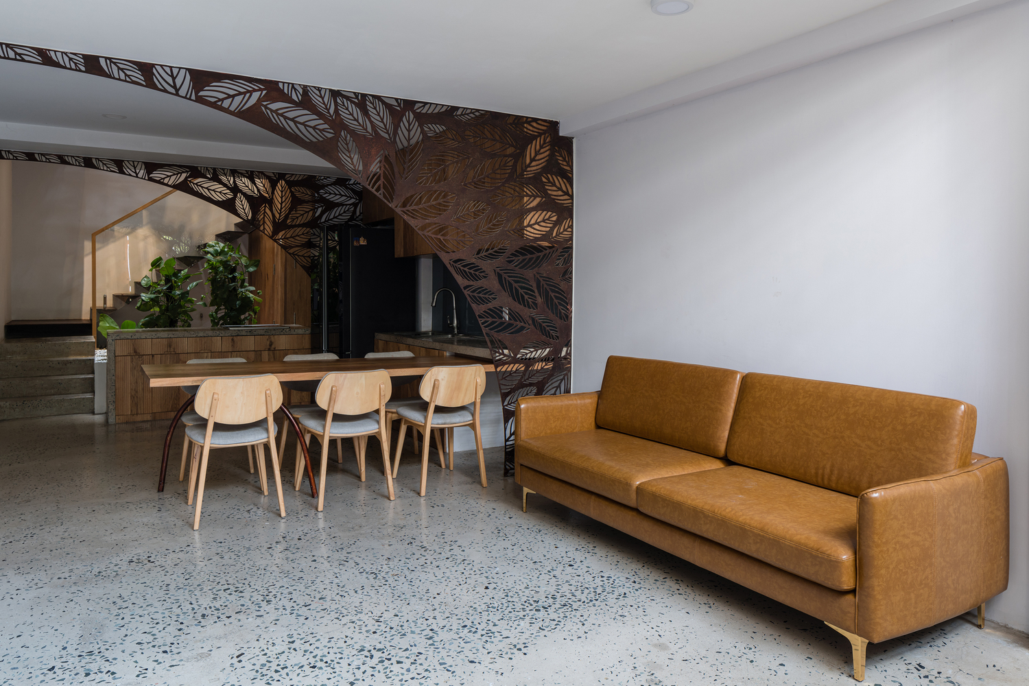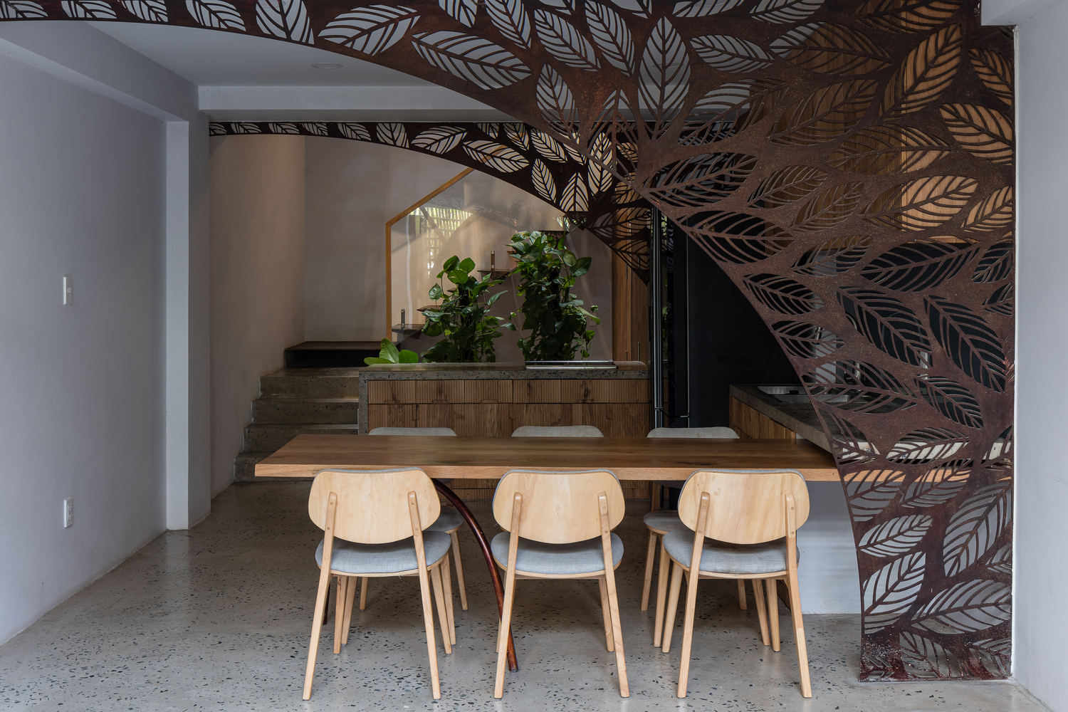 Sắt tấm mỏng được sử dụng cho các thành phần kiến trúc thường được xây bằng bê tông như cầu thang, chậu cây, ban công, lam che nắng nhằm giảm trọng lượng kết cấu. Hơn nữa, chúng được thiết kế để trông giống như được treo tự do trên không trung. Vật liệu này cũng được sử dụng làm phông nền cho khu vực thờ cúng – không gian quan trọng nhất của ngôi nhà, kéo dài xuống tầng dưới và trở thành không gian thiền định.