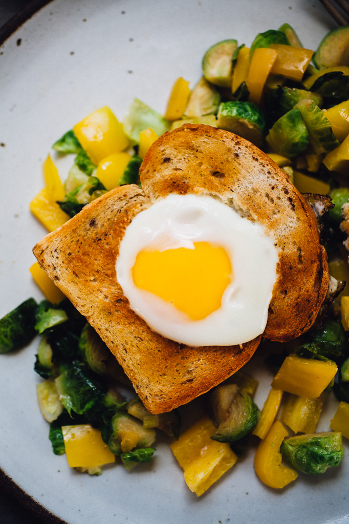 Egg in a Basket with Miso Butter Brussels Sprouts