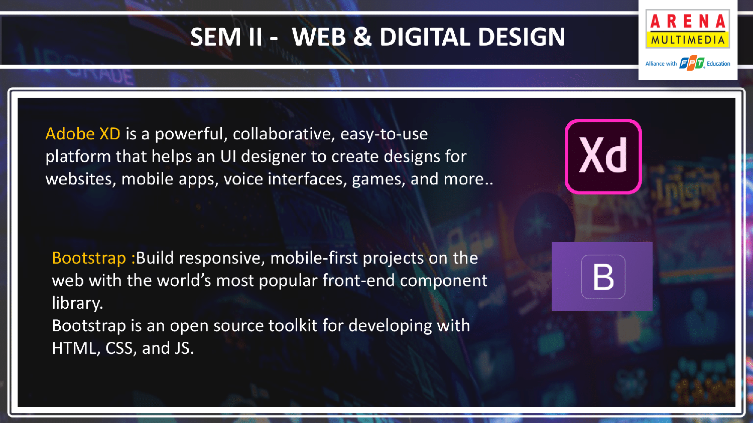 Sinh viên sẽ có nhiều giờ học hơn cho mảng thiết kế UI, UX. Sắp tới sẽ cập nhật phần mềm Adobe XD: công cụ mới của Adobe dành cho dân chuyên ngành UI, UX. Được sản xuất và phát triển bởi hãng Adobe – đây là phần mềm chuyên dụng giúp bạn dễ dàng thiết kế giao diện (UI) và tương tác (UX) cho website, app. Adobe XD còn có khả năng kết nối với nhiều phần mềm như Photoshop, After Effects ….Mặc dù mới chỉ ra mắt trong thời gian ngắn nhưng XD lại được làng thiết kế rất ưa chuộng vì: