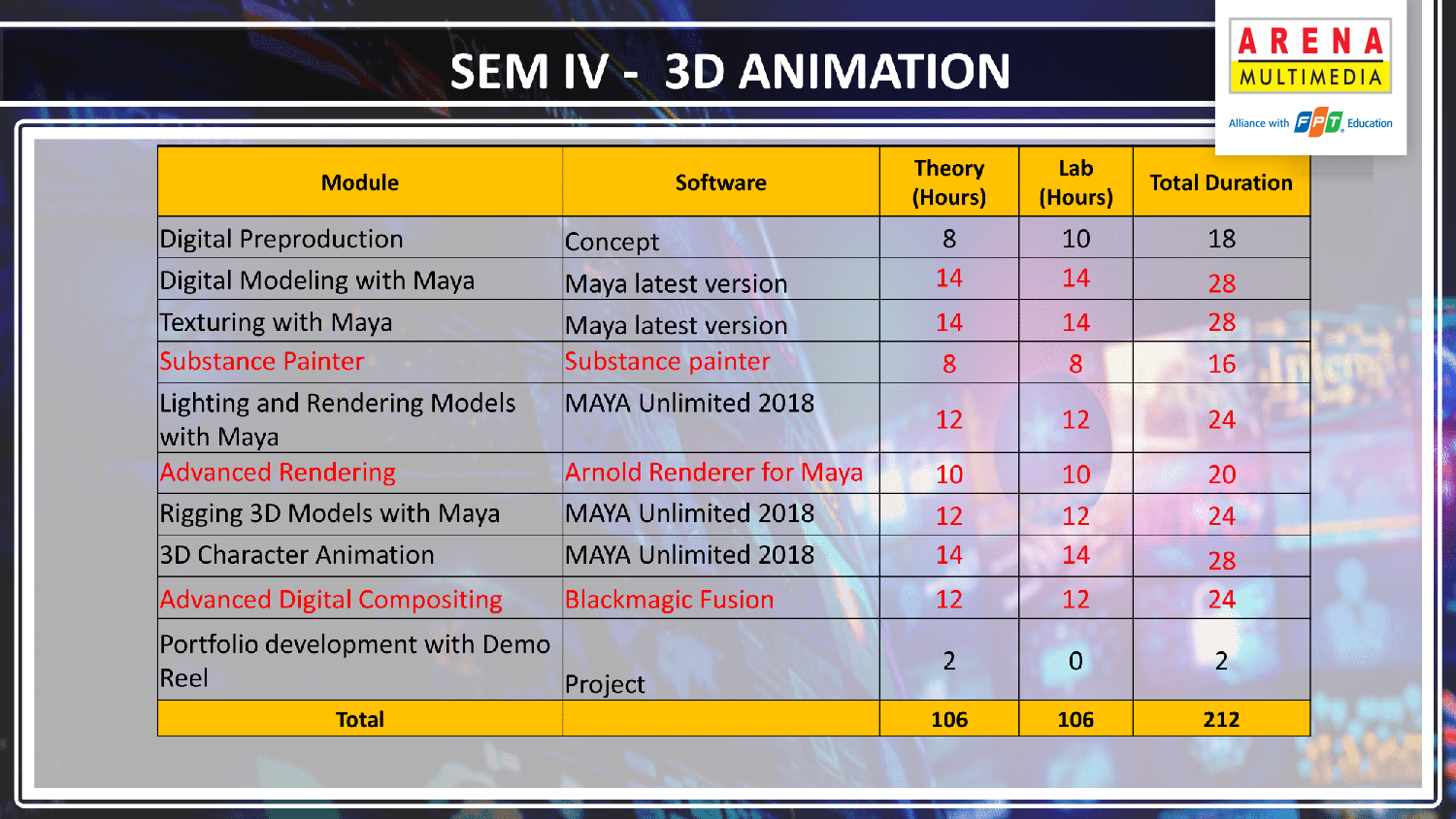 | Chương trình đào tạo Chuyên gia Mỹ thuật Đa phương tiện AMSP mới nhất của FPT Arena Multimedia – với 16 năm kinh nghiệm đào tạo gồm: – Kỳ 1: Graphic Design (Thiết kế Đồ hoạ) – Kỳ 2: Web & Digital Design (Thiết kế Web & Ứng dụng Kỹ thuật số) – Kỳ 3: Filmmaking & Game Design (Làm phim Kỹ thuật số & Thiết kế Game) – Kỳ 4: 3D Animation (Hoạt hình 3D) Với thời gian thực hành chiếm tới 80%, cùng giáo trình mới nhất, giảng viên uy tín, FPT Arena luôn là sự lựa chọn hàng đầu của các bạn trẻ yêu thích sáng tạo & muốn phát triển bản thân trong một ngành nghề thú vị. Ghé thăm FPT Arena tại: Youtube: https://www.youtube.com/user/FPTArenaMultimedia Instagram: https://www.instagram.com/fpt.arena/ Website: https://arena.fpt.edu.vn/ Fanpage: https://www.facebook.com/fpt.arena/ |