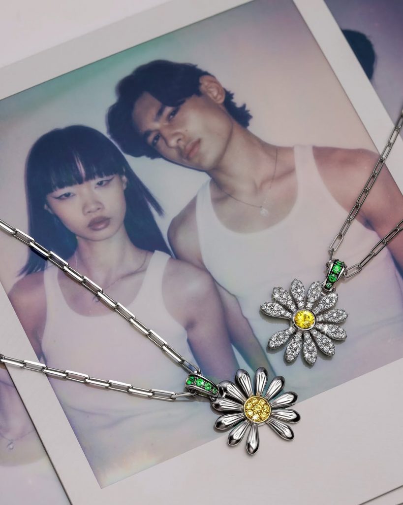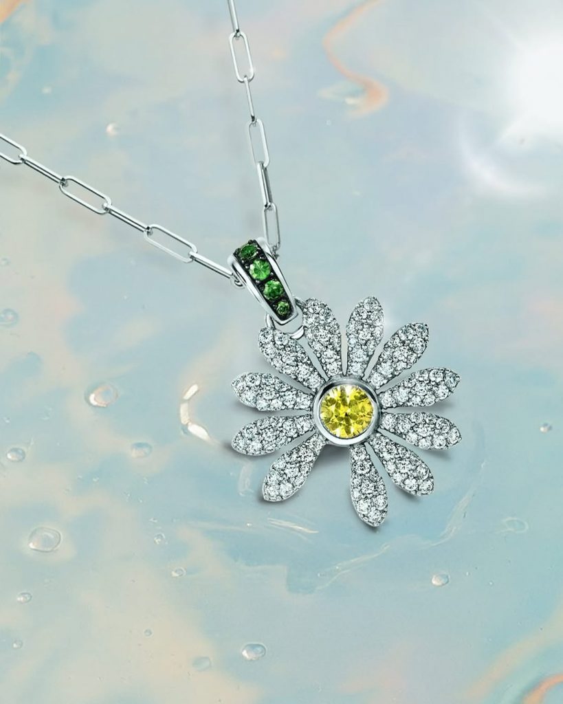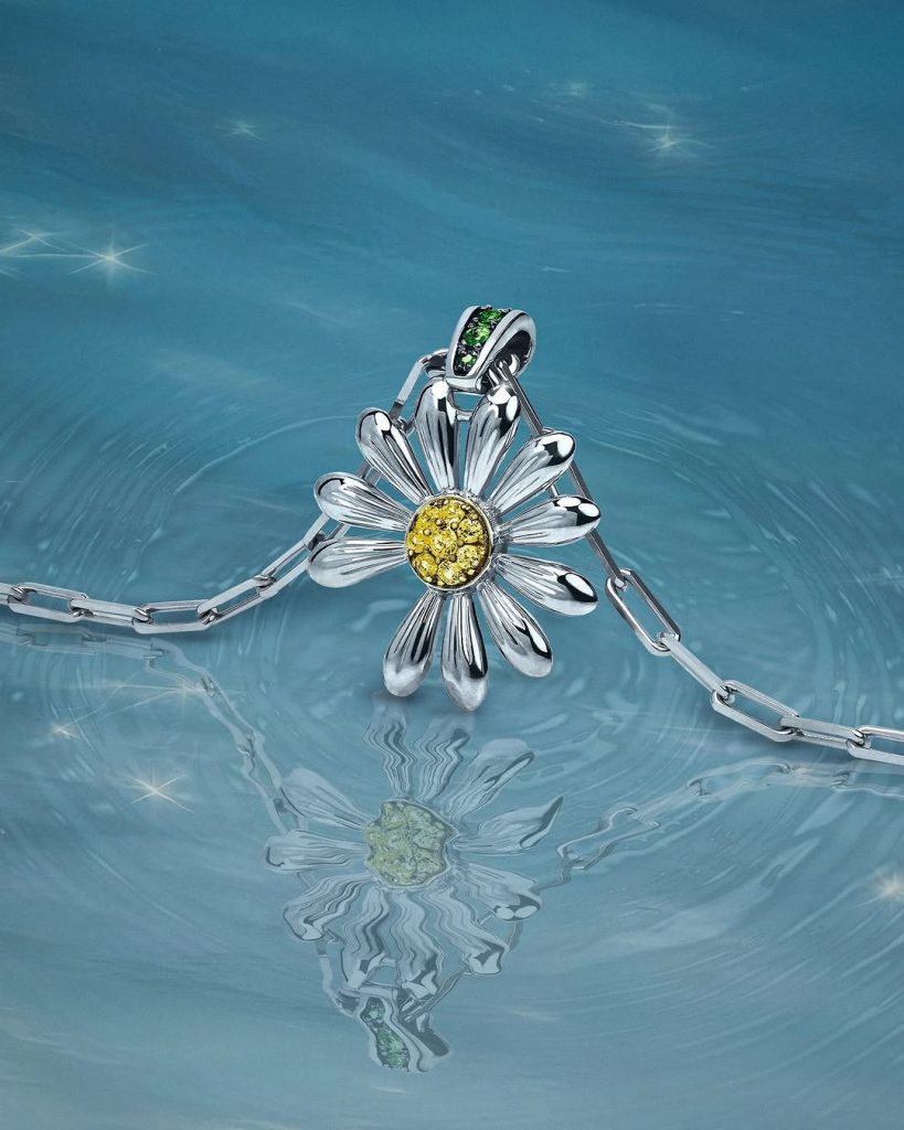 Một phiên bản mặt dây chuyền được chế tác từ bạc 925, nhấn nhá bằng cánh hoa vàng 18K, nạm đá tsavorite xanh và sapphire vàng. Mỗi chiếc đều được đánh số riêng, đi kèm chứng nhận chính hãng, với giá khoảng 1.200 USD (khoảng gần 31 triệu đồng).