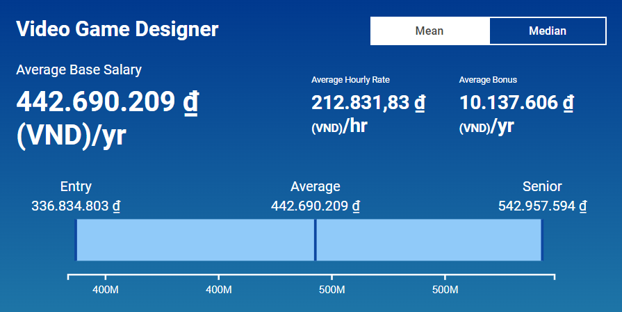 Số liệu thống kê của Career Explorer công bố, một Game Designer 5 năm kinh nghiệm tại thị trường Bắc Mỹ có thể đạt được mức thu nhập 90.000 USD/năm (khoảng 2 tỷ đồng). Bên cạnh đó theo thống Payscale, mức lương trung bình của vị trí Game Designer là 66.000 USD/năm (khoảng 1,5 tỷ đồng). Trong đó, mức khởi điểm rơi vào mức 40,000 USD/năm (khoảng 917 triệu đồng) và cao nhất có thể đạt đến 104.000 USD/năm (khoảng 2,4 tỷ đồng). Tại Việt Nam, mức lương trung bình chi trả hằng năm cho các nhà thiết kế game khoảng 442 triệu đồng.