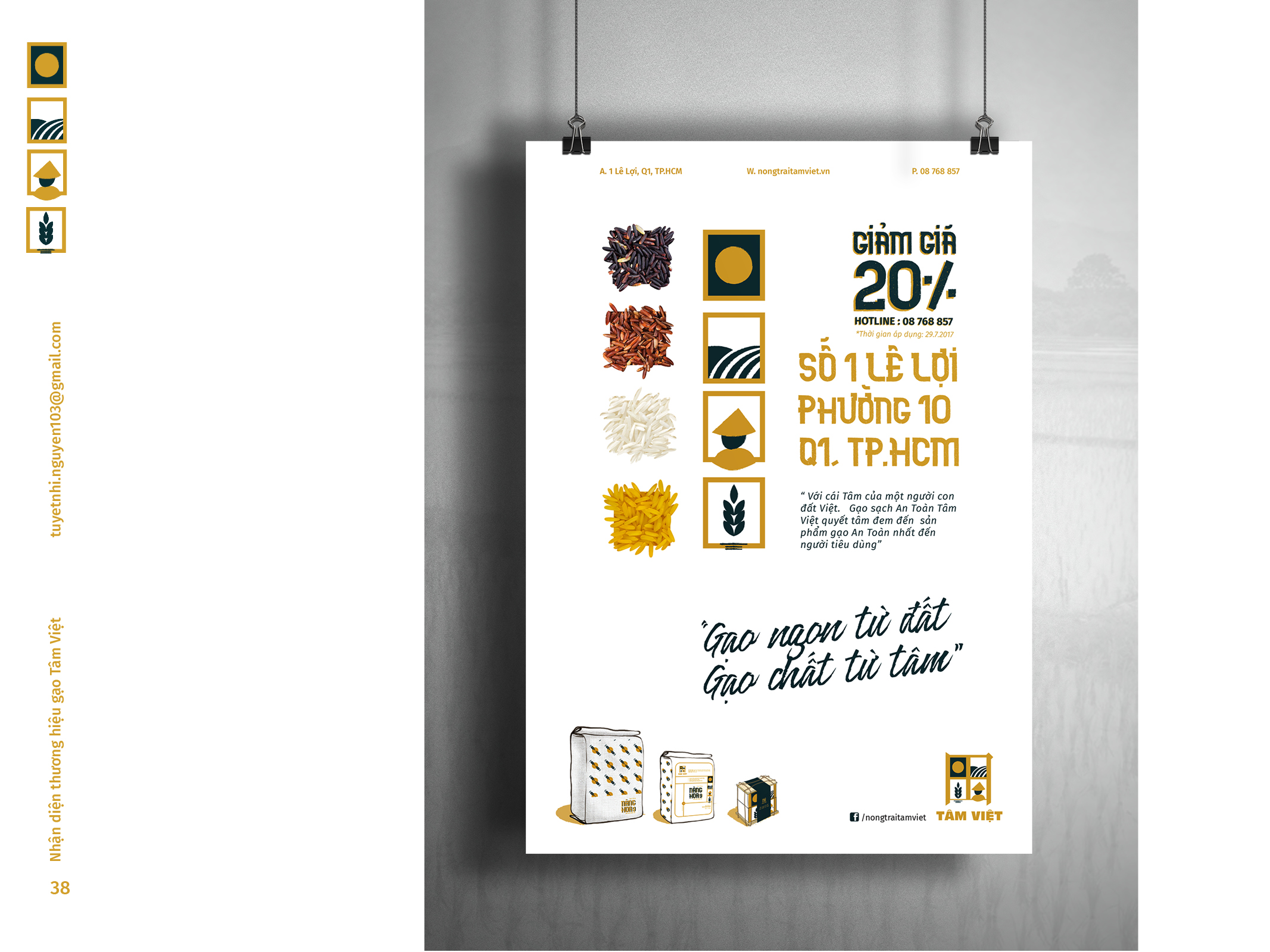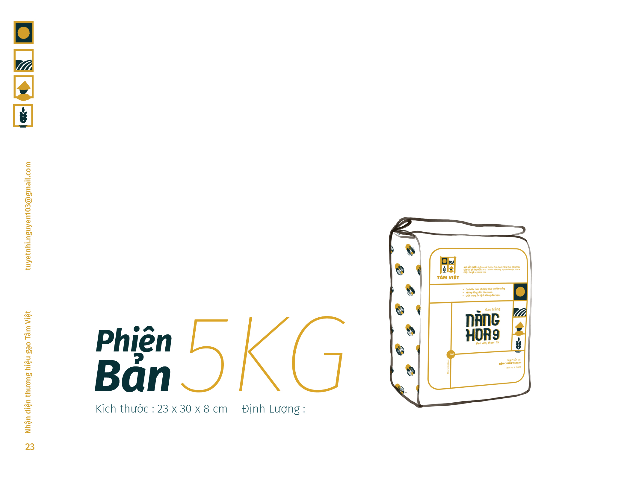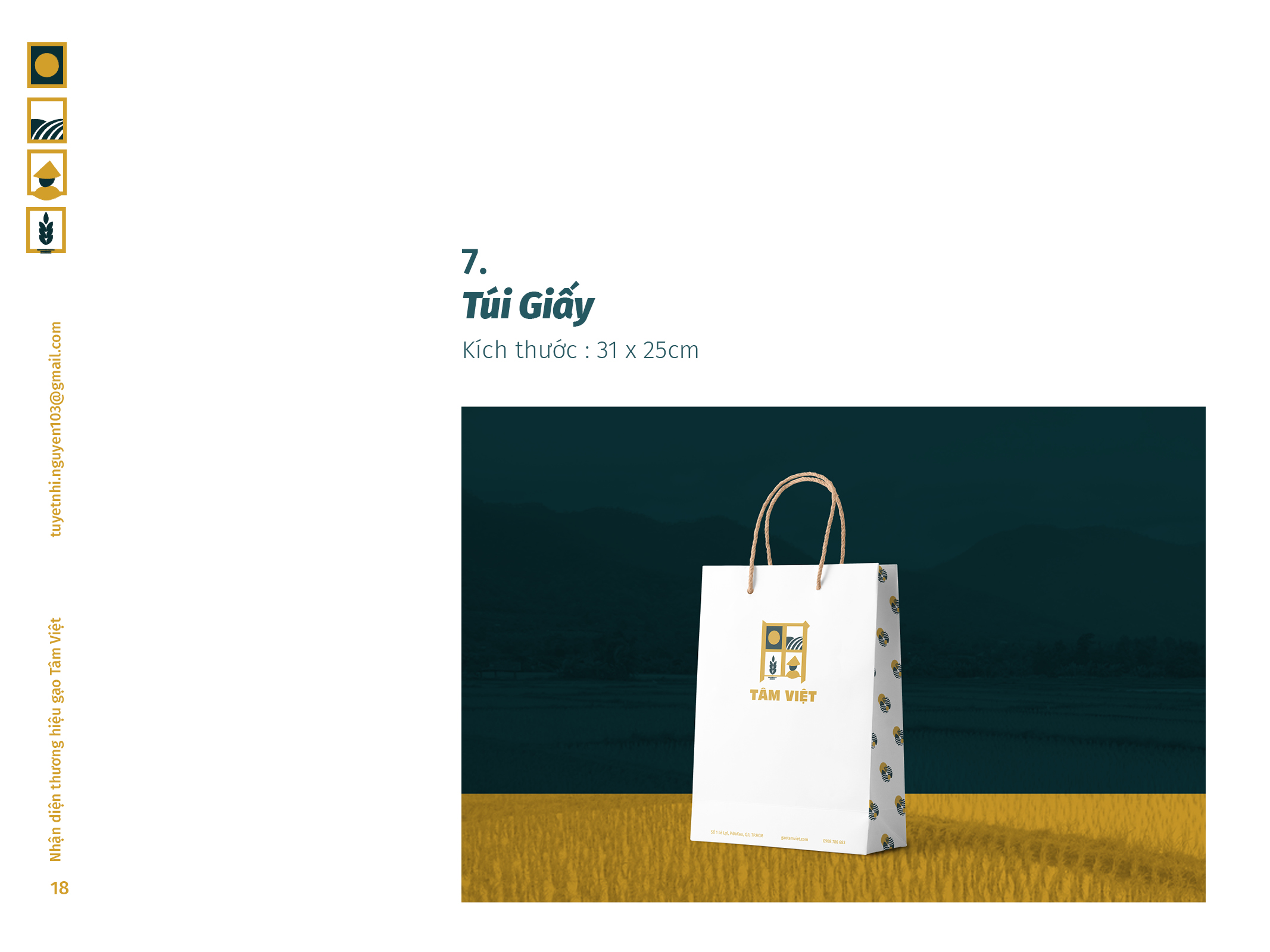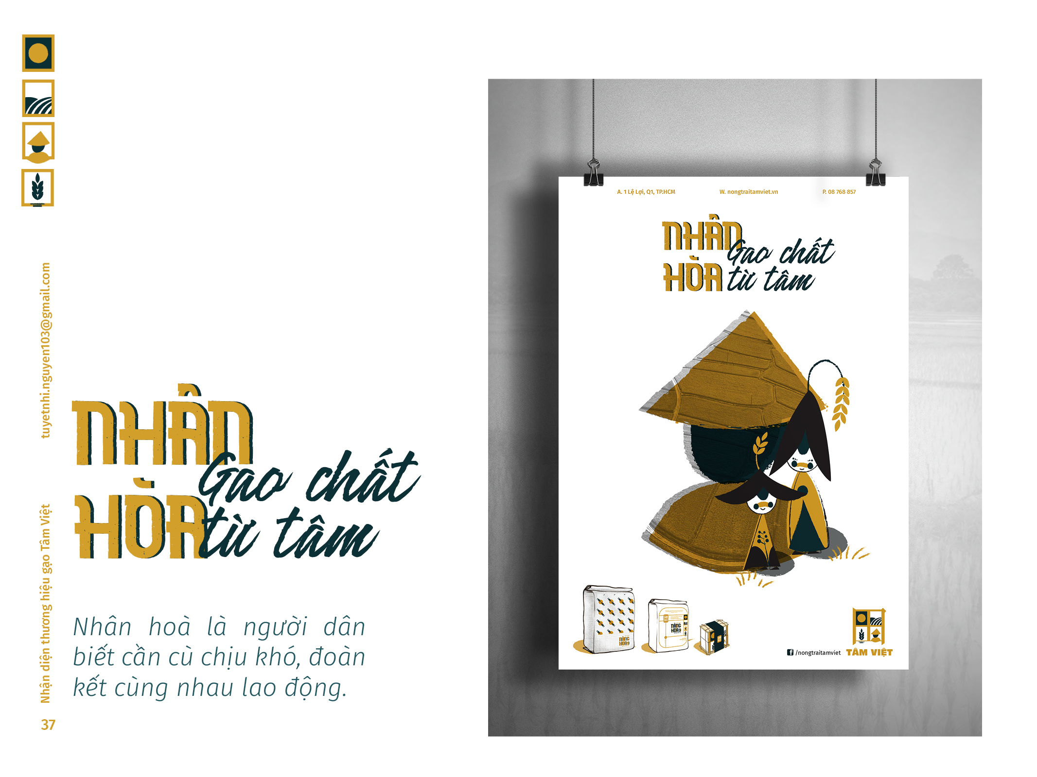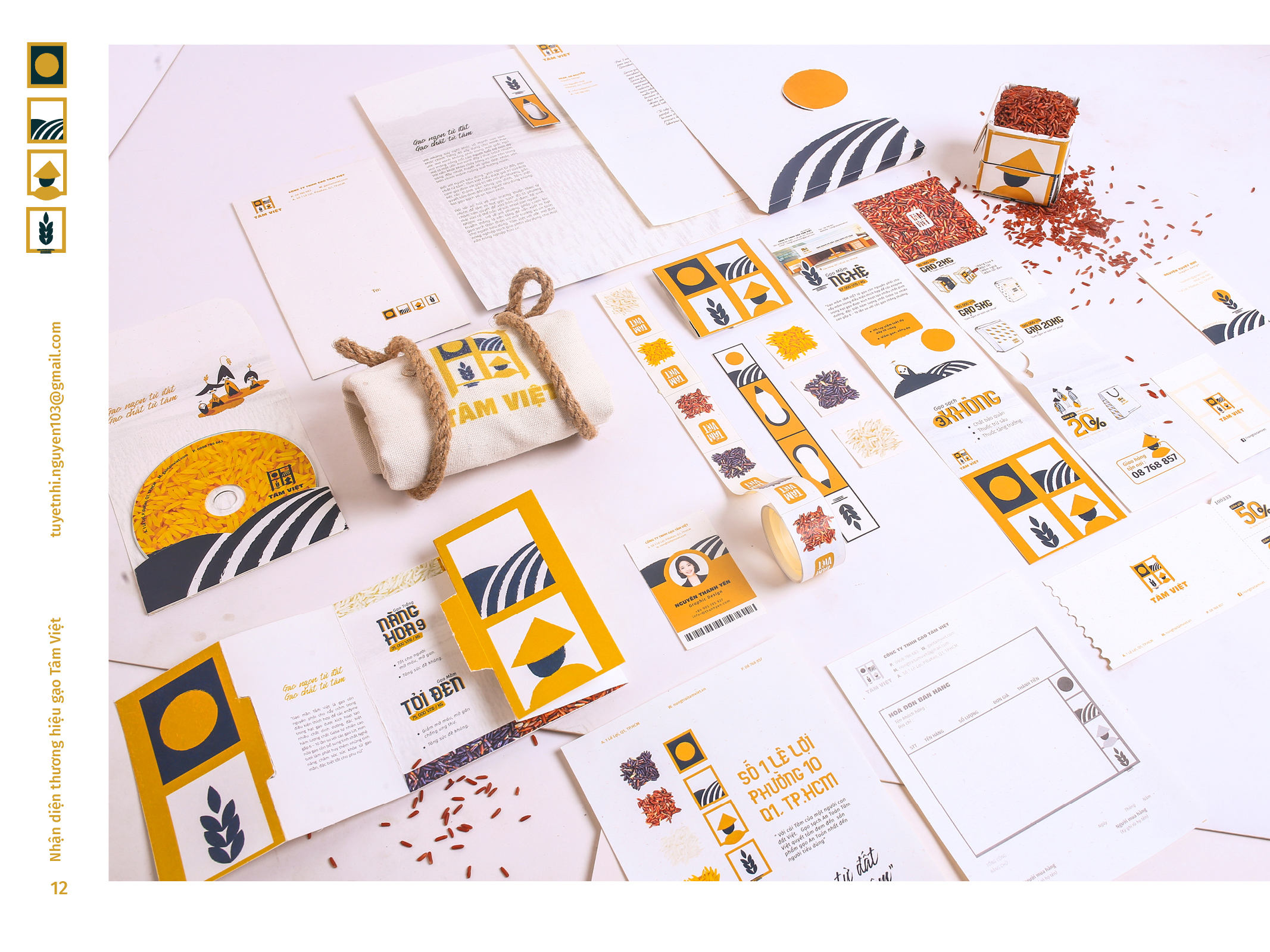 Gạo Tâm Việt là một loại gạo được canh tác theo phương thức truyền thống từ ngàn đời nay. Với niềm tự hào về các sản phẩm thuần tuý Việt Nam, Nhi đã đem nó vào trong đồ án tốt nghiệp của mình, xây dựng nên một cái nhìn mới về thương hiệu Việt. Bên cạnh thiết kế bắt mắt, chỉnh chu. Nhi còn chú trọng về câu chuyện thương hiệu và công năng mà thiết kế mang lại. Đồng thời, chất liệu mà Nhi sử dụng để thiết kế cho bao bì thì vô cùng thân thiện với môi trường. Tổng hòa tạo nên một đồ án xuất sắc và giúp Nhi trở thành thủ khoa chuyên ngành Thiết Kế Đồ Họa của ĐH Tôn Đức Thắng.