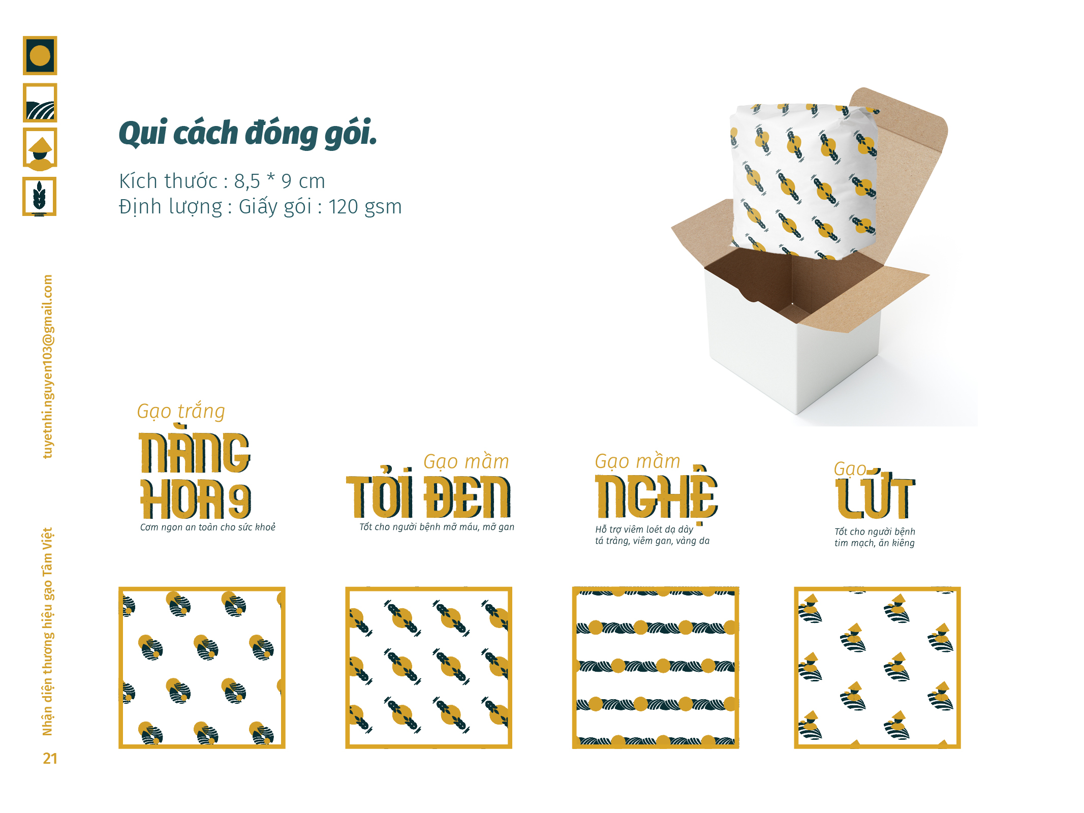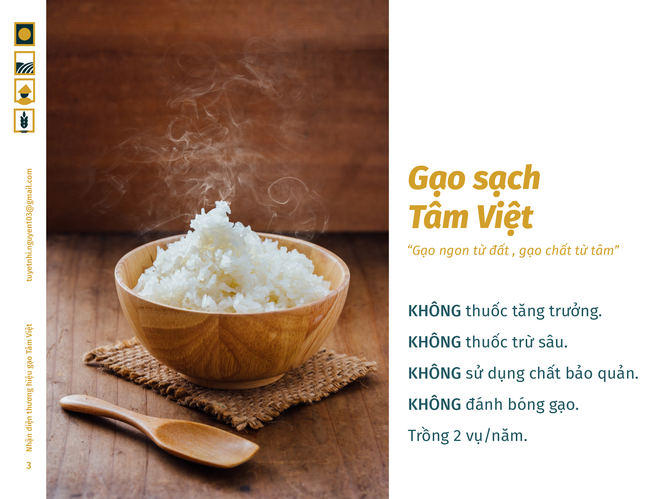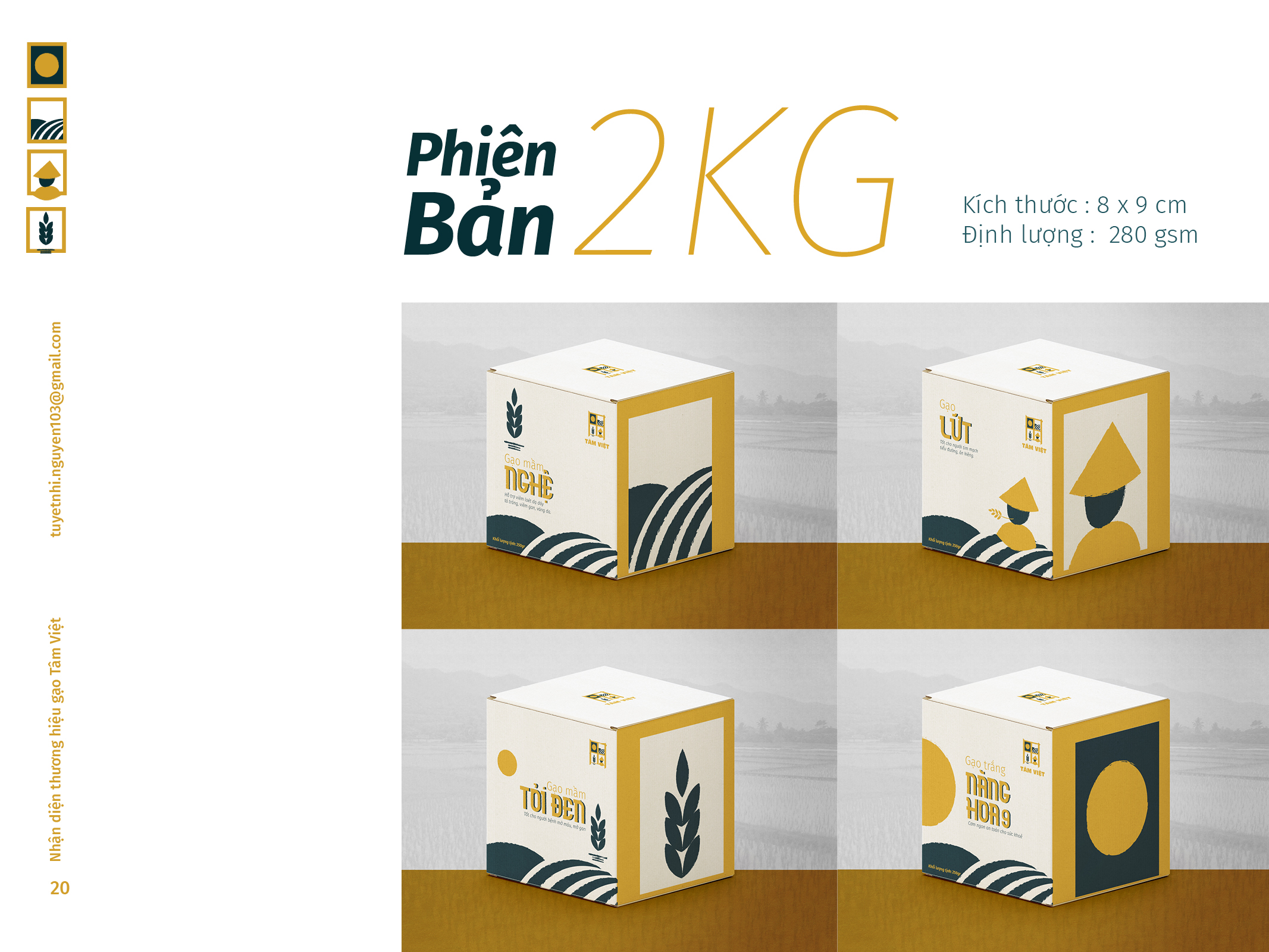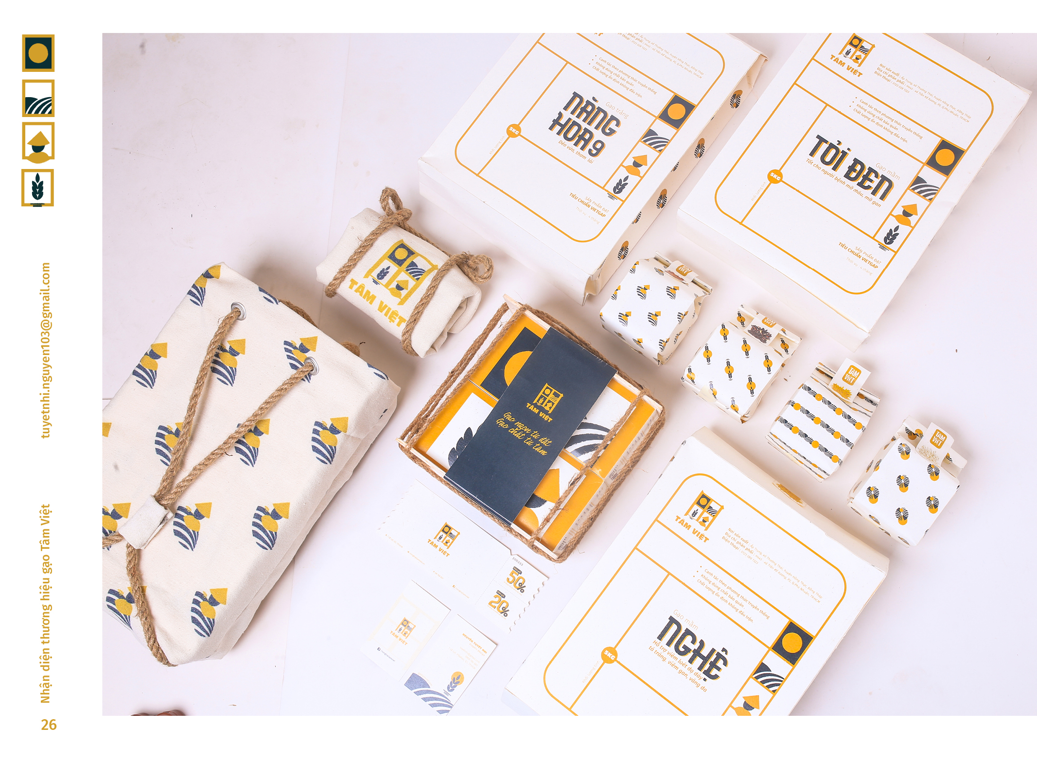 Gạo Tâm Việt là một loại gạo được canh tác theo phương thức truyền thống từ ngàn đời nay. Với niềm tự hào về các sản phẩm thuần tuý Việt Nam, Nhi đã đem nó vào trong đồ án tốt nghiệp của mình, xây dựng nên một cái nhìn mới về thương hiệu Việt. Bên cạnh thiết kế bắt mắt, chỉnh chu. Nhi còn chú trọng về câu chuyện thương hiệu và công năng mà thiết kế mang lại. Đồng thời, chất liệu mà Nhi sử dụng để thiết kế cho bao bì thì vô cùng thân thiện với môi trường. Tổng hòa tạo nên một đồ án xuất sắc và giúp Nhi trở thành thủ khoa chuyên ngành Thiết Kế Đồ Họa của ĐH Tôn Đức Thắng.
