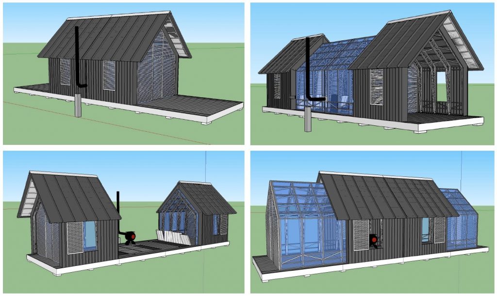 Chủ yếu được xây dựng bằng gỗ, ngôi nhà có một lớp vỏ bên trong bằng kính đôi và một mái nhà bằng thép bao phủ. Không gian được sưởi ấm bởi một bếp củi Na Uy tuy nhỏ nhưng hiệu quả.