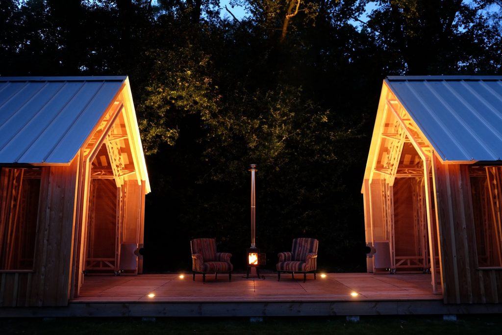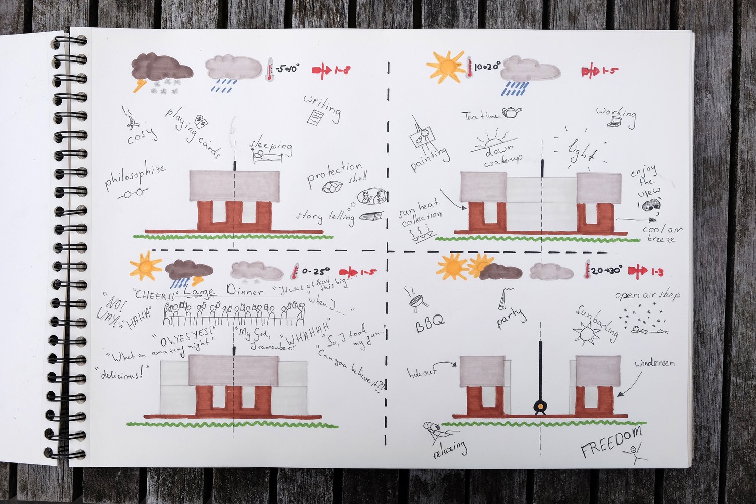 Chủ yếu được xây dựng bằng gỗ, ngôi nhà có một lớp vỏ bên trong bằng kính đôi và một mái nhà bằng thép bao phủ. Không gian được sưởi ấm bởi một bếp củi Na Uy tuy nhỏ nhưng hiệu quả.