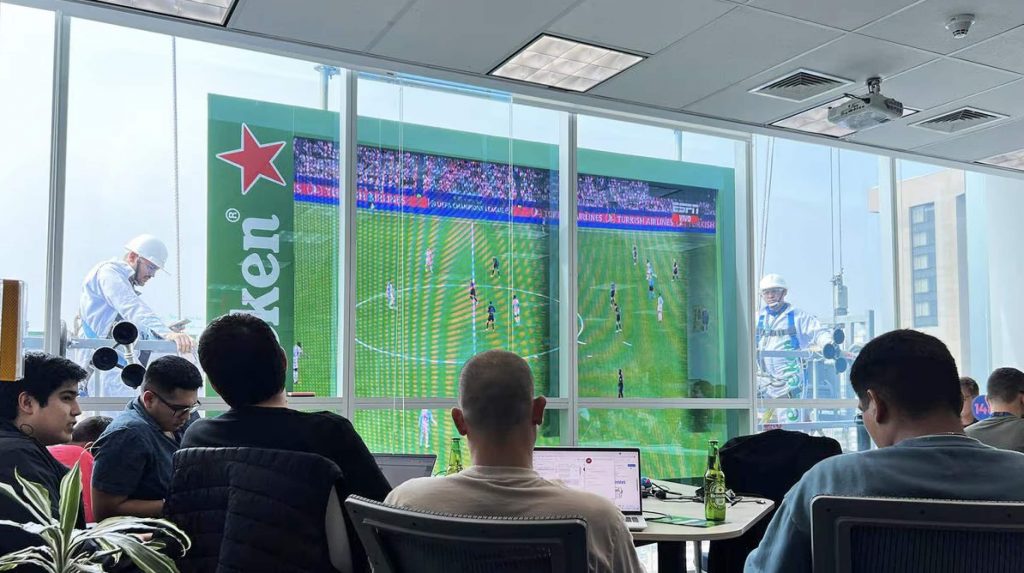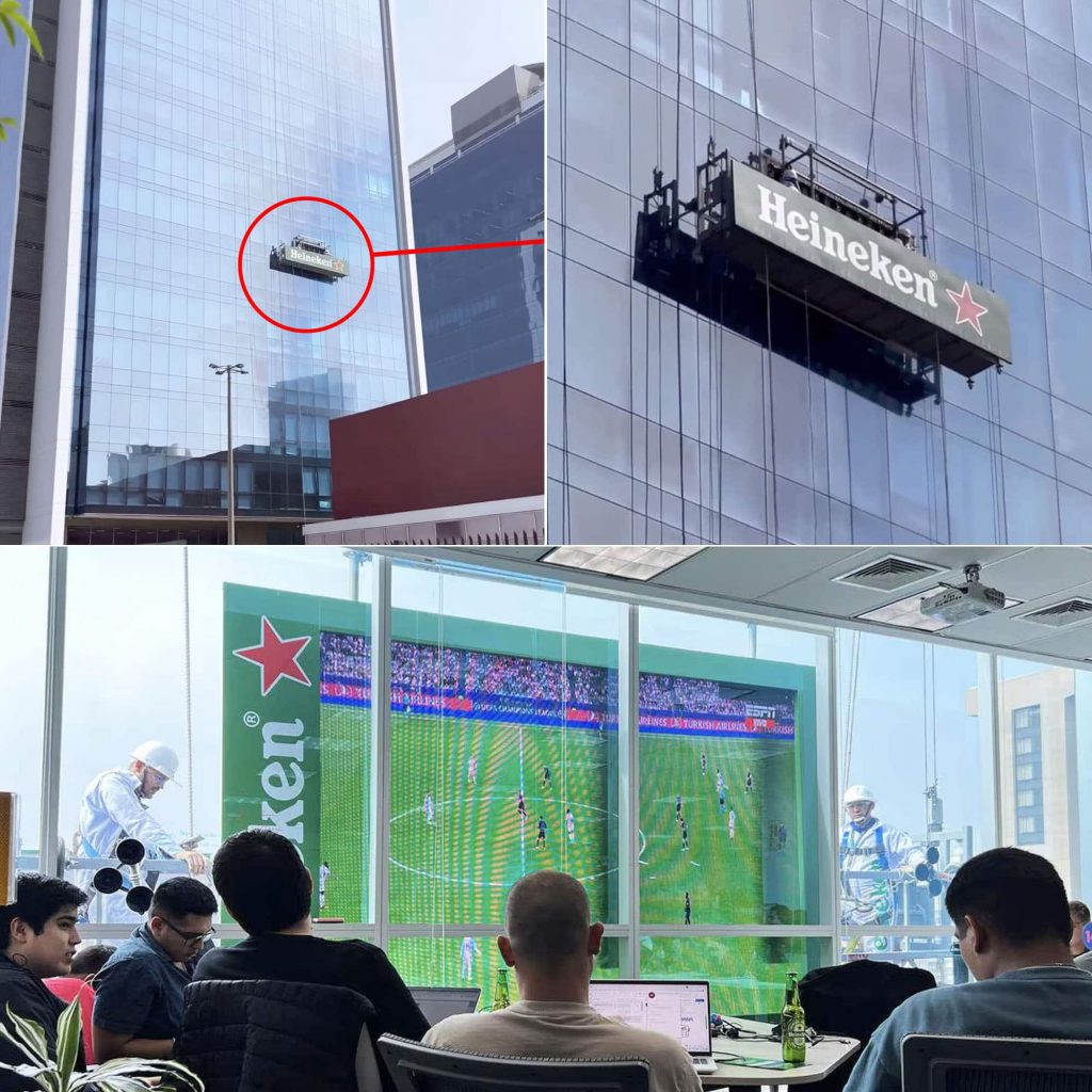 Heineken “giả dạng” kén bảo trì toà nhà để chiếu bóng đá UEFA Champions League chiêu đãi fan ở văn phòng
