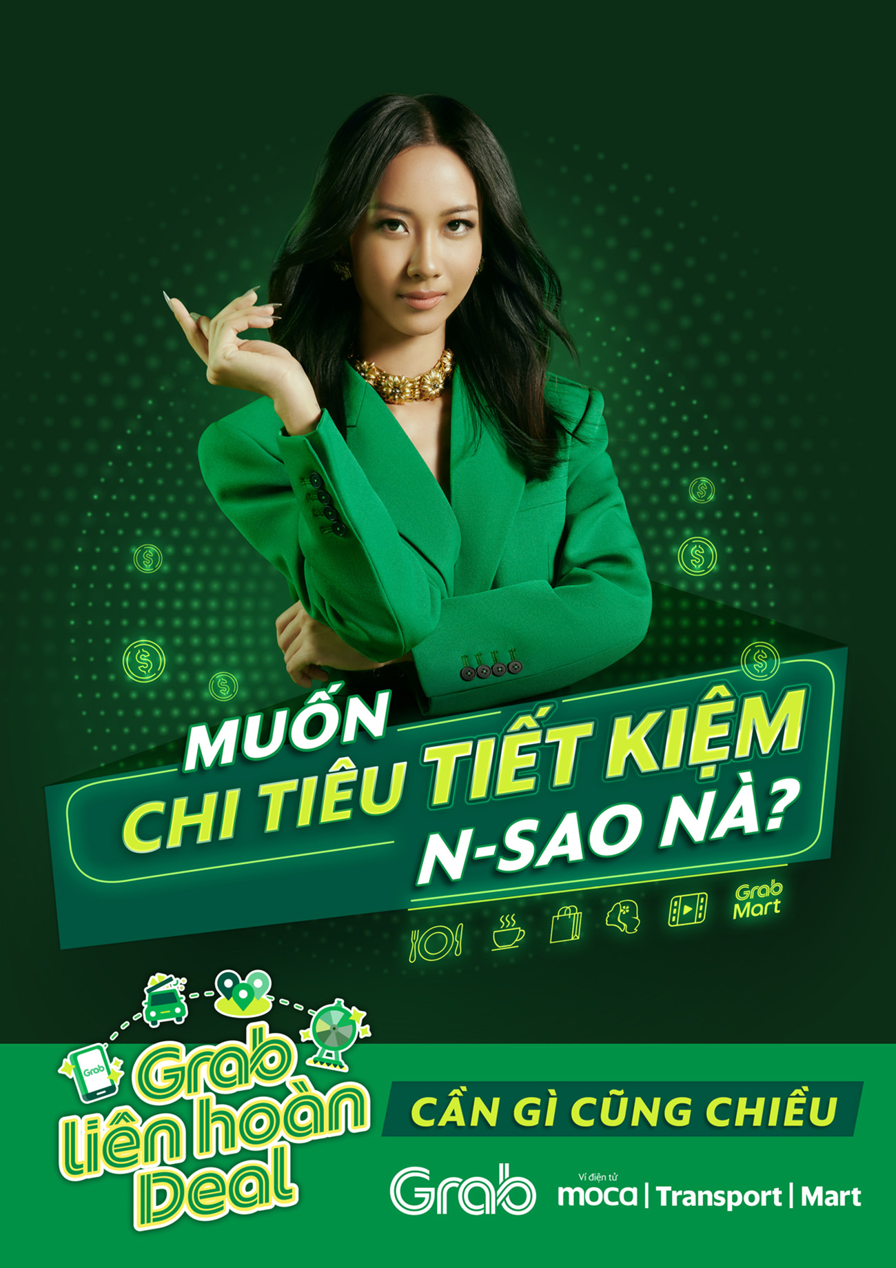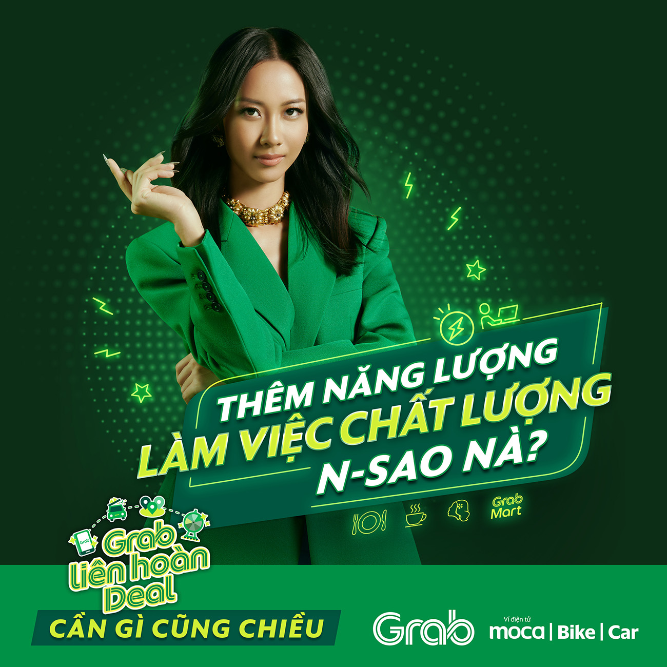 Bên cạnh nội dung sâu sát với insight thị trường, một điểm cộng khác không thể bỏ qua chính là cách chơi màu, hiệu ứng ánh sáng neon, kết hợp cùng mô hình 3D trong key visual và xuyên suốt MV của chiến dịch “Grab Liên Hoàn Deals”. Phong cách thiết kế này không đơn thuần dừng lại ở sự hiện đại, mà còn khẳng định chất công nghệ, sáng tạo và tươi trẻ trong cá tính thương hiệu của Grab. Ngoài ra, việc sử dụng biểu tượng pháo đài vòng cung với Suboi đứng ở vị trí trung tâm chính là ẩn dụ đầy tinh tế cho việc cô chính là biểu tượng tiên phong trải nghiệm trọn vẹn hành trình được Grab thiết kế liền mạch dành cho khách hàng của mình từ ăn uống, di chuyển, mua sắm, thanh toán…