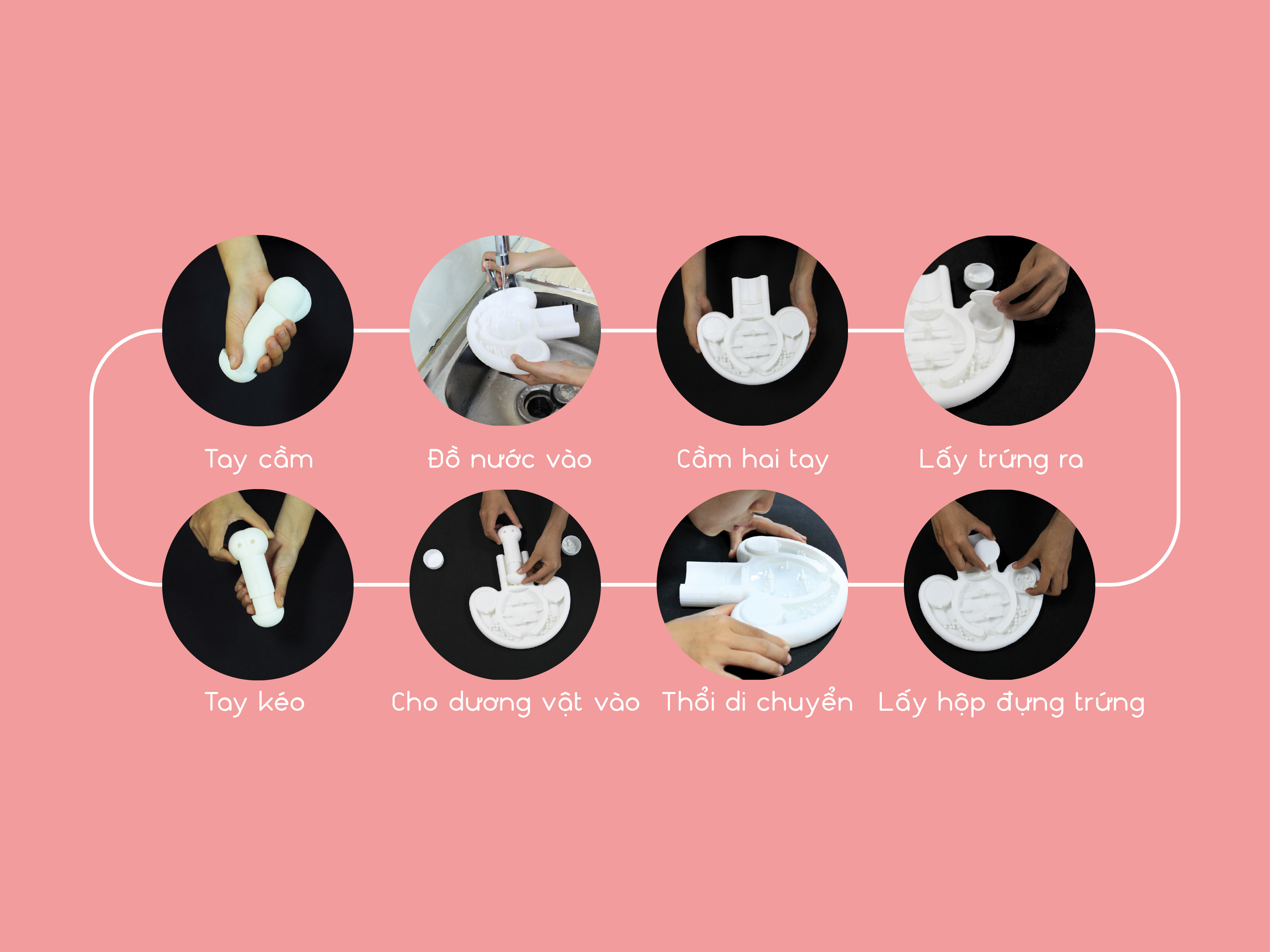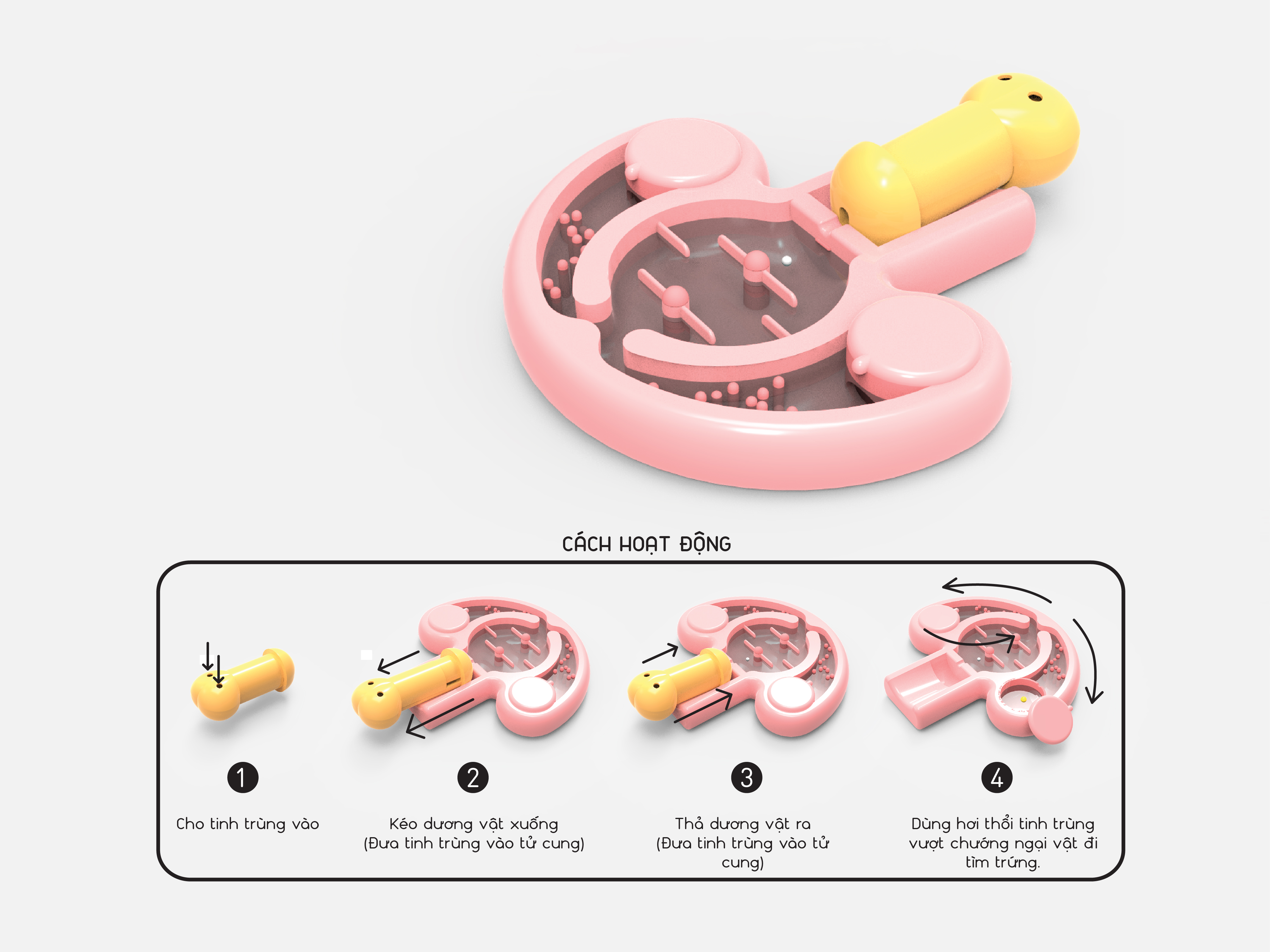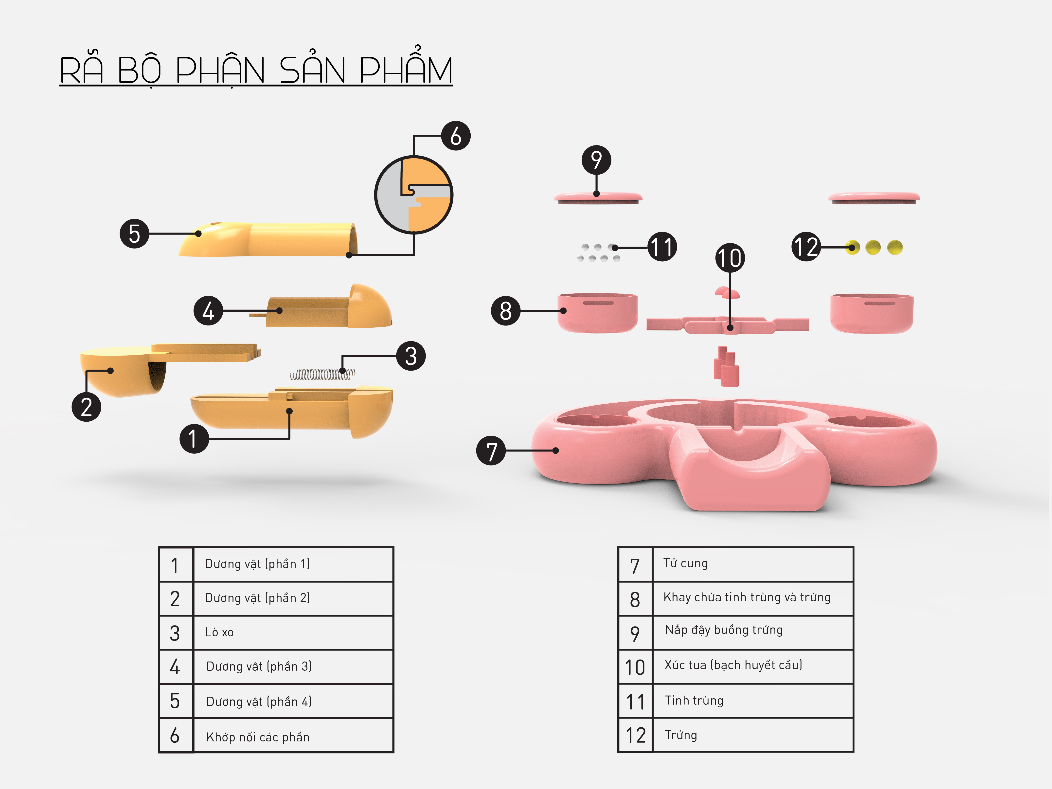 “Đây là một bộ sản phẩm hỗ trợ cho việc giáo dục giới tính.Sản phẩm không chỉ hỗ trợ môn sinh học lớp 8 “Bài 62: Thụ tinh, thụ thai và phát triển của thai” mà còn giúp trẻ có câu trả lời xác thực nhất, tránh tình trạng trẻ nhận được sự lảng tránh hay câu trả lời không đúng sự thật khi hỏi người lớn: con đã được sinh ra như thế nào?… Bộ sản phẩm gồm tử cung và dương vật, cách thức chơi được mô phỏng theo kiến thức sinh học: Quá trình tinh trùng gặp trứng (chính) – Sự phóng tinh & sự rụng trứng (phụ) để nhằm góp phần làm rõ kiến thức.”