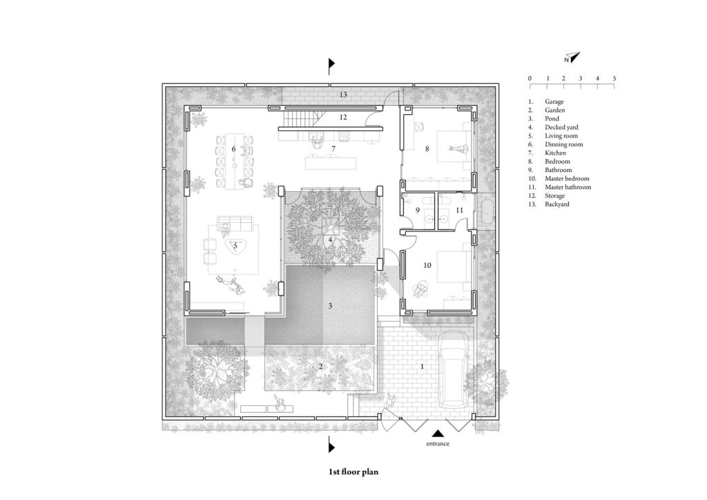 Các không gian trong ngôi nhà được bao bọc bởi thiên nhiên, hướng về thiên nhiên và hướng vào nhau tạo thành một không gian hướng nội, giúp gắn kết con người với thiên nhiên, với con người, với chính mình. Từ mọi vị trí trong nhà, mọi người có thể nhìn thấy nhau, và nhìn thấy cây cối, mặt nước, hồ cá…. Từ đó có thể cảm nhận được thiên nhiên dưới dạng không khí, âm thanh và ánh sáng.