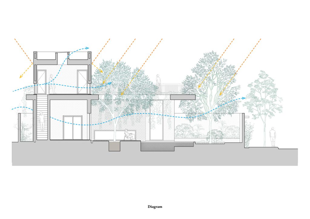 Ngôi nhà có một tầng chính và một gian nhỏ phía trên để đọc sách và thờ cúng. Từ ngoài vào trong, xuyên qua bức tường gạch đỏ là một lớp cây xanh bao phủ khắp ngôi nhà. Có nhiều lớp thảm thực vật như cây tạo bóng mát, cây bụi, dây leo rủ từ trên mái xuống tạo thành lớp che, ngăn bụi và tiếng ồn đô thị. Các không gian chính được bố trí xung quanh một sân trong ở giữa nhà tạo nên một không gian hướng tâm thanh bình, yên tĩnh, tách biệt với thành phố bên ngoài.