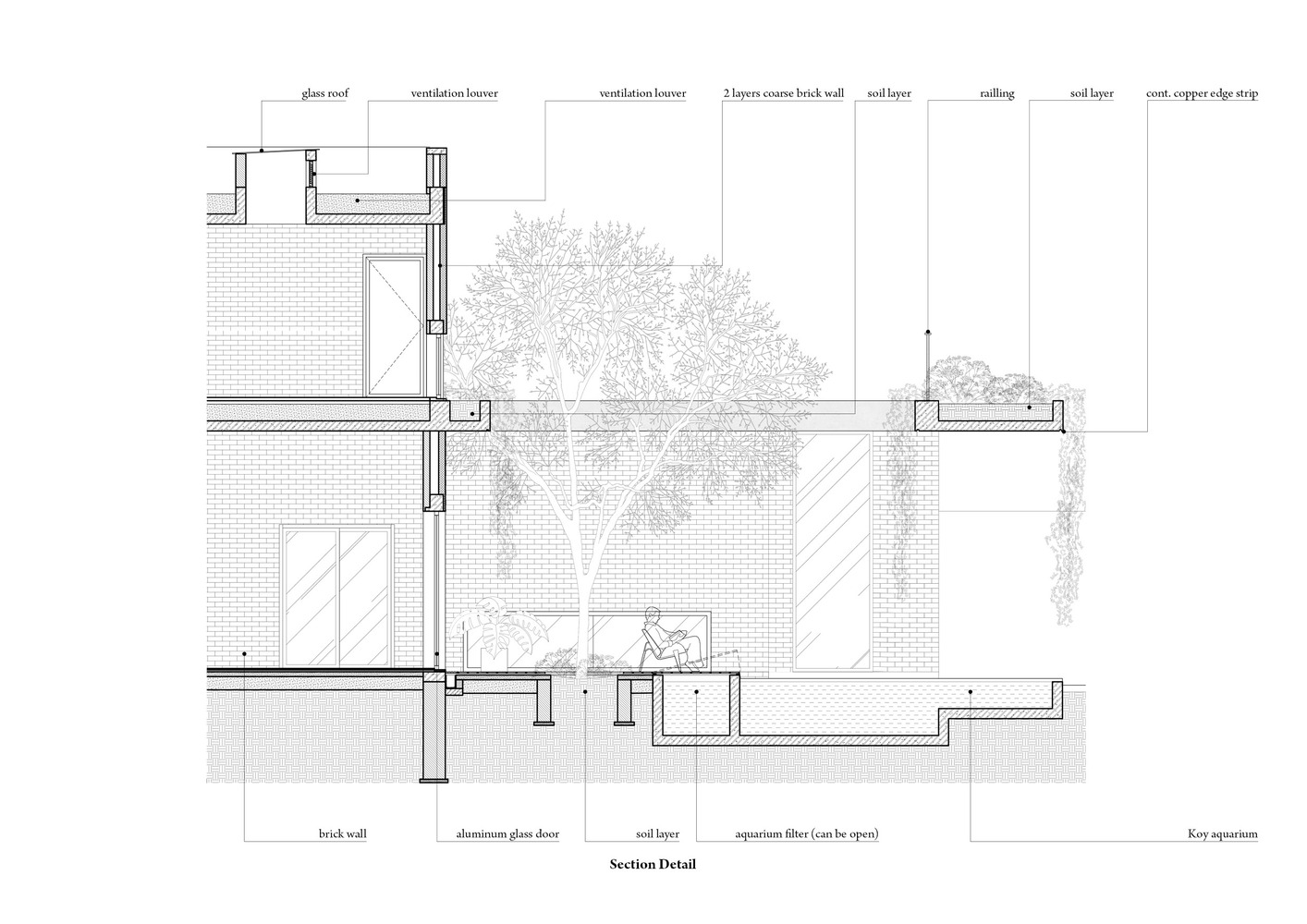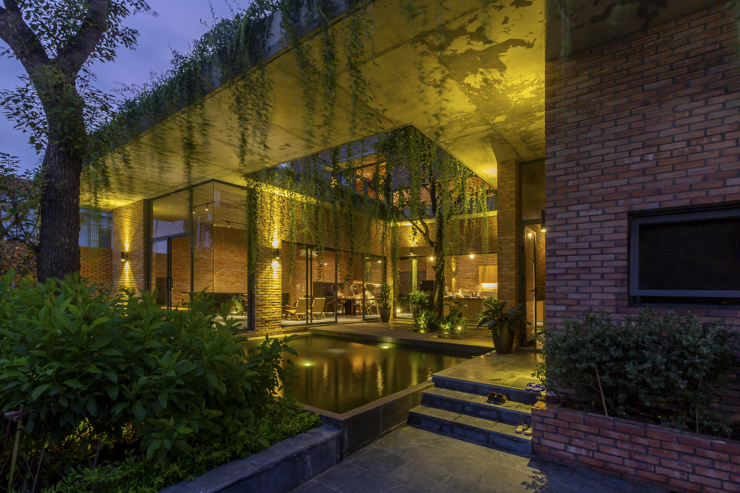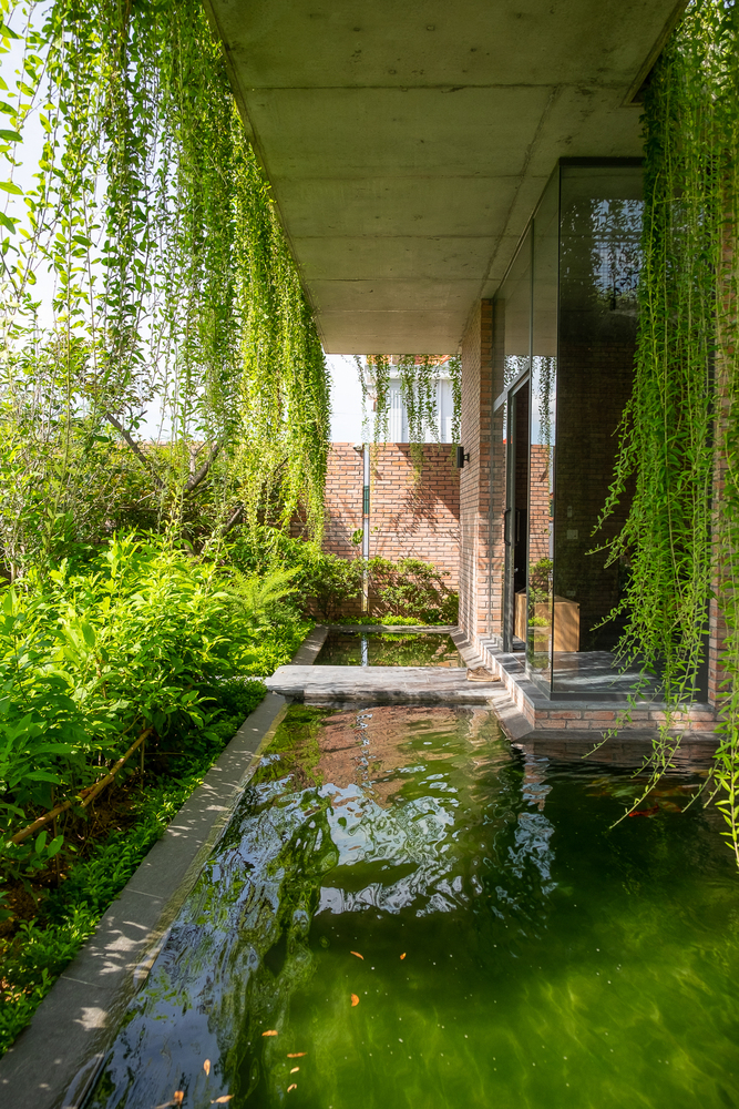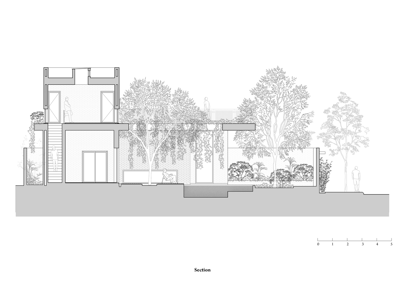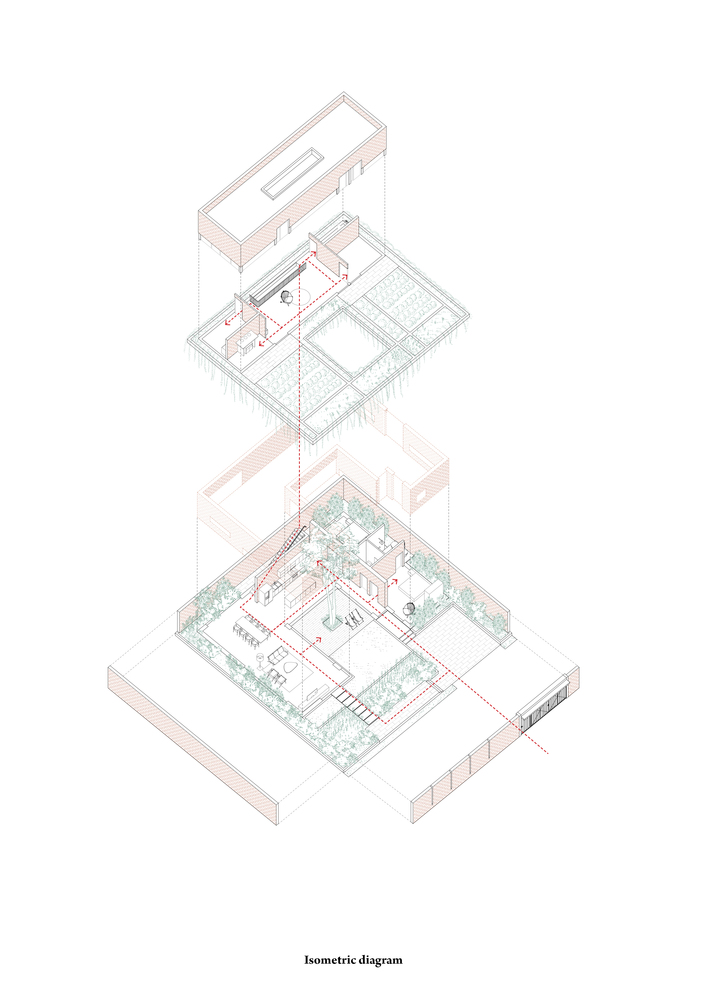 Ngôi nhà có một tầng chính và một gian nhỏ phía trên để đọc sách và thờ cúng. Từ ngoài vào trong, xuyên qua bức tường gạch đỏ là một lớp cây xanh bao phủ khắp ngôi nhà. Có nhiều lớp thảm thực vật như cây tạo bóng mát, cây bụi, dây leo rủ từ trên mái xuống tạo thành lớp che, ngăn bụi và tiếng ồn đô thị. Các không gian chính được bố trí xung quanh một sân trong ở giữa nhà tạo nên một không gian hướng tâm thanh bình, yên tĩnh, tách biệt với thành phố bên ngoài.