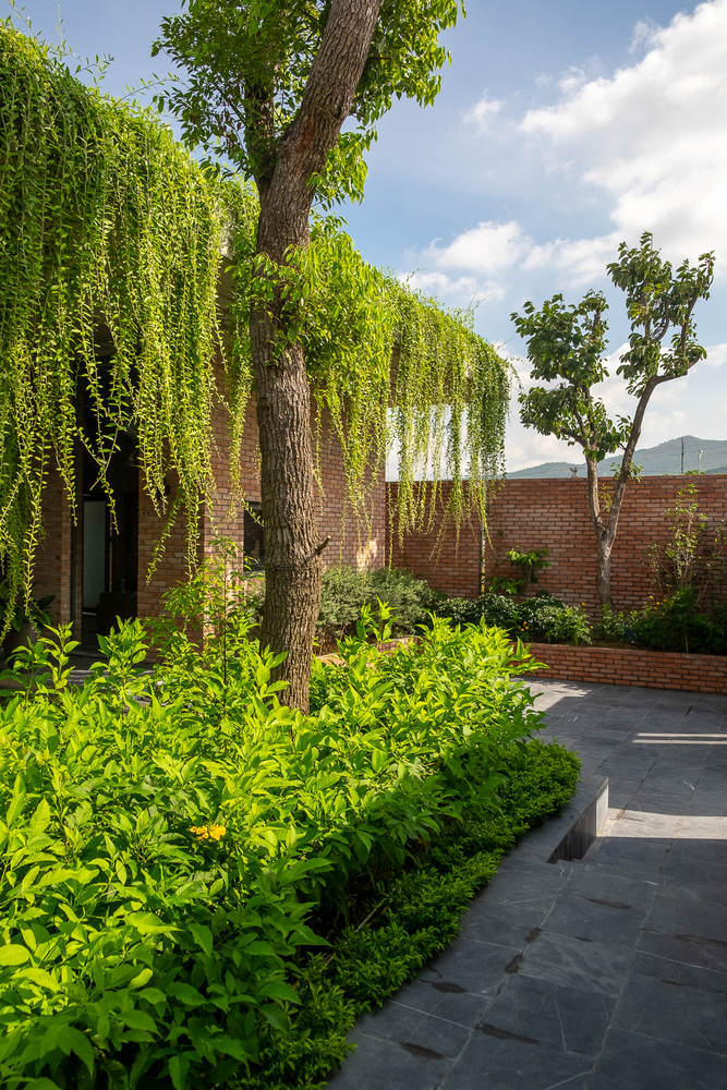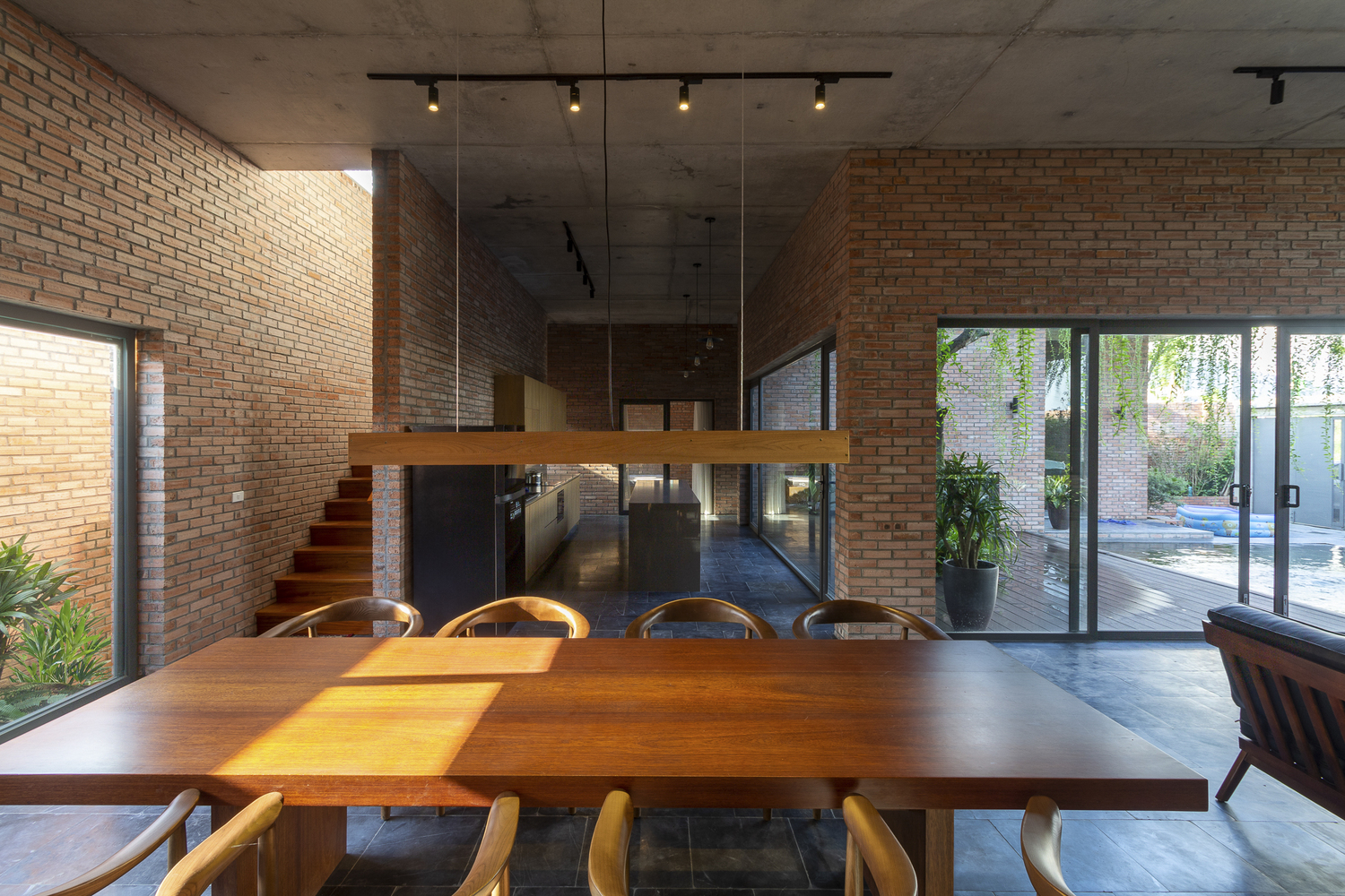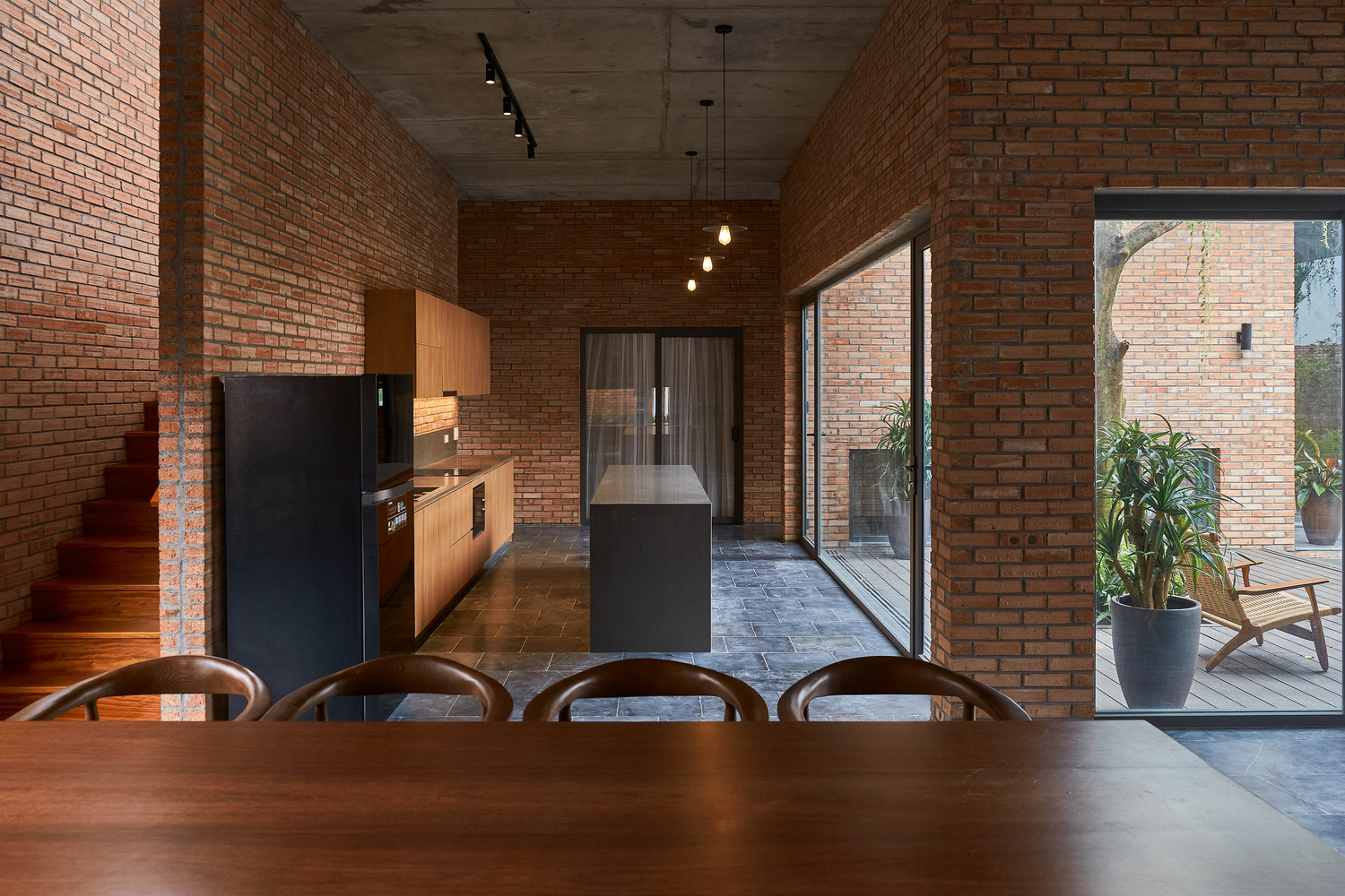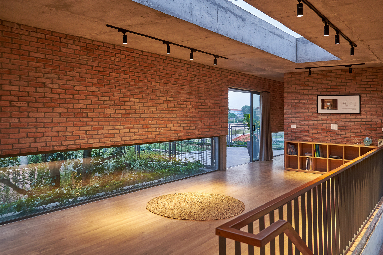 Vật liệu chính trong ngôi nhà là gạch đỏ và bê tông trần tạo cảm giác mộc mạc, gần gũi, đậm chất con người. Vật liệu cũng là một yếu tố quan trọng để tạo nên không gian kiến trúc, tạo cảm xúc với con người và tôn lên vẻ đẹp của thiên nhiên, không gian kiến trúc. Thông qua dự án này, KTS muốn sử dụng những phương pháp đơn giản, những vật liệu phổ biến của địa phương để tạo nên một không gian sống đầy cảm xúc, gần gũi với con người và với thiên nhiên.