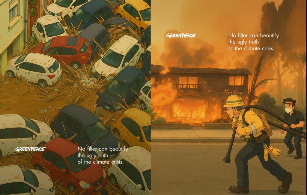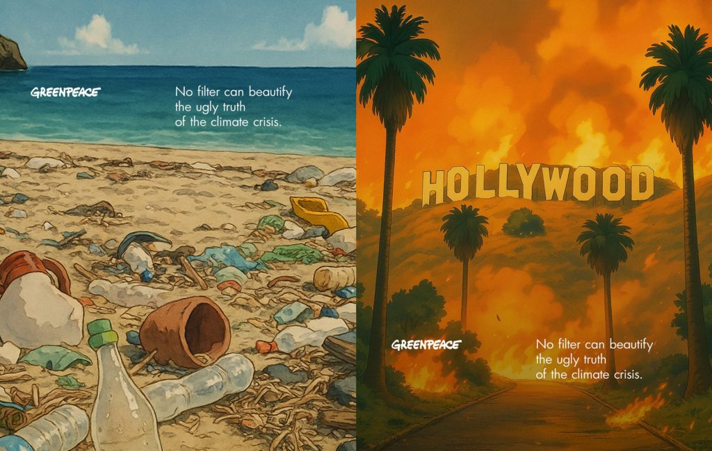 Thay vì sử dụng phong cách Ghibli để tô vẽ thế giới cổ tích, họ dùng chính nó để tái hiện những thảm họa môi trường: cháy rừng, ô nhiễm nhựa, nước biển dâng và những hệ sinh thái đang hấp hối. Trên mỗi bức ảnh, Greenpeace gửi đi thông điệp “No filter can beautify the ugly truth of the climate crisis” (tạm dịch: Không một bộ lọc nào có thể làm đẹp sự thật trần trụi của cuộc khủng hoảng khí hậu) nhằm nhấn mạnh rằng A.I và các công cụ kỹ thuật số không thể che đậy sự thật về biến đổi khí hậu, và hành động cụ thể là cần thiết để đối phó với tình trạng này.