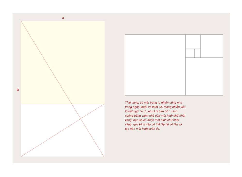 Không có quyển sách về Typography nào hoàn thiện nếu thiếu đi Tỉ lệ vàng, một tỉ lệ được sử dụng trong nghệ thuật phương Tây và kiến trúc từ hơn hai ngàn năm trước. Phương trình tỉ lệ vàng được viết dưới dạng a:b = b:(a+b). Tức là tỉ lệ giữa số nhỏ hơn và số lớn hơn sẽ bằng với tỉ lệ giữa số lớn hơn với tổng hai số. Nghe mệt nhỉ, nên chúng mình tạm quên đi phương phương trình trình, vì đã có người tính sẵn ra tỉ lệ vàng là 1:1.618.