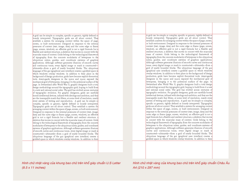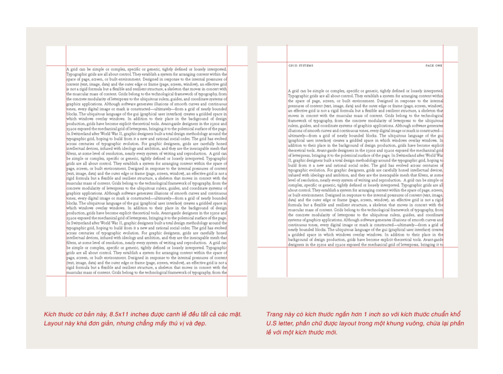 Bất cứ khi nào bạn mở một file tài liệu trên một chương trình layout, một trong những việc đầu tiên phải làm là tạo một hệ thống lưới. Lưới đơn giản nhất là hệ lưới 1 cột với toàn bộ chữ được bao bởi các lề. Bằng việc yêu cầu kích thước chừa lề, phần mềm layout khuyến khích bạn thiết kế trang từ ngoài vào trong. Một cách thay thế, bạn có thể thiết kế trang theo hướng từ trong ra ngoài. Tức là xác định lề của bạn là 0 rồi định vị các đường guidelines và khung chữ trên một trang trống. Điều này cho phép bạn trải nghiệm nhiều hơn việc tạo cam kế ngay từ đầu. Sau khi hài lòng với layout mình tạo ra, bạn có thể lưu lại các đường guidelines này vào Master page (trang mang định dạng chuẩn áp dụng cho toàn bộ tập tin).