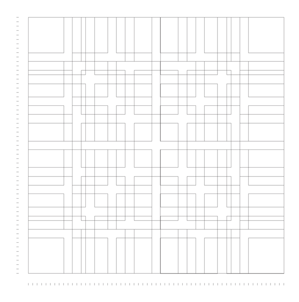Hệ thống lưới vuông này đi theo 6 cột theo chiều ngang và 6 modules theo chiều dọc, xếp chồng lên nhau bởi những 1, 2, 3 và 4 đơn vị. Theo chiều ngang, hệ thống lưới được thiết lập theo đơn vị 10pt, định hình khoảng cách của dòng từ đường cơ bản này đến đường cơ bản khác.