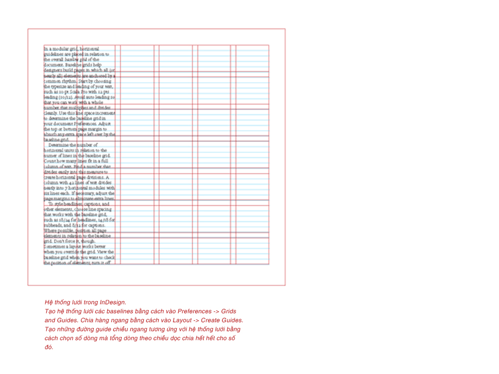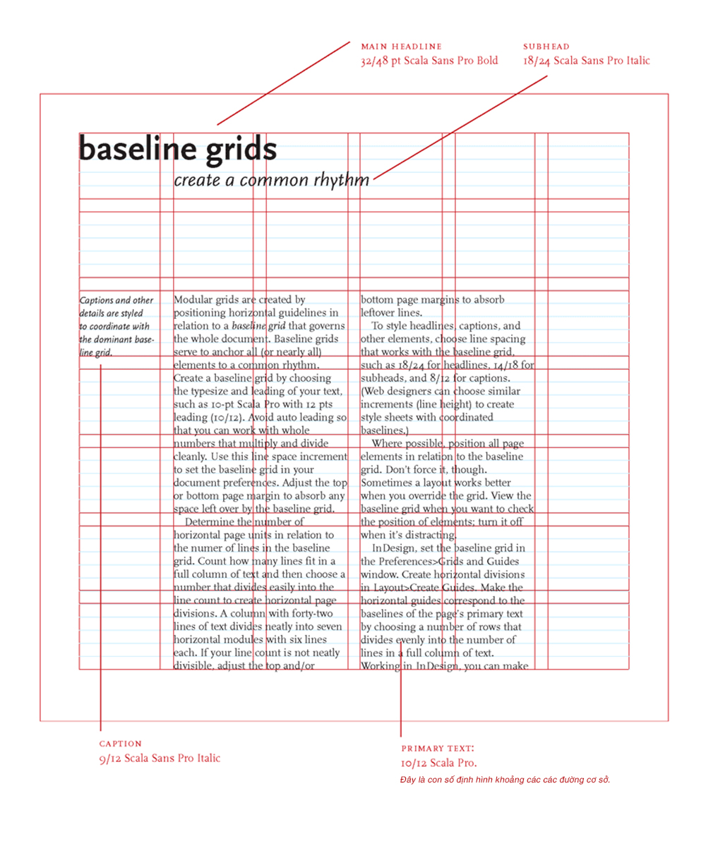 Đây là một dạng Lưới Module được tạo canh theo các đường cơ sở. Lưới đường cơ sở phục vụ cho việc định hình hầu như toàn bộ các thành phần thiết kế theo một nhịp điệu chung. Để tạo một Lưới đường cơ sở, bạn bắt đầu bằng việc lựa chọn kích cỡ chữ và cách dòng, ví dụ như 10pt Scala Pro với cách dòng 12pt (10/12). Tránh việc tự động cách dòng để bạn có thể chủ động chọn những con số tròn, có thể nhân và chia hết dễ dàng. Từ những con số này, bạn sẽ tạo nên hệ thống lưới cho toàn bộ ấn phẩm của mình.