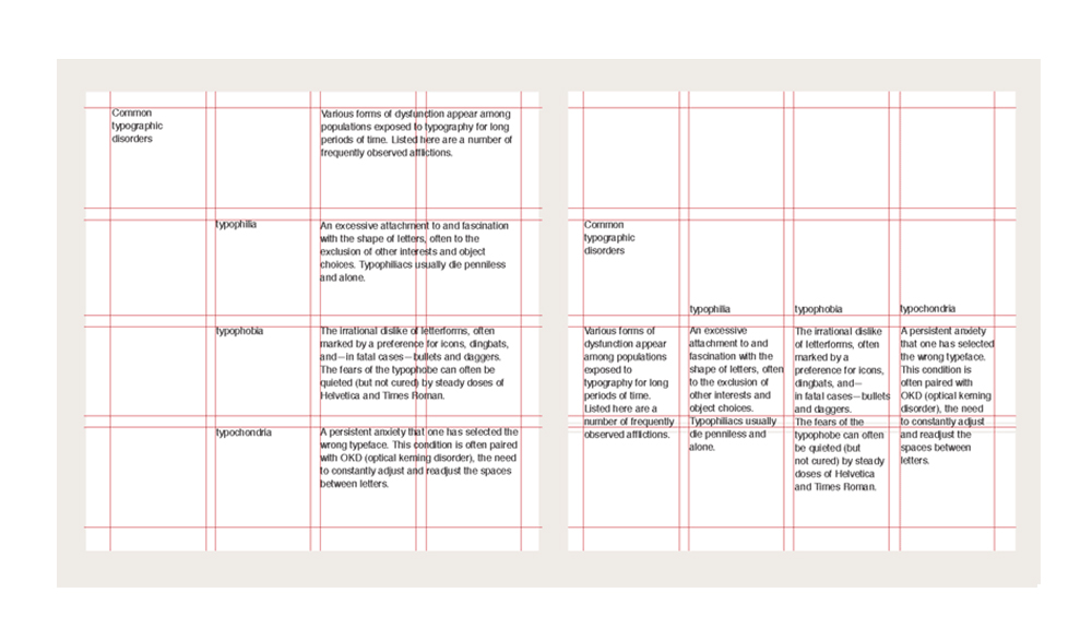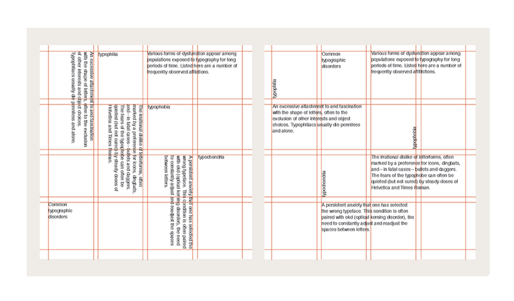 Sử dụng Modular grid để sắp xếp chữ theo tất cả các cách bạn có thể nghĩ ra. Sử dụng chỉ một kích thước chữ và chỉ canh trái, bạn sẽ tạo nên một các trúc typographic độc bản bằng một bố cục không gian. Để project phức tạp hơn, hãy bắt đầu thêm những biến số khác nhau cho bề ngang, kích thước và canh lề.