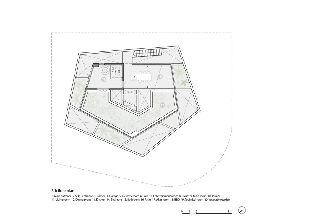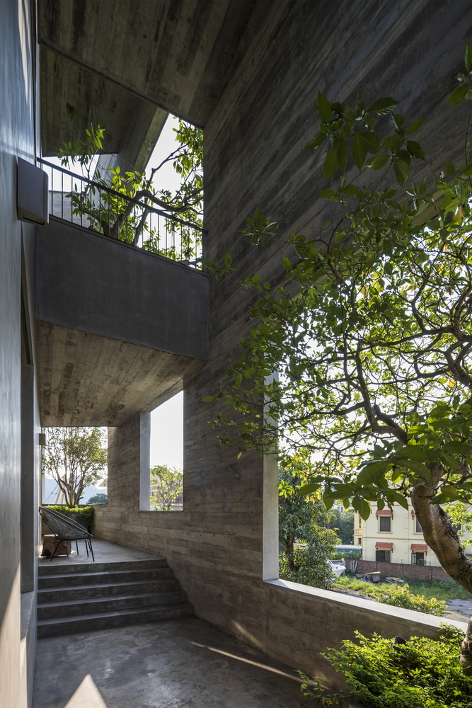 Mọi không gian bán ngoại thất trong ngôi nhà đều được kết nối với cầu thang xoắn ốc chính. Có một chuỗi không gian từ bên ngoài vào bên trong, từ mặt đất đến mái nhà, và thông qua không gian bán ngoại thất với một cửa sổ lớn và nhiều cây xanh để cảm nhận cảnh quan thiên nhiên phong phú và cảnh quan thành phố từ các góc độ khác nhau.