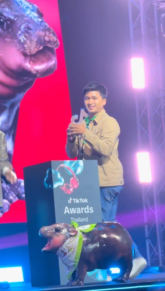 Tại lễ trao giải TikTok Thái Lan, P’Benz đã đại diện Moo Deng nhận giải thưởng, cùng với một bức tượng mô phỏng hà mã lùn đáng yêu.