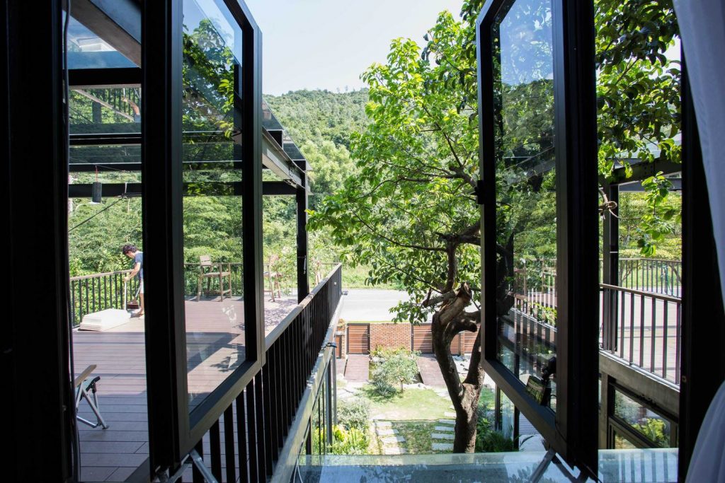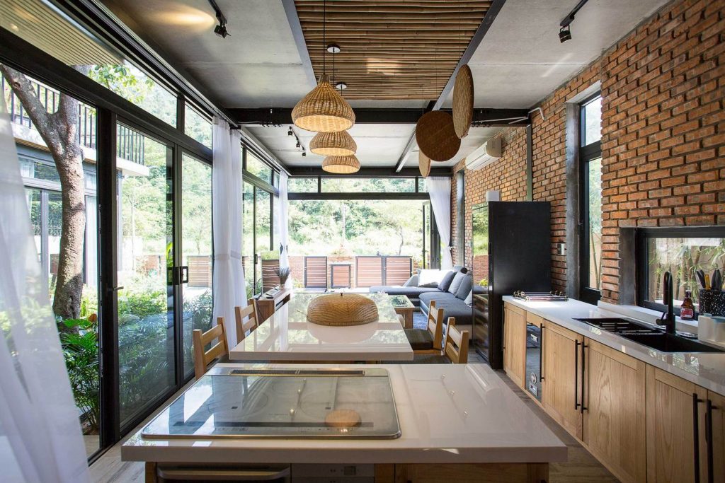 Tầng trệt: Gồm phòng khách, phòng bếp và phòng ngủ, tất cả đều được kết nối với khu sân vườn rộng rãi, có thể tiếp cận thông qua cửa kính trượt. Với giải pháp này, bầu không khí sẽ cảm thấy rộng rãi và gần gũi với thiên nhiên hơn. Khi cửa kính được mở hết, khu vực trong nhà và khu sân vườn hòa quyện vào nhau như một, cho phép bạn hòa mình vào khí hậu núi rừng.