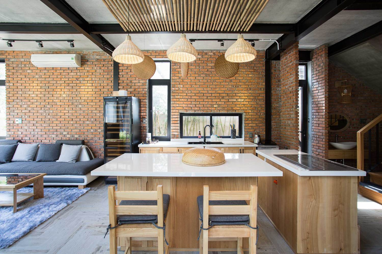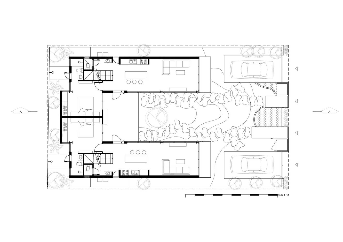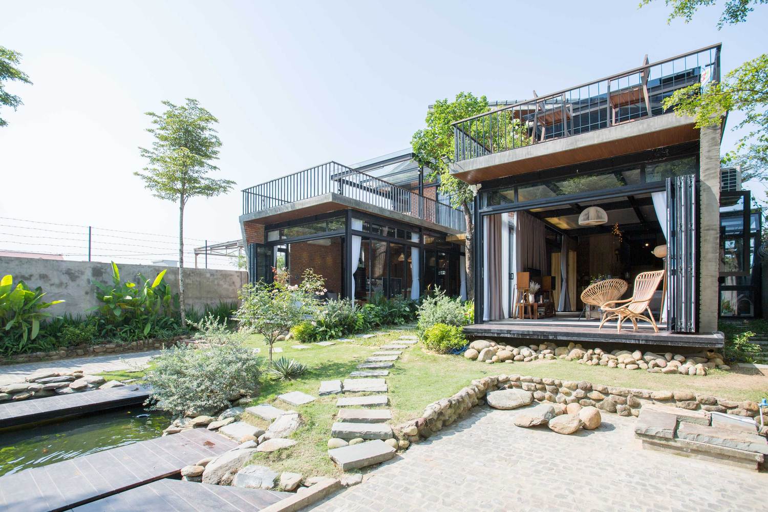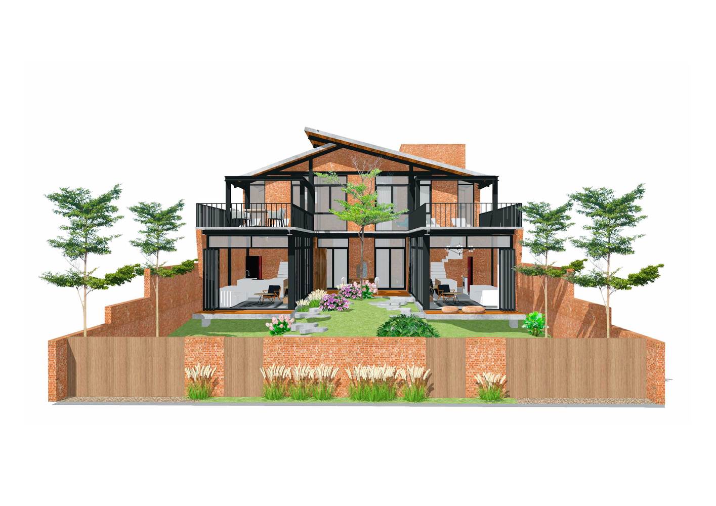 Thiết kế sử dụng chủ yếu là thép và gạch thô. Ngôi nhà được chia thành hai khu vực khác nhau, có chức năng và tiện nghi tương tự nhau, hoàn toàn tách biệt, đối xứng qua một khu vườn ở giữa. Sân vườn đóng vai trò là không gian trung gian giữa hai nhà đồng thời là cửa chính ra vào; Trong khi đó, mặt ngoài của toàn bộ tòa nhà tạo ra ảo giác về một ngôi nhà duy nhất.
