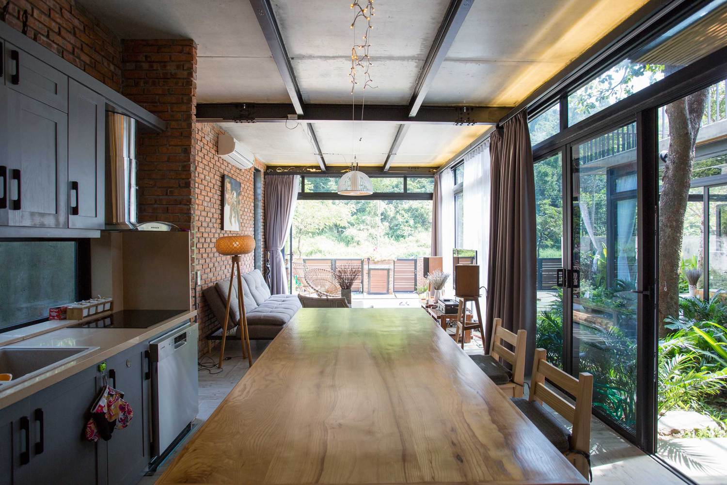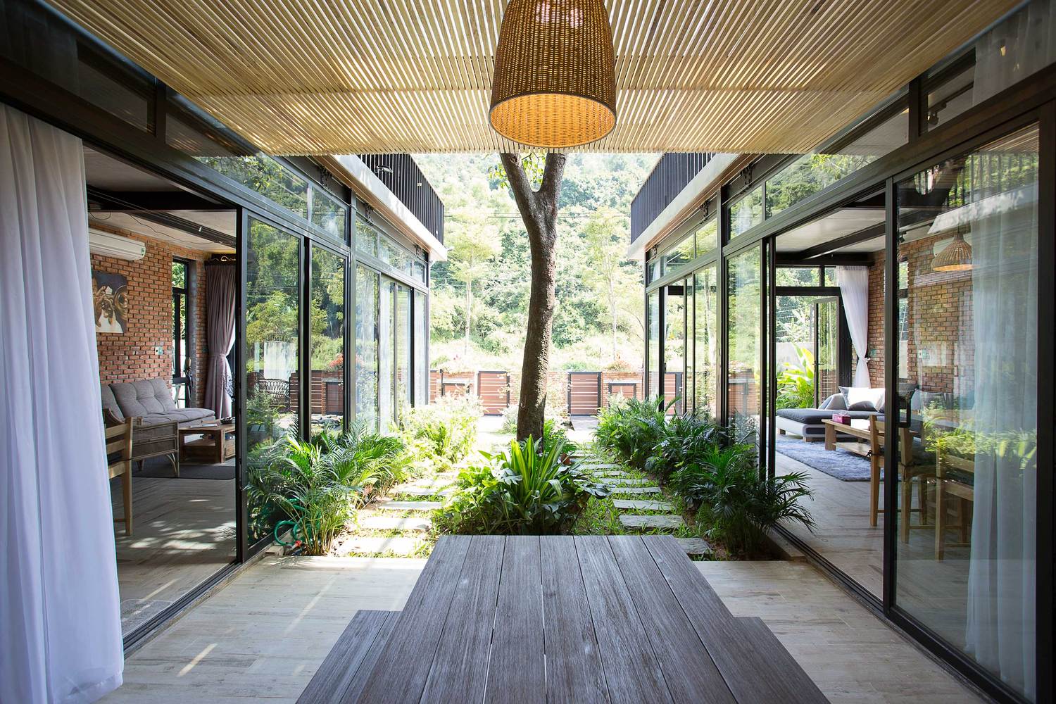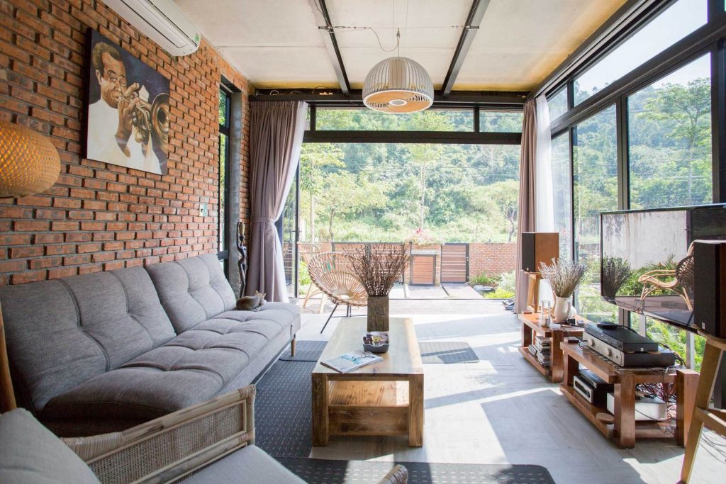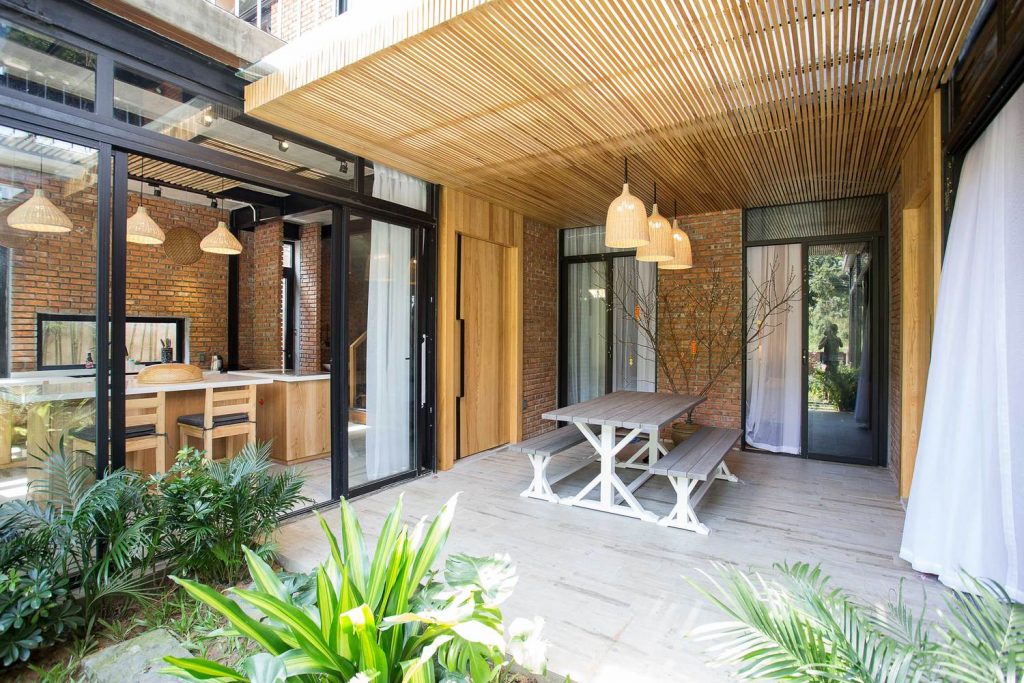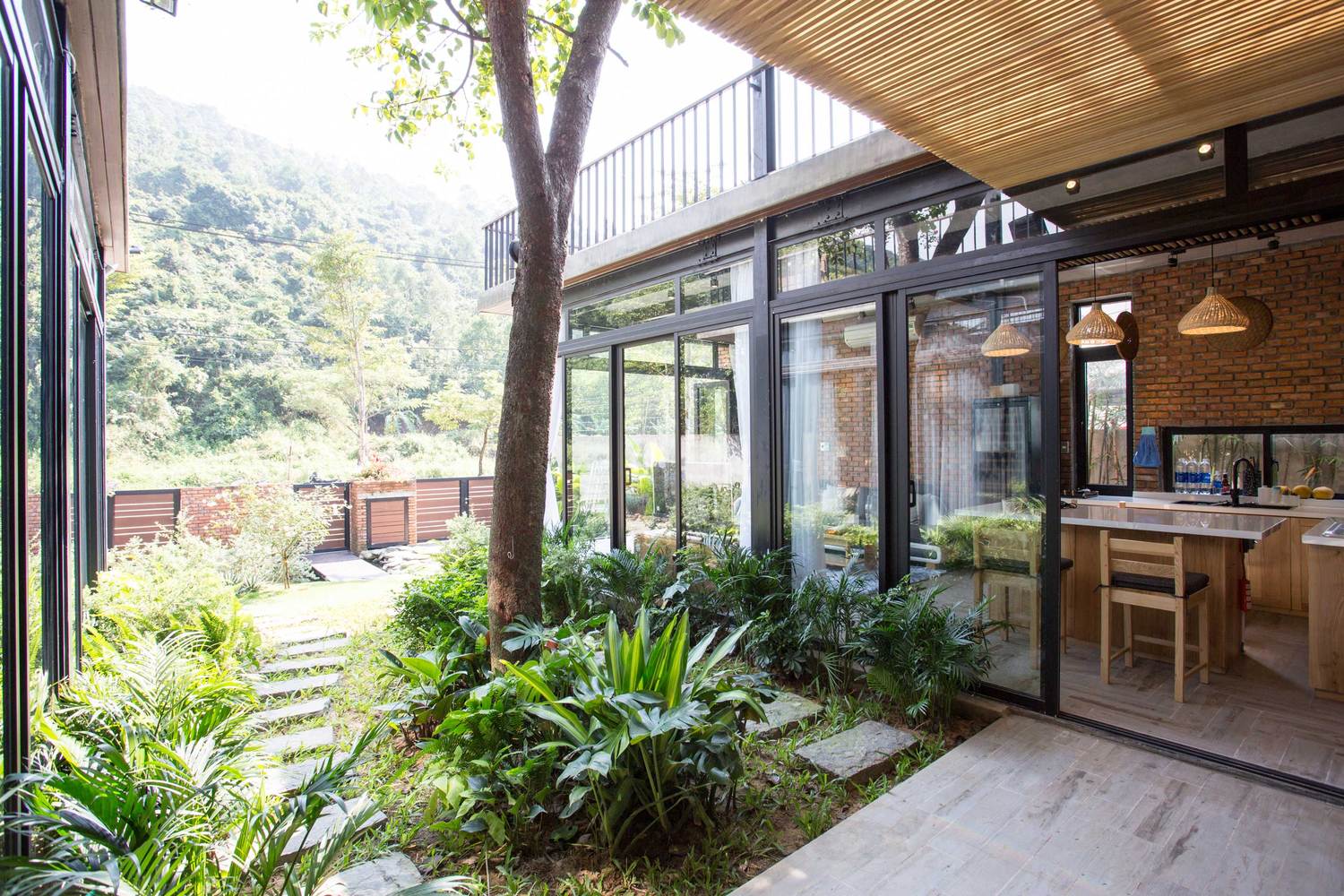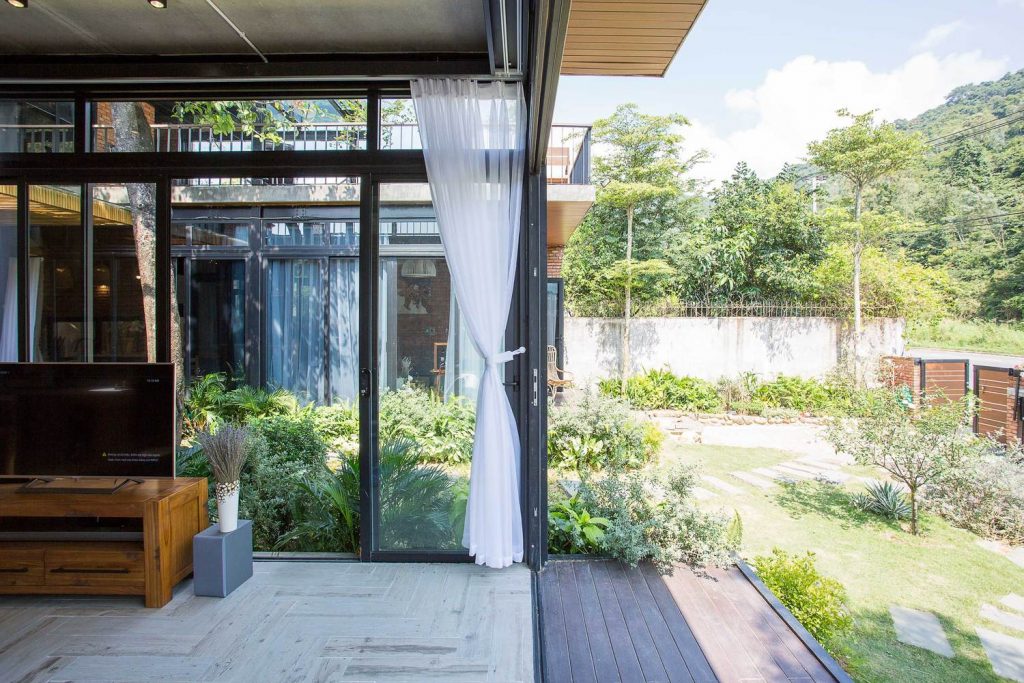 Tầng trệt: Gồm phòng khách, phòng bếp và phòng ngủ, tất cả đều được kết nối với khu sân vườn rộng rãi, có thể tiếp cận thông qua cửa kính trượt. Với giải pháp này, bầu không khí sẽ cảm thấy rộng rãi và gần gũi với thiên nhiên hơn. Khi cửa kính được mở hết, khu vực trong nhà và khu sân vườn hòa quyện vào nhau như một, cho phép bạn hòa mình vào khí hậu núi rừng.