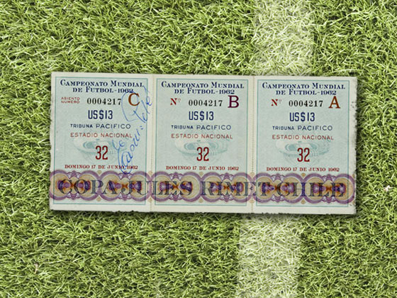 Tấm vé World Cup năm 1982 được nước chủ nhà Tây Ban Nha thiết kế màu sắc biểu trưng cho lá cờ của họ. Chúng ta có thể thấy sự xuất hiện của hình ảnh chiếc đồng hồ điện tử và đây cũng là lần đầu tiên giá vé được in thẳng trên mẫu thiết kế.