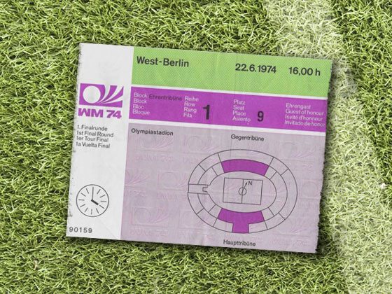Cũng như năm 1970, tấm vé năm 1974 cũng có các logo sắc màu. Được thiết kế với phong cách gần gũi, tấm vé bao gồm chiếc đồng hồ cho thấy thời gian bắt đầu và hình ảnh hiển thị chỗ ngồi với số ghế tương ứng trên khán đài, điều này làm việc xác định được chỗ ngồi của bạn trở nên dễ dàng hơn.
