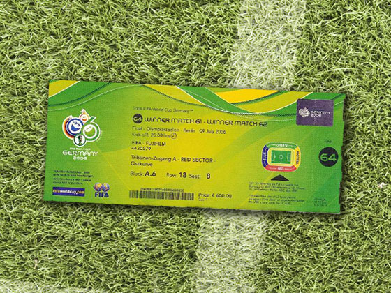 Tương tự với mẫu thiết kế năm 2002, tấm vé năm 2006 có các tính năng tùy chỉnh phông chữ được sử dụng trong logo, địa điểm và tên đội bóng. Mỗi vé chứa một con số được in duy nhất trên phần cuống và tất cả các nội dung còn lại đều được đặt ở giữa tấm vé.