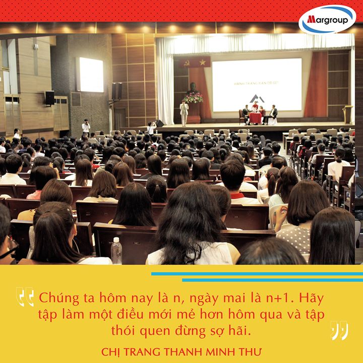 Tiếp sau đó với phần chia sẻ của mình, chị Trang Thanh Minh Thư – Trưởng bộ phận Event nhóm Margroup nhiệm kỳ 8, hiện nay là Trưởng phòng Marketing của TTC Land đã đốt cháy ngọn lửa đam mê, nhiệt huyết của hơn 1000 sinh viên có mặt tại hội trường A116. Với quan điểm hãy để thời sinh viên của bạn năng động từ giây đầu tiên, mỗi ngày trôi qua là n+1, chị đã thật sự đánh thức khả năng chinh phục tiềm tàng trong mỗi cá nhân. Chị Thư còn chia sẻ thêm: “Làm một điều mới trong ngày mới, thử những điều chưa bao giờ thử, và hãy dám thất bại 1000 lần trước khi biết thế nào là thành công. Những điều đó giúp các em trưởng thành lên từng ngày.”